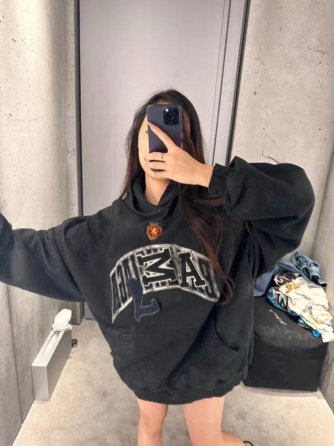 Balenciaga/巴黎世家 23Fw 曼联联名水洗做旧连帽卫衣 定染精纺平纹面料、包芯刺绣、章仔毛巾刺绣、做旧洗水、岩磨破洞、赃污锈色效果、大廓形版型、全套辅料配备,采用26支双纱纱平纹大卫衣布,鱼纹底480克重精梳棉,布匹洗水后开裁,杜绝掉毛现象,下垂感和面料硬挺度效果非常好,螺纹引进的32针高端纺织,70D超细弹力缝线,接近无感的走线,舒适贴合身形,大型徽标采用进口定做绣线,具有光泽感的丝...