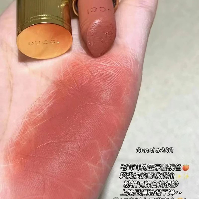 实在太太太太太太粉嫩了!!!😍 Gucci绒雾系列的金管208 粉嫩到心都融化!!! 甜到心底的蜜桃奶油色🍑 显白显嫩,当腮红更是绝了! 上嘴妥妥嫩到掐出水的人间水蜜桃! (不要被官网很深的试色给骗了😂) 一直在找不需要滤镜就很蜜桃的口红,买了很多都不尽人意,要么太深、要么毁气色, 当看到这支208的时候,终于满意了!! 实际上嘴后,颜色并不像口红本身看上去那么深, 是刚刚好得蜜桃粉...