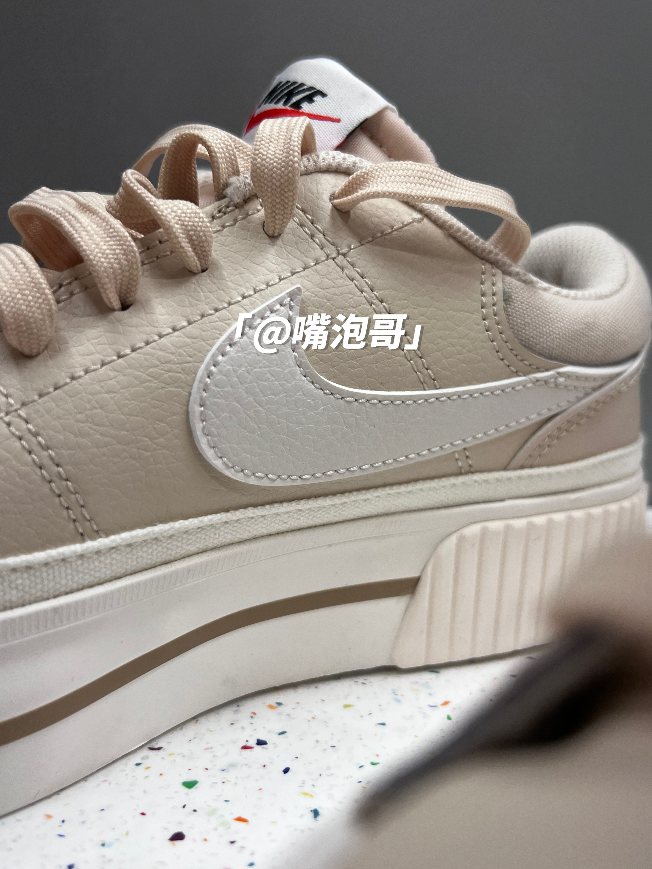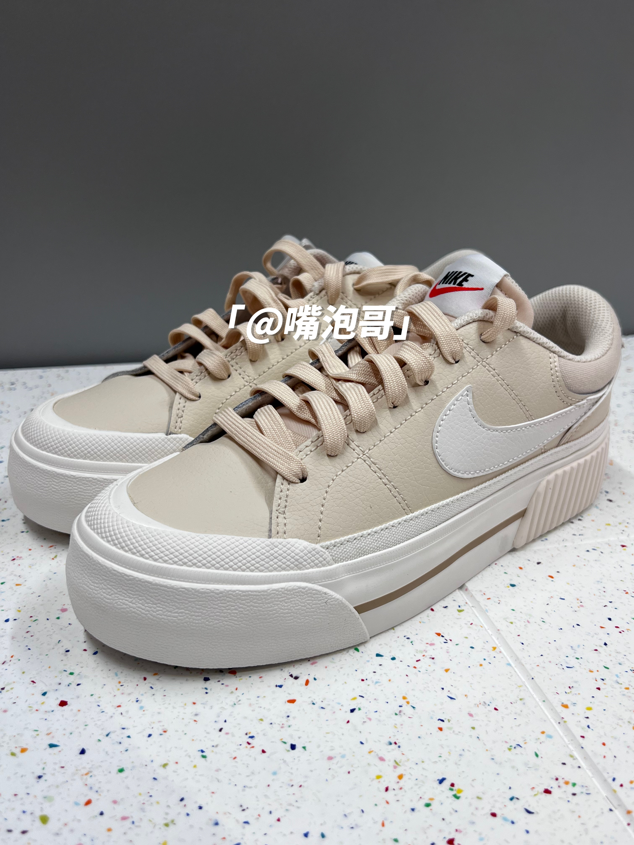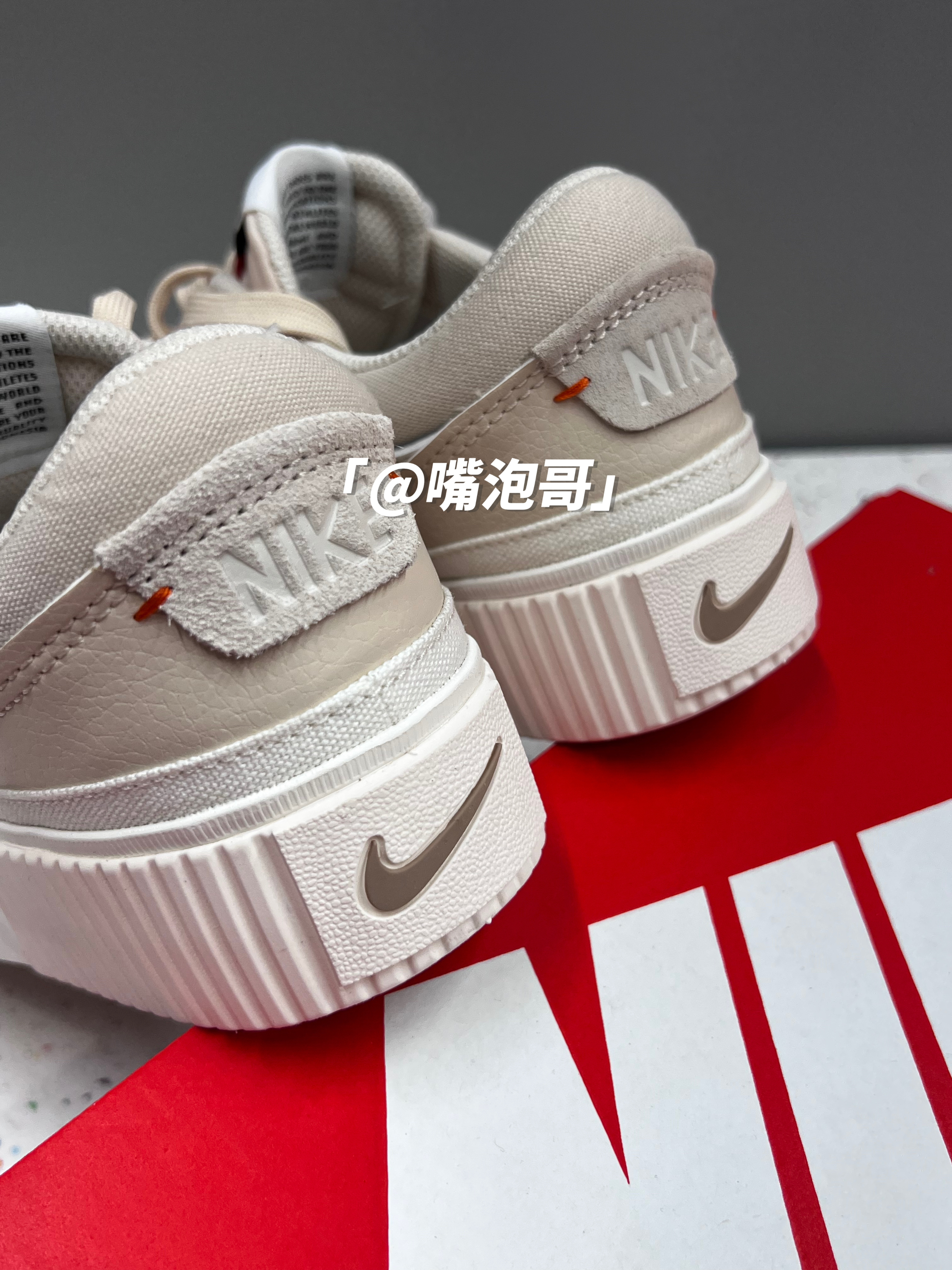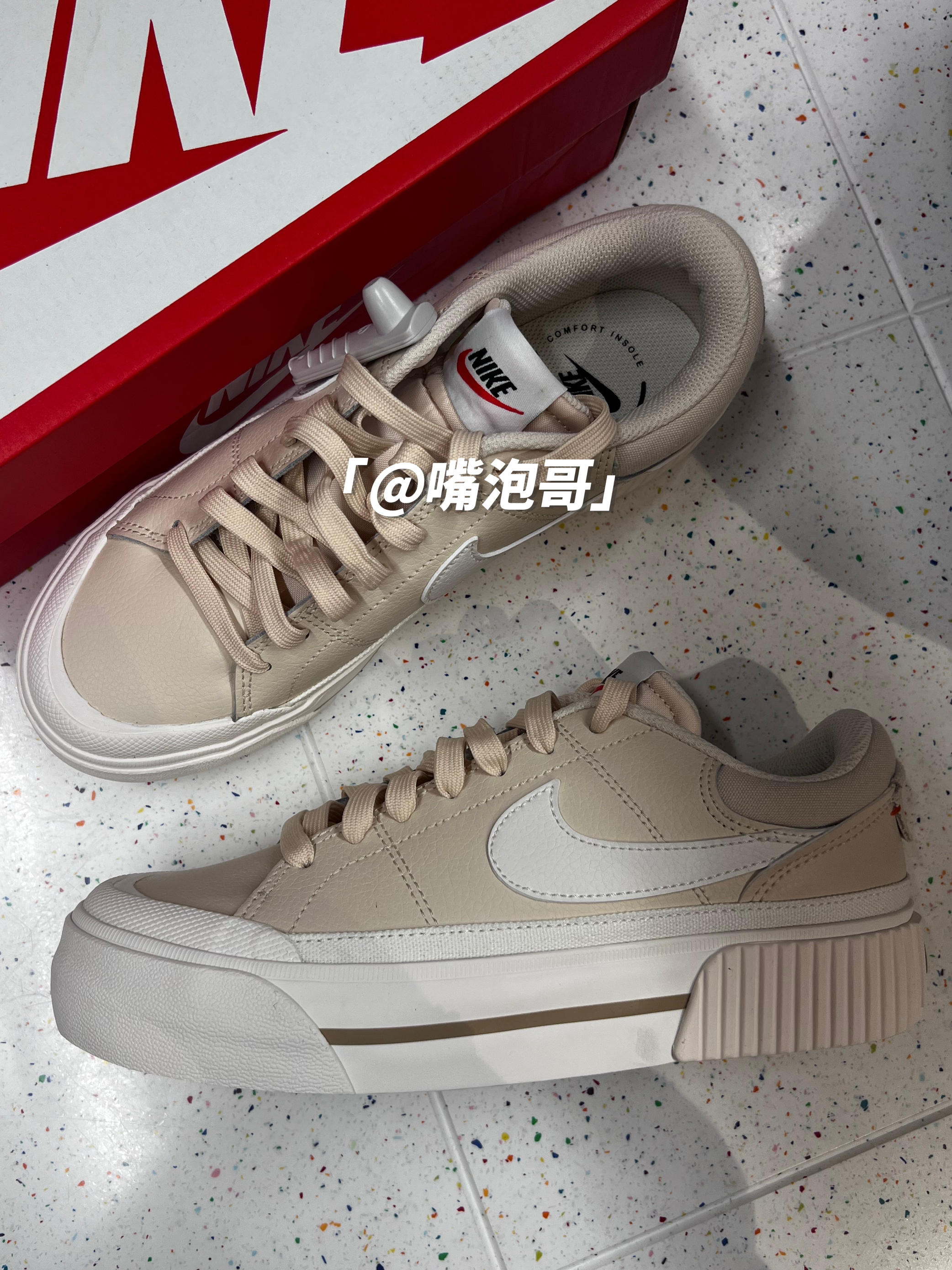👟:Court Legacy Lift 棕色 简介: 鞋款是经典的Court Legacy Lift 板鞋,整双鞋子选用了浅棕色来做为主色调,同时又运用白色、金色、红色进行点缀,使鞋子具有“小高级感”,并且中底进行加厚设计,所以具有一定增高效果。 细节: 鞋面采用了浅棕色的对皮革打造而成,皮质柔软,鞋身两侧的swoosh选用了白色皮革制成,鞋口位置加入帆布材料,并且加厚填充增加了舒适度...