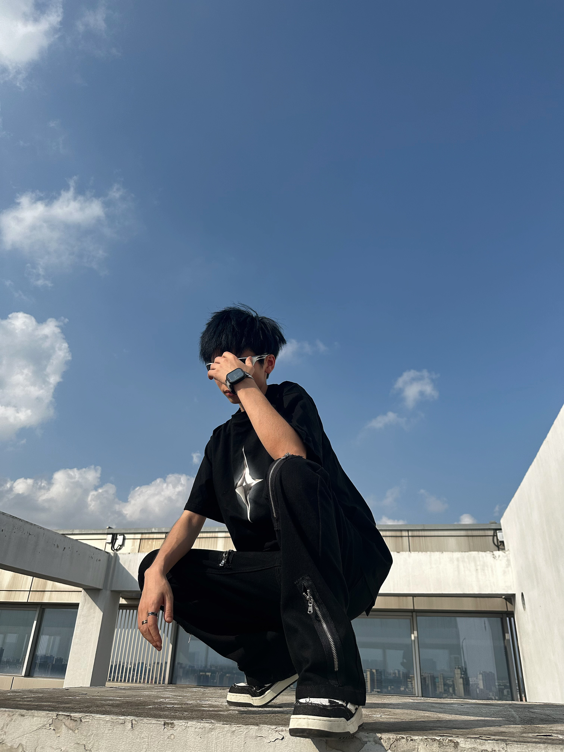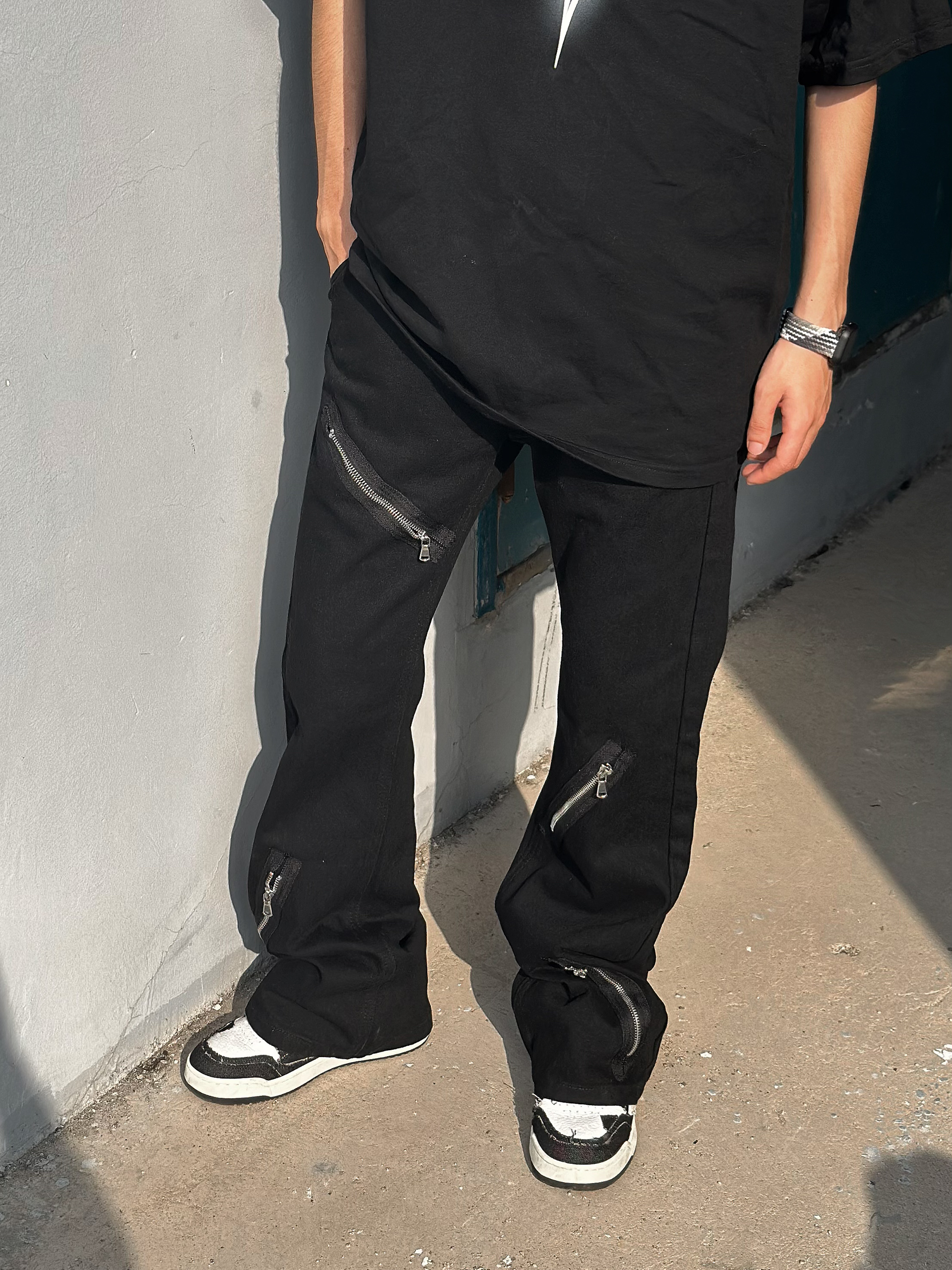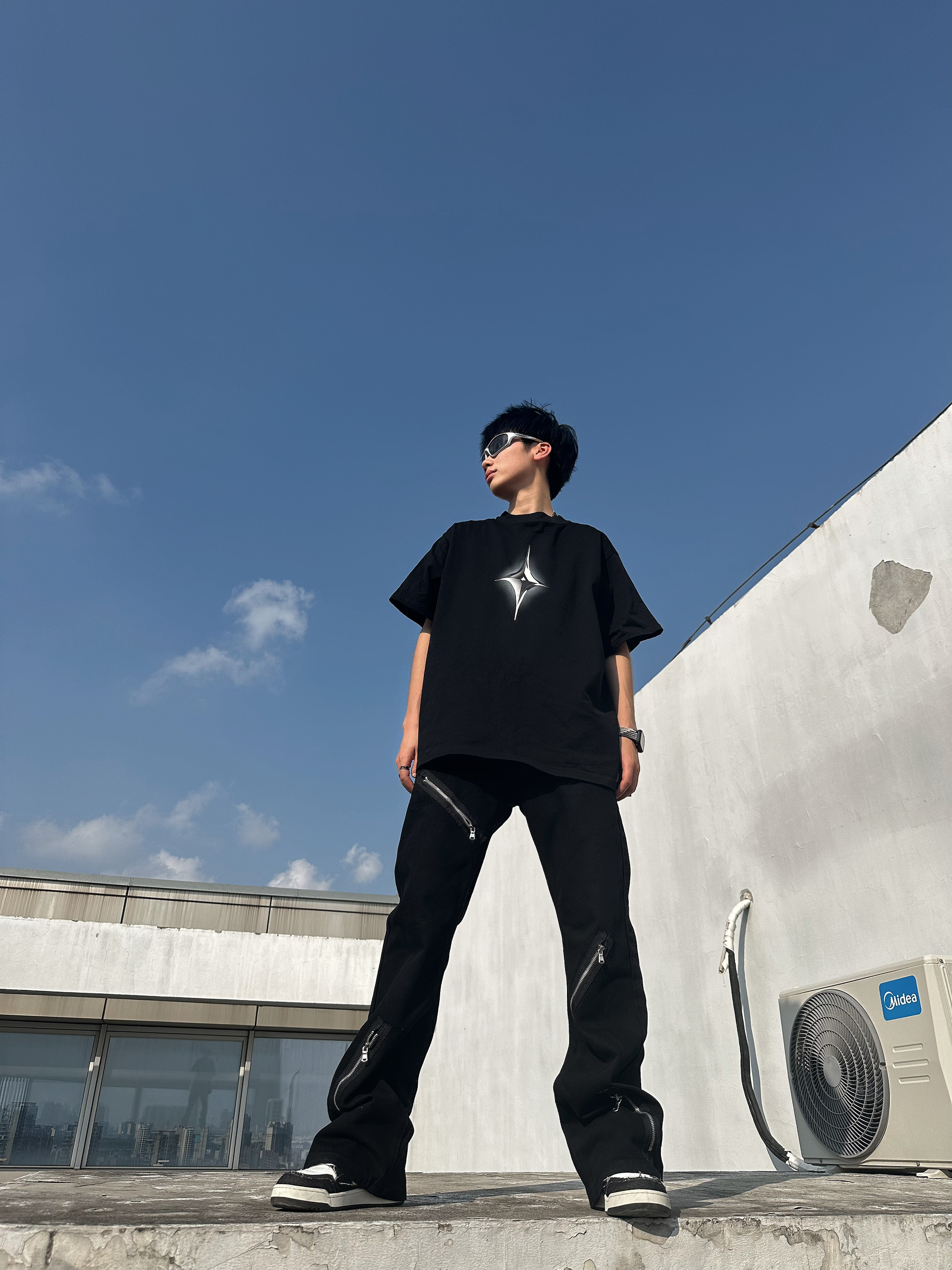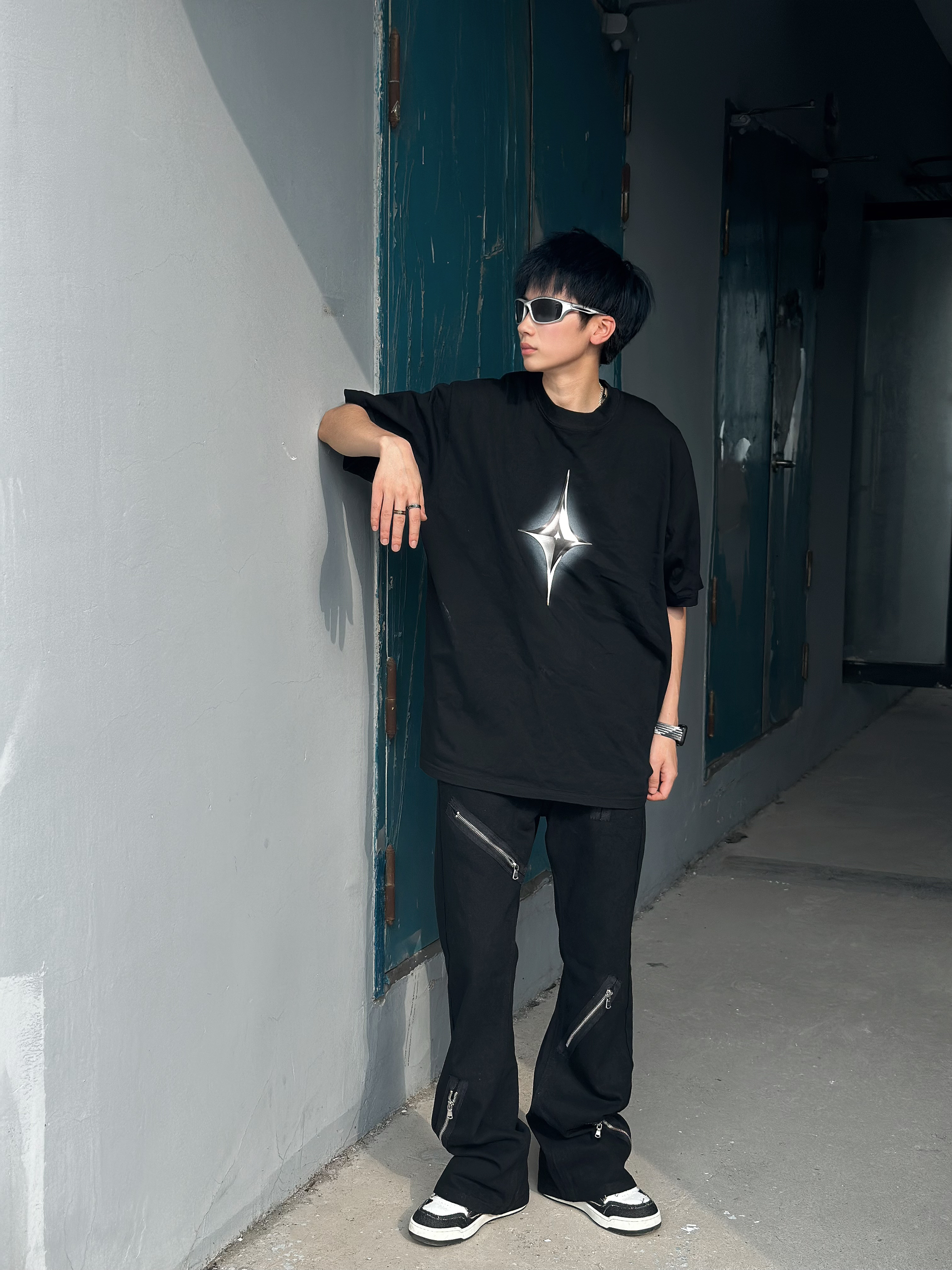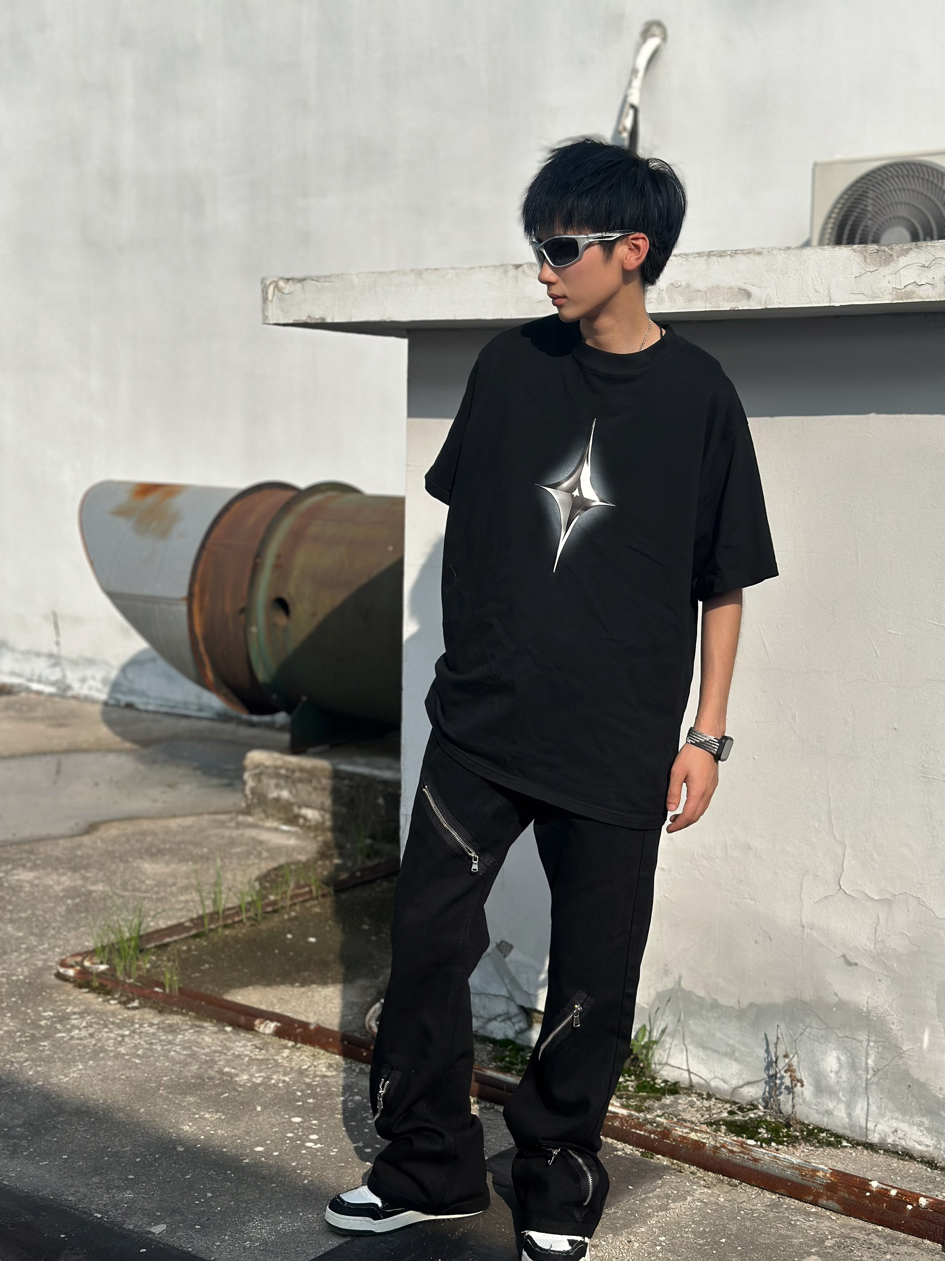 halo这里是嘎嘎的日常穿搭分享🥳 - 今天尝试一下vibe街头风 👕:简单的黑色T恤,金属风的十字星图案,非常百搭 👖:很顶的一条牛仔裤,微喇的版型,能够在鞋子上有个堆叠的效果,拉链的金属风元素上身超级帅,牛仔面料很软,穿起来也比较舒服。 👟:黑白的板鞋,破坏风的毛边设计,vibe风拉满了 👕: Lounqu 👖: Voguo Relay 👟: GOTO 尺码参考:163cm/44...