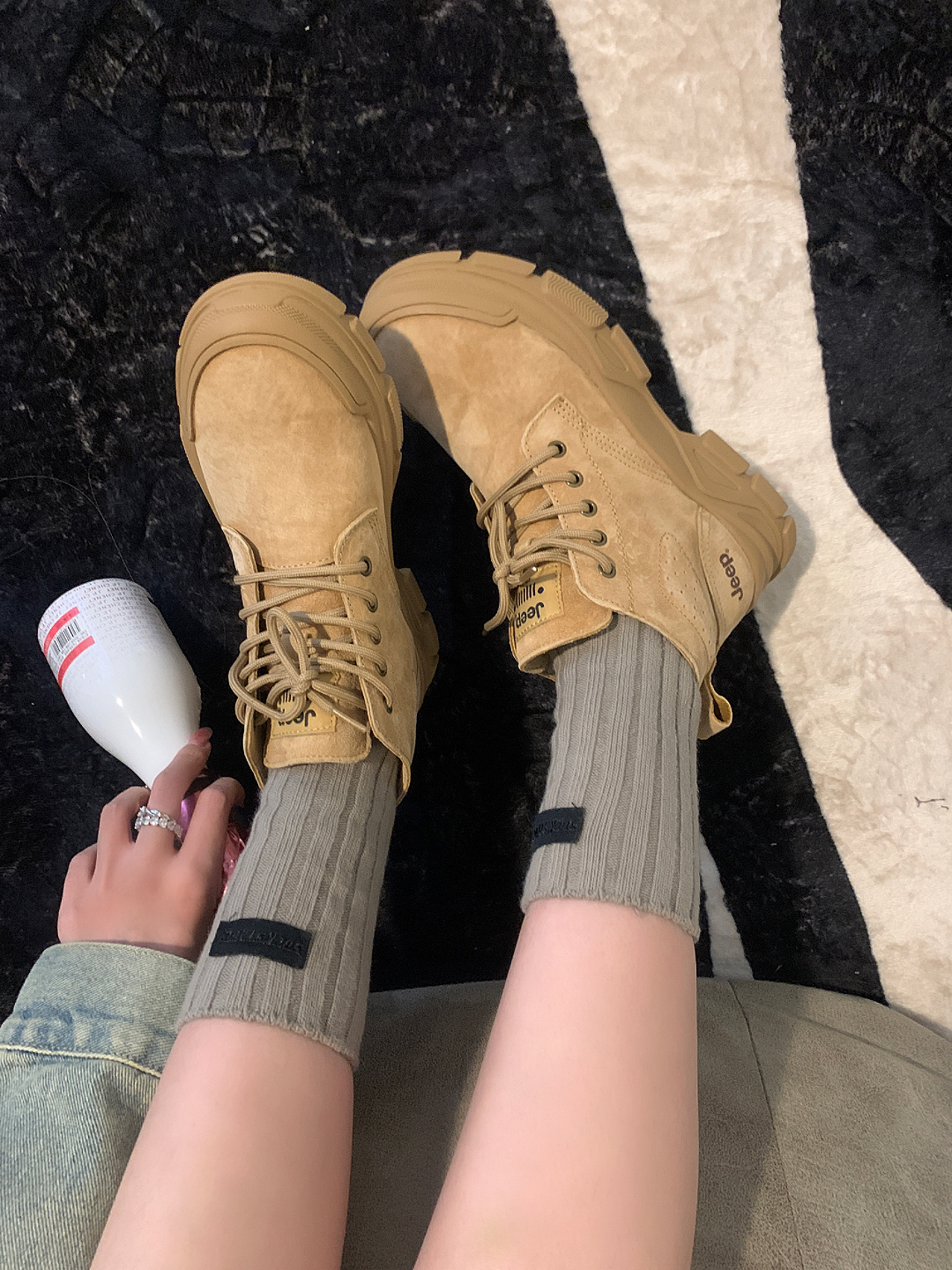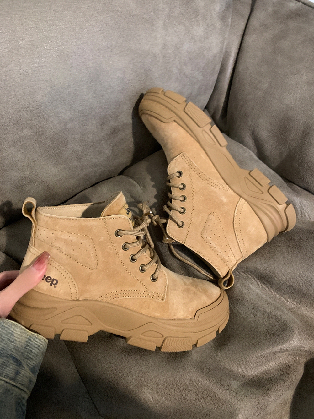 姐妹们看过来 给你们介绍一款户外马丁靴 我近期的最爱 真的好穿又好搭~~ 鞋子的做工质感真的没话说! 防水防滑 非常适合各位户外爱好者! 3-4cm的外增高 不知不觉中显腿长~~~ 上脚脚感很好 !好软好舒服! 穿一天 走一天也不累! 不仅时尚百搭 走路还特别稳! 穿上它无论是日常炸街穿还是户外运动穿都没问题!