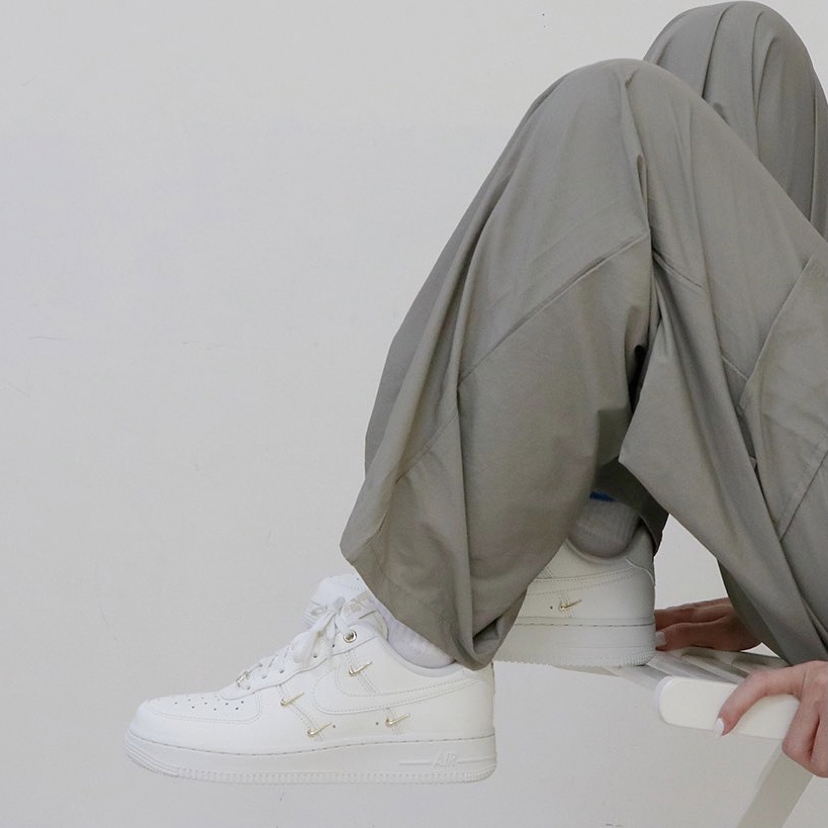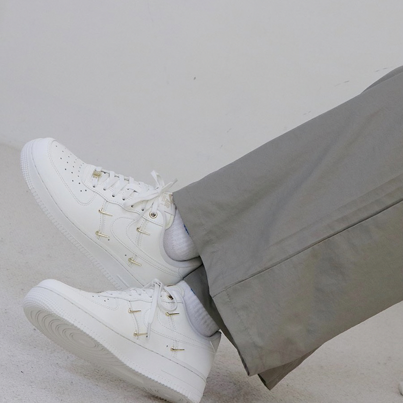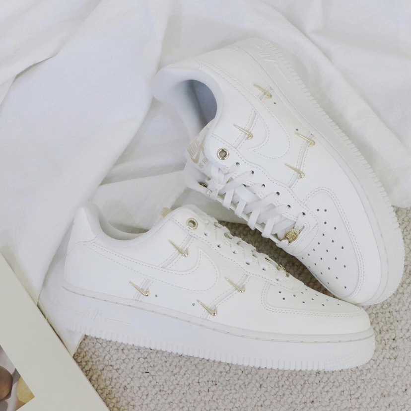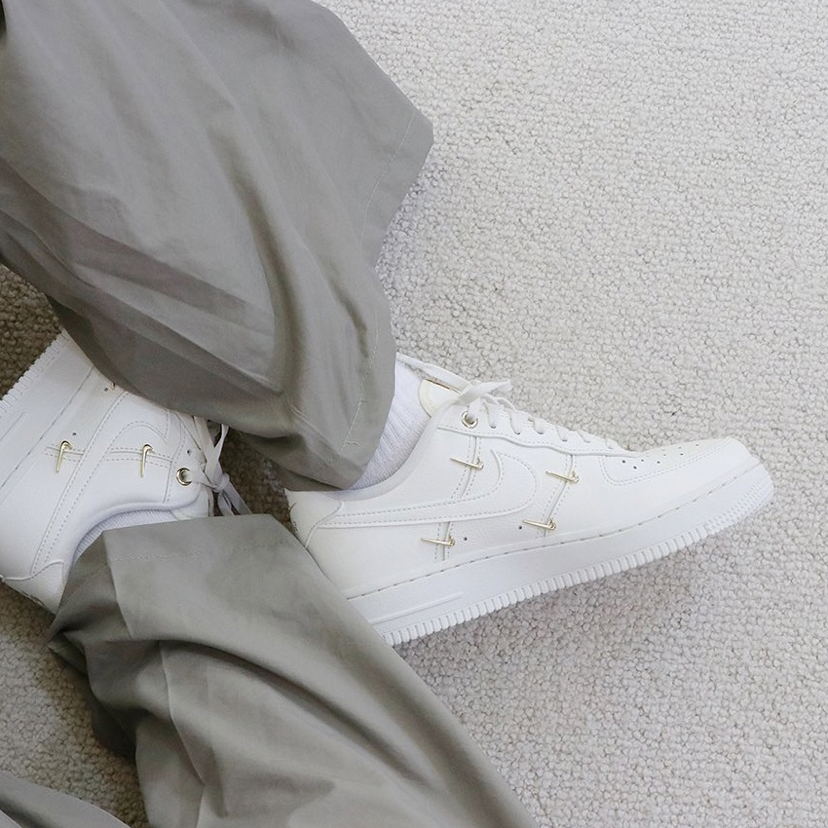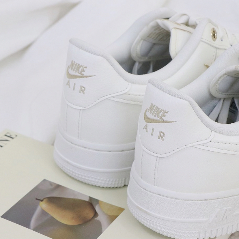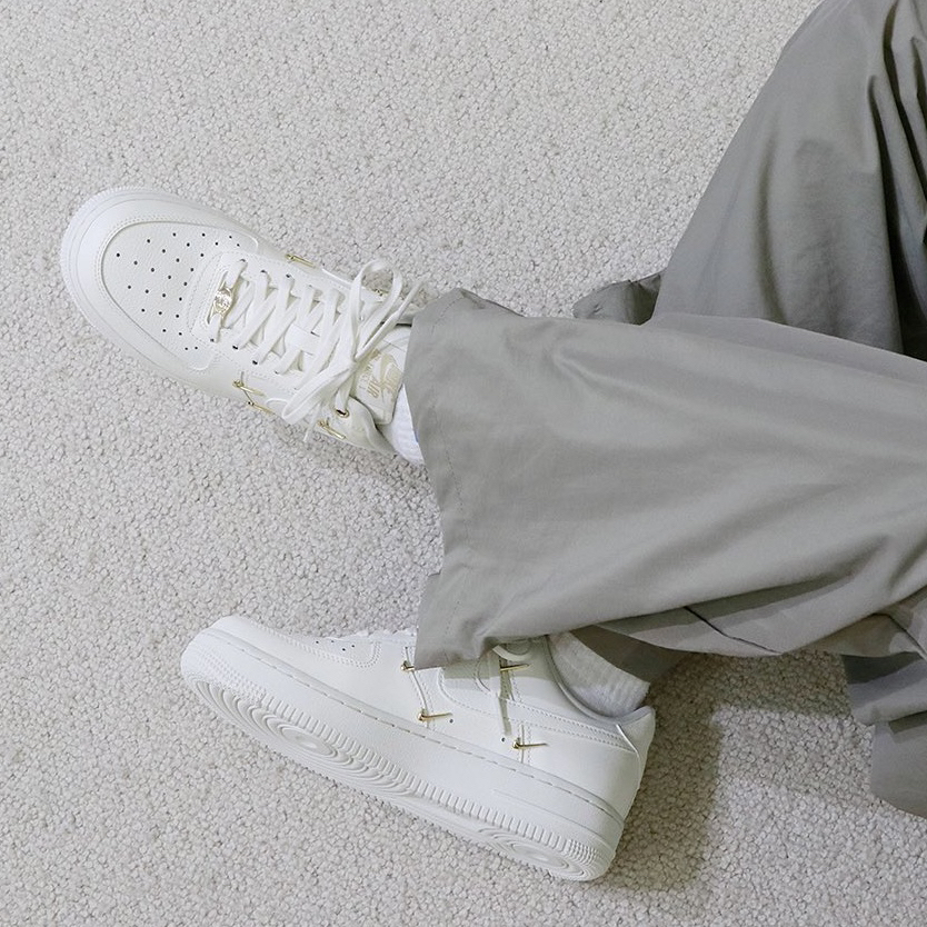 鞋名:Air Force 1 Low Mini Gold 白金 外观及细节: 这双鞋子从外观设计上是与普通的空军一号没有区别的,运用基础百搭的白色空军一号作为设计鞋型,但又没有加入复杂的设计,依旧保留了最为百搭的样式及配色,但在这身两侧装饰了多个金色的迷你swoosh,使鞋子很有质感,并且又有很高的辨识度,在穿搭中也吸引眼球,真正做到了简约不简单。