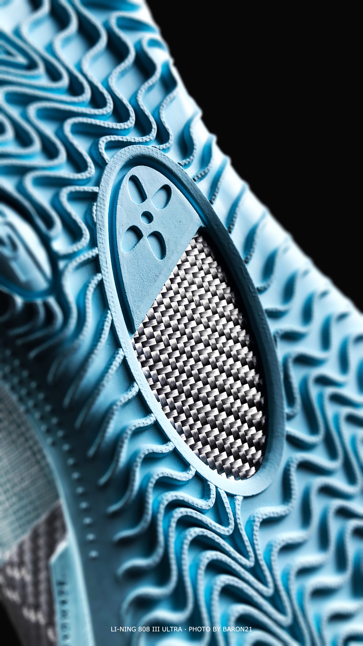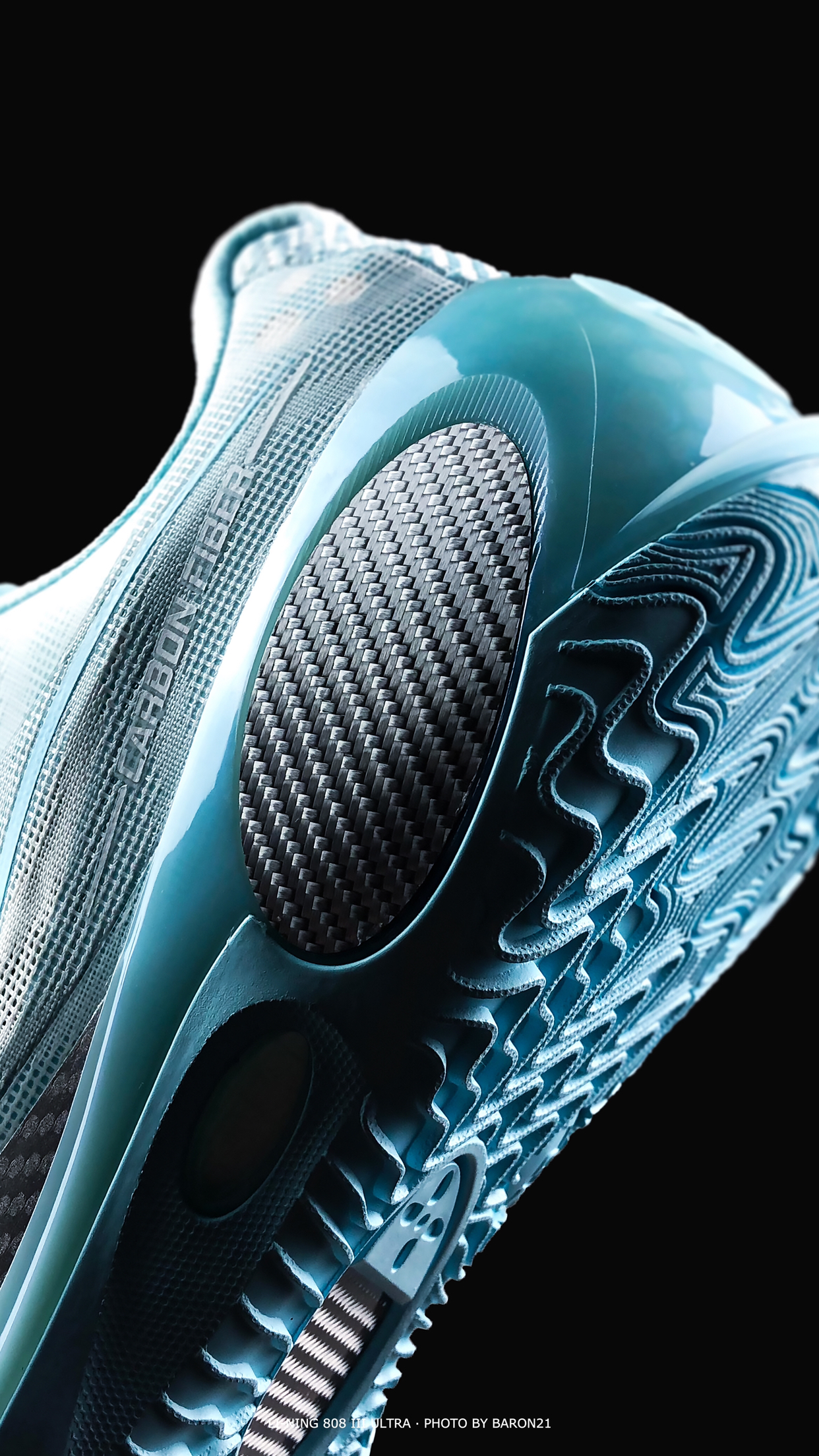 808 III ULTRA延续了上一代的设计风格,外观依旧特别帅气。中底系统还是可抽离式的䨻科技中底,但在䨻下面增加了一块TPU。拿在手里感觉3代更加轻一点,鞋帮高度也变低了(取消了袜套内靴)。
