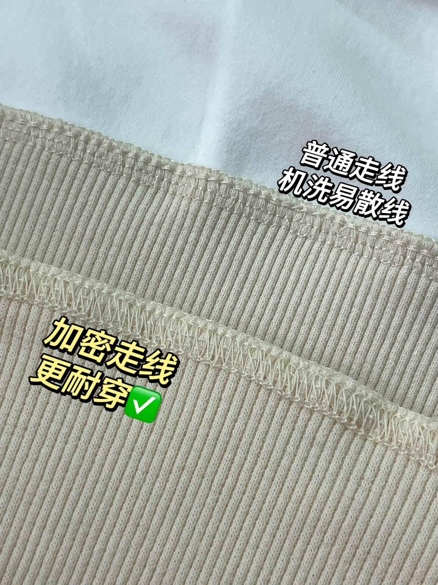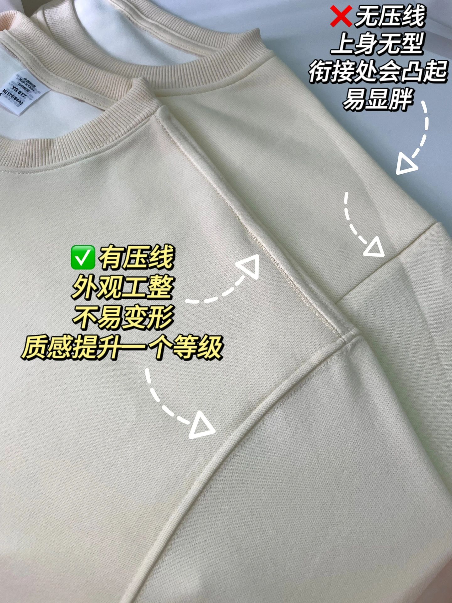 走线分一本针,二本针,三本针,针数越高越牢固,领口和肩部选通肩压条,不显胖,还能固定防止拉伸变形。