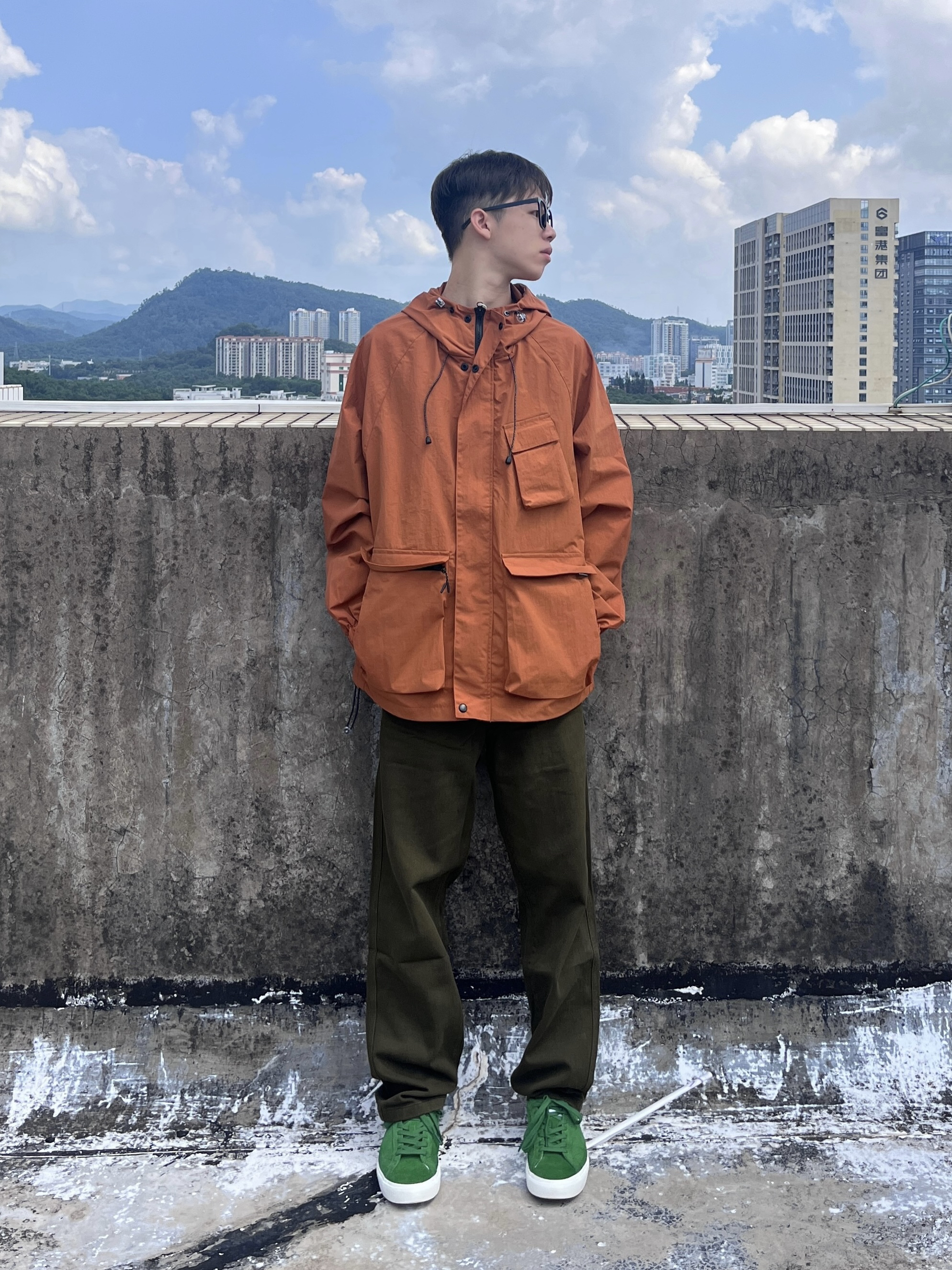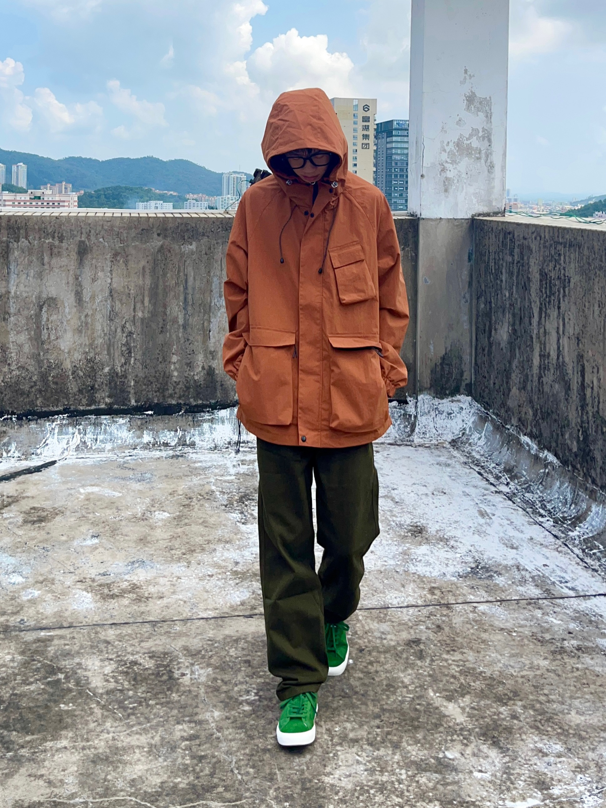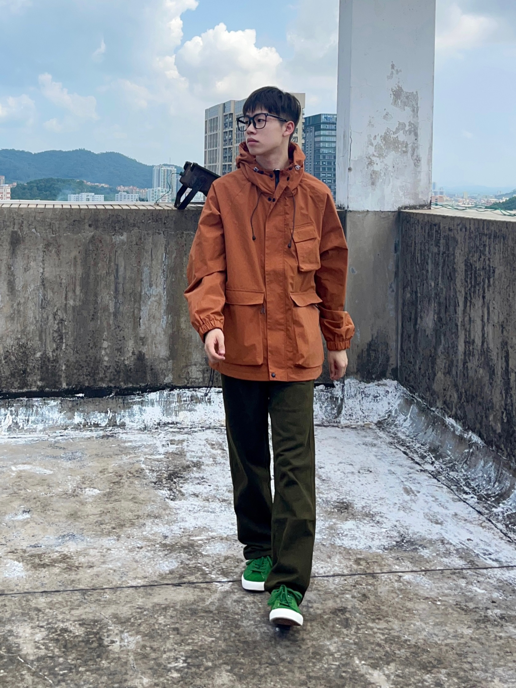 今天带来的是国庆冲锋衣穿搭分享 衣服是红棕色的冲锋夹克 多口袋简约设计 机能风拉满 面料防风防水 很适合户外出行 搭配军绿色直筒工装裤 版型宽松舒适 以及上脚一双绿色百搭板鞋点缀 一套搭配下来 非常适合国庆出游户外穿搭