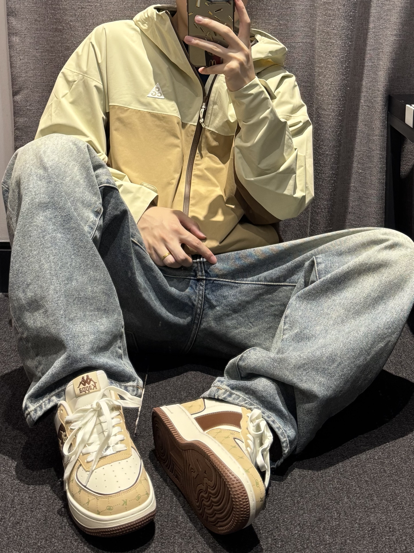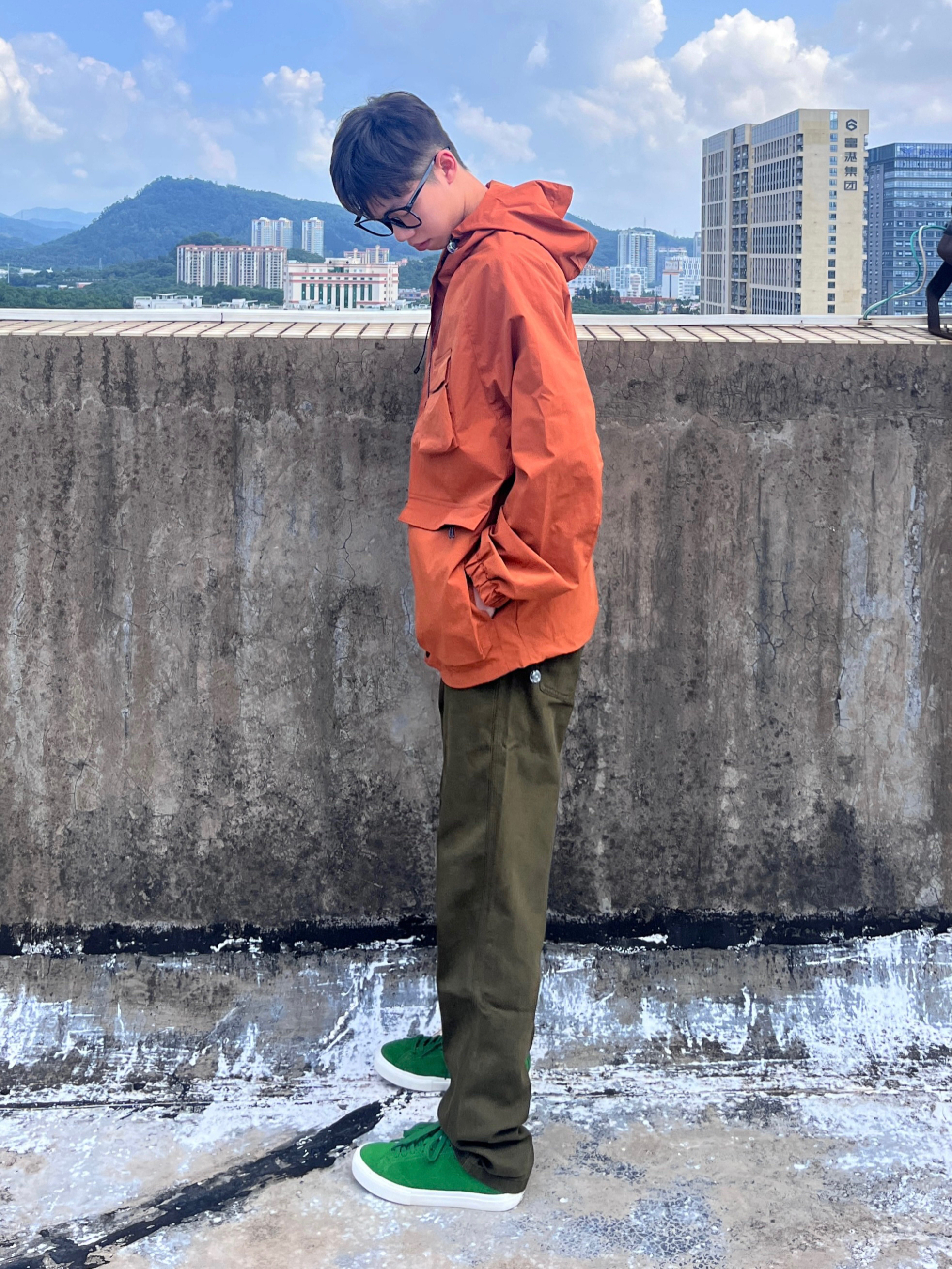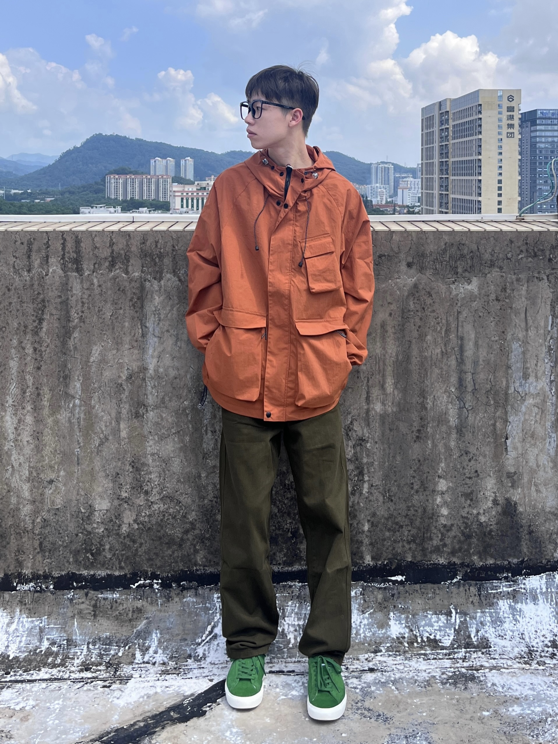 今天带来的是国庆冲锋衣穿搭分享 衣服是红棕色的冲锋夹克 多口袋简约设计 机能风拉满 面料防风防水 很适合户外出行 搭配军绿色直筒工装裤 版型宽松舒适 以及上脚一双绿色百搭板鞋点缀 一套搭配下来 非常适合国庆出游户外穿搭
