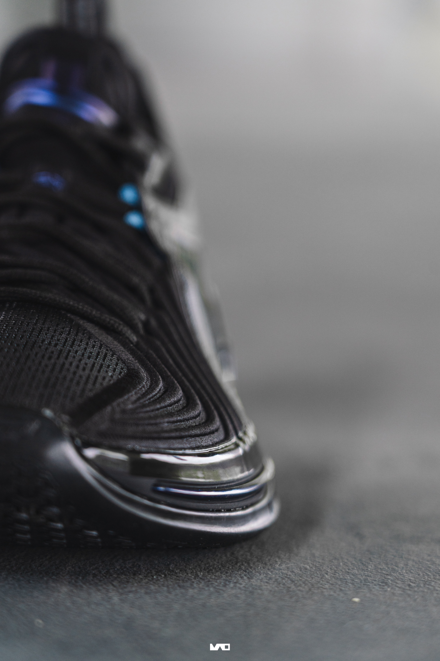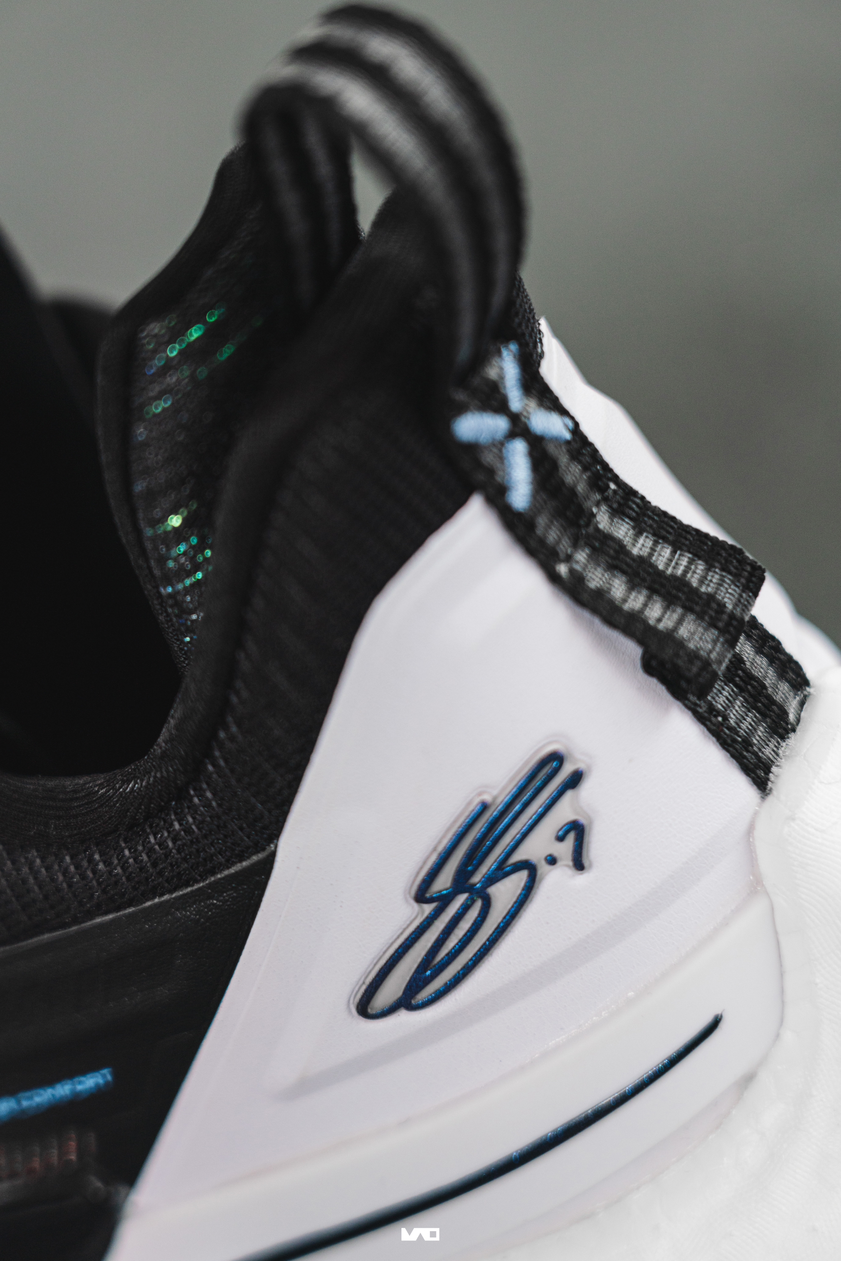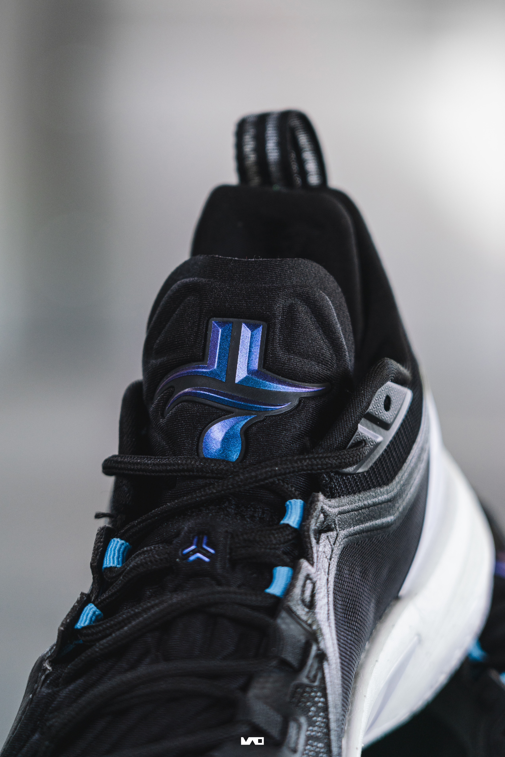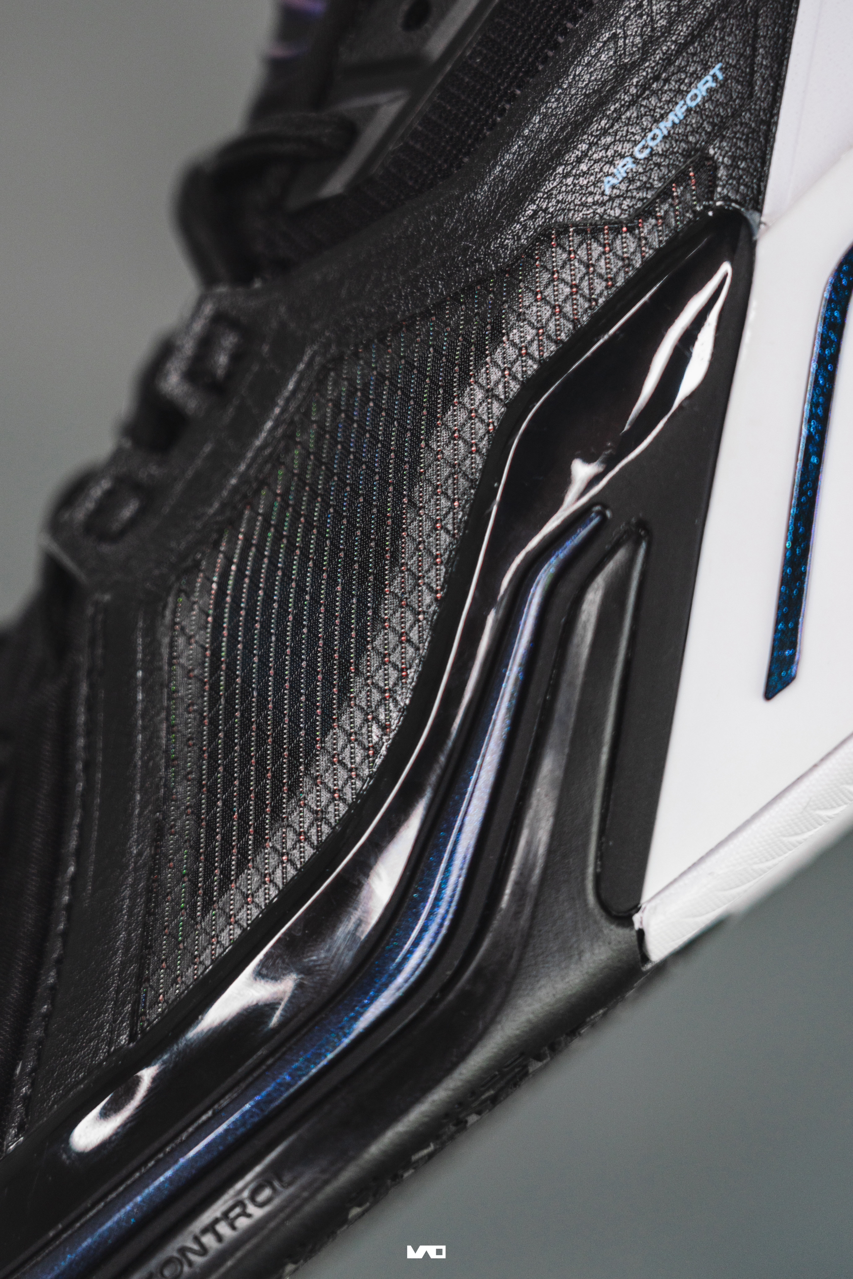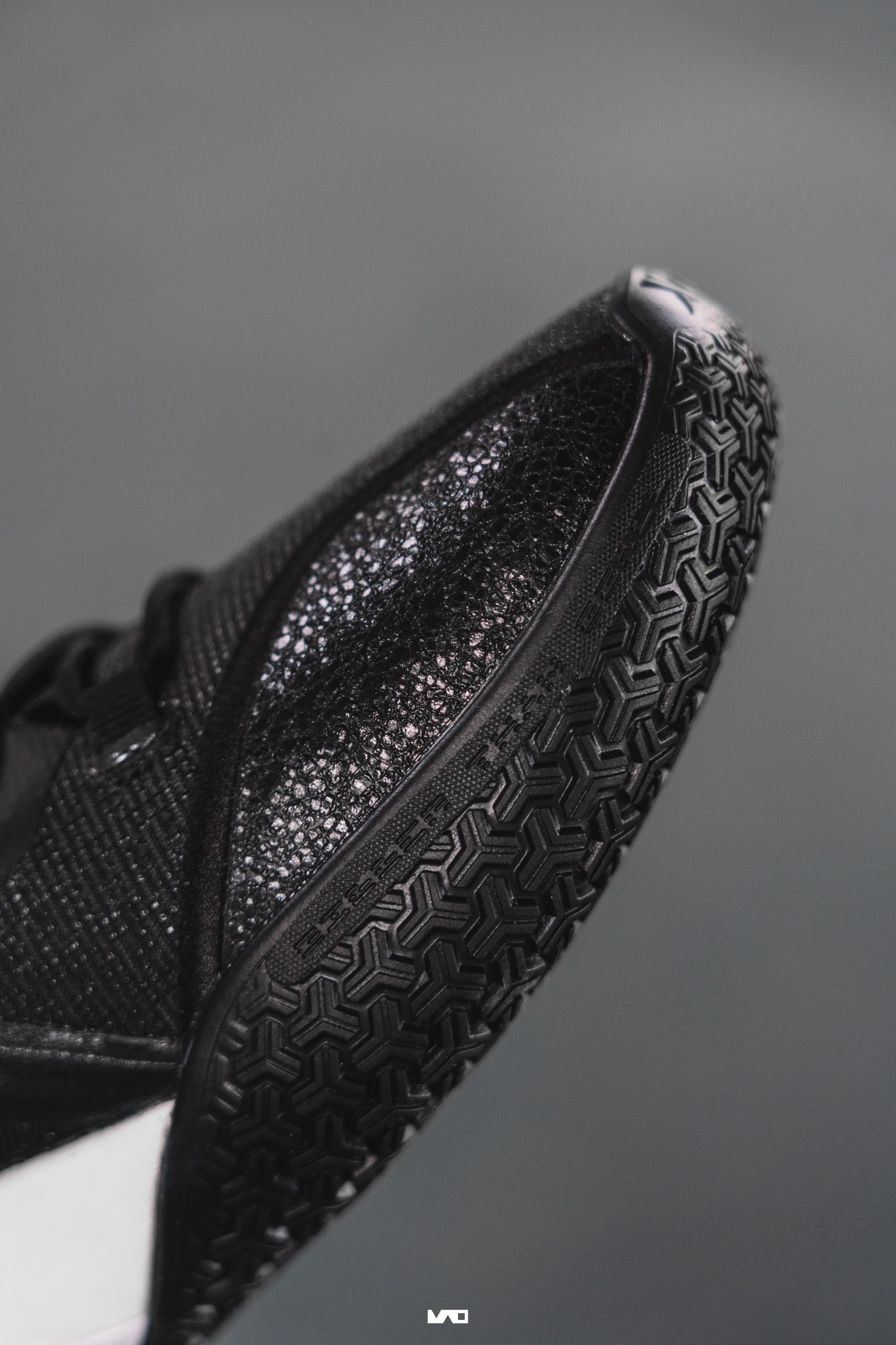 这个配色拿到手的时候, 最有亮点的位置是侧面的透气纱窗, 在光的折射下会泛出光泽, 名副其实的五彩斑斓的黑。 包括鞋头内侧的加固皮料,后跟脚踝部分, 都“黑得发光”。 作为「团队」配色, 在我理解黑色可能代表了无我, 亮光则代表了闪光的每个人。 就像那句话说的: 聚则一团火,散则满天星, 就是这个道理吧。 其他配置方面没有变化, 鞋码方面可以选正码, 脚宽建议大一码。
