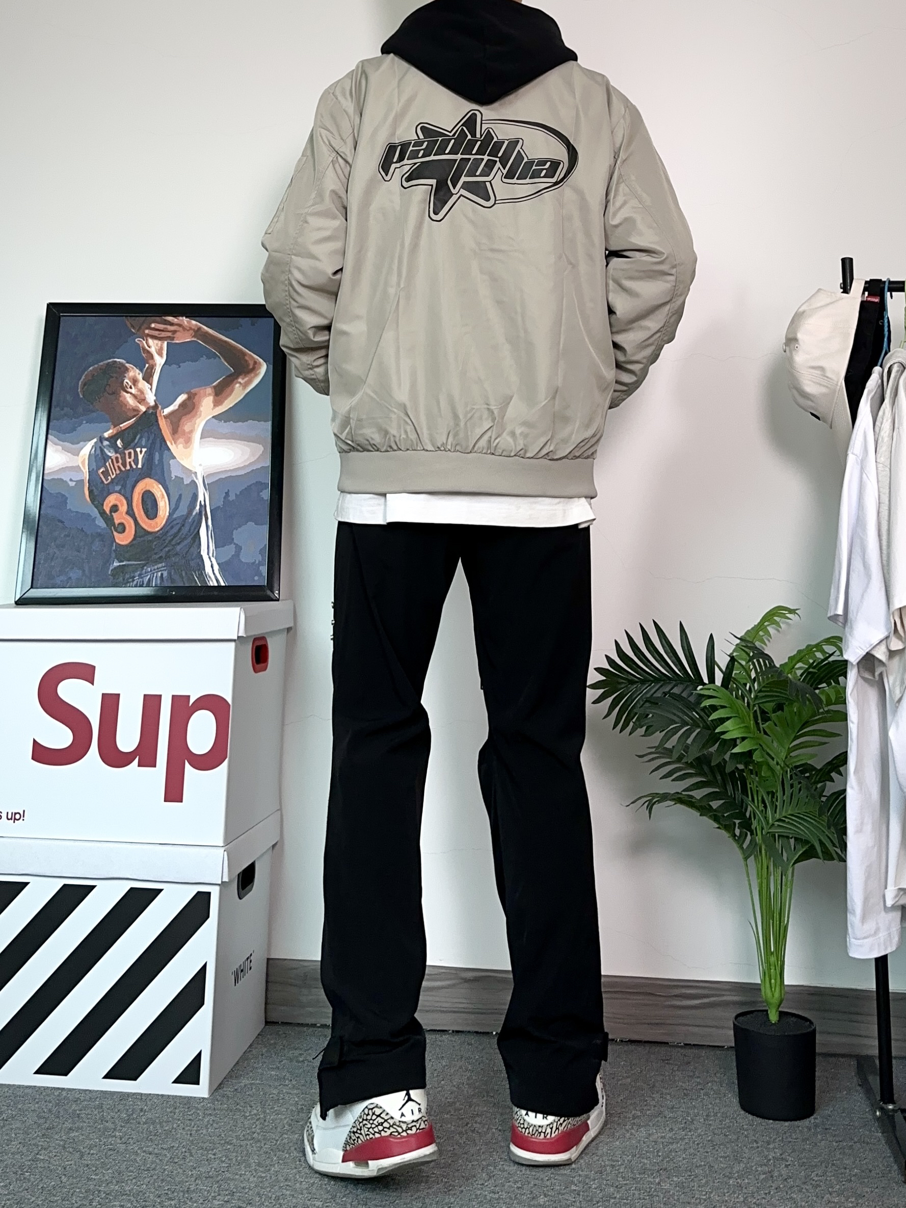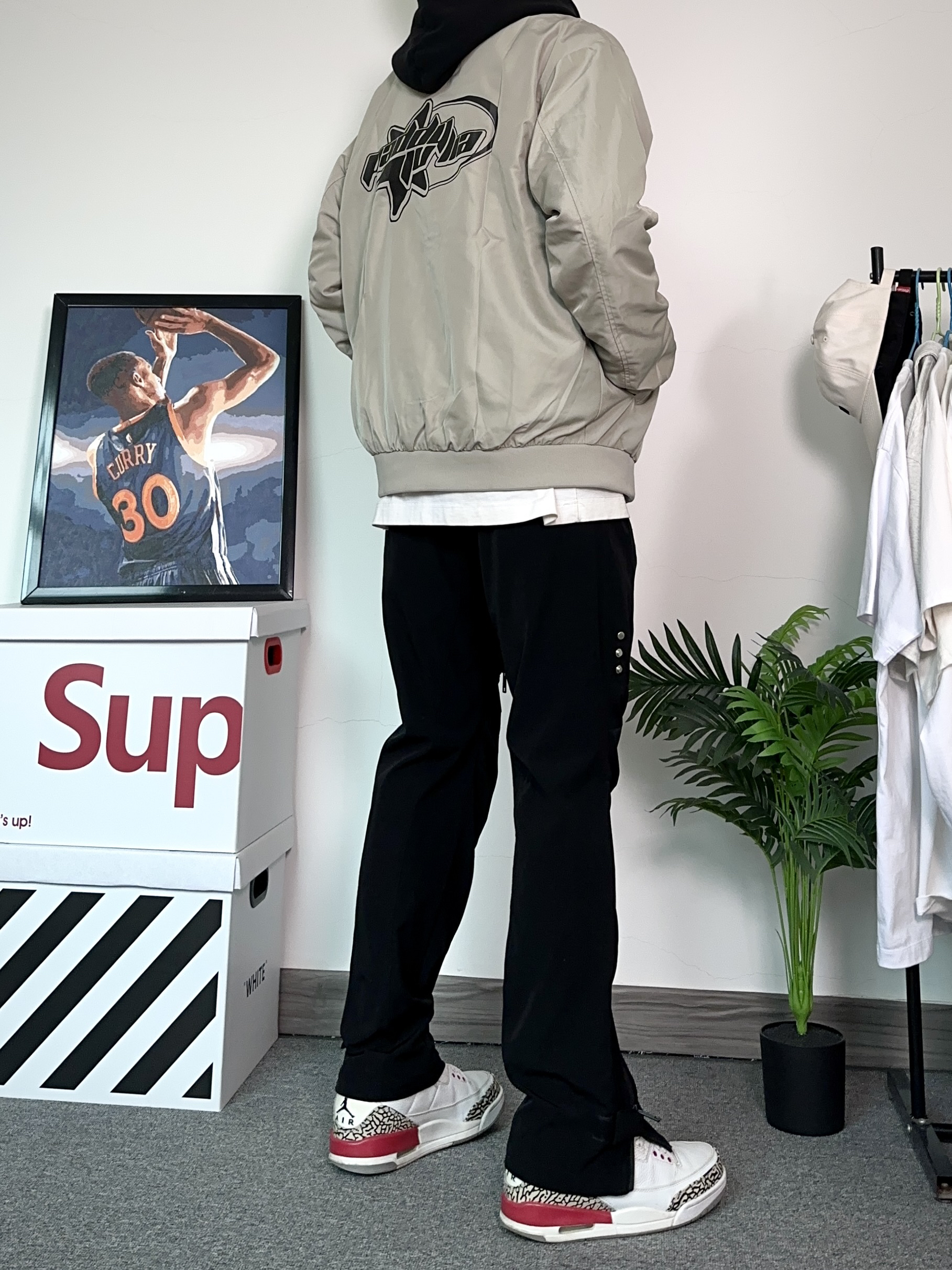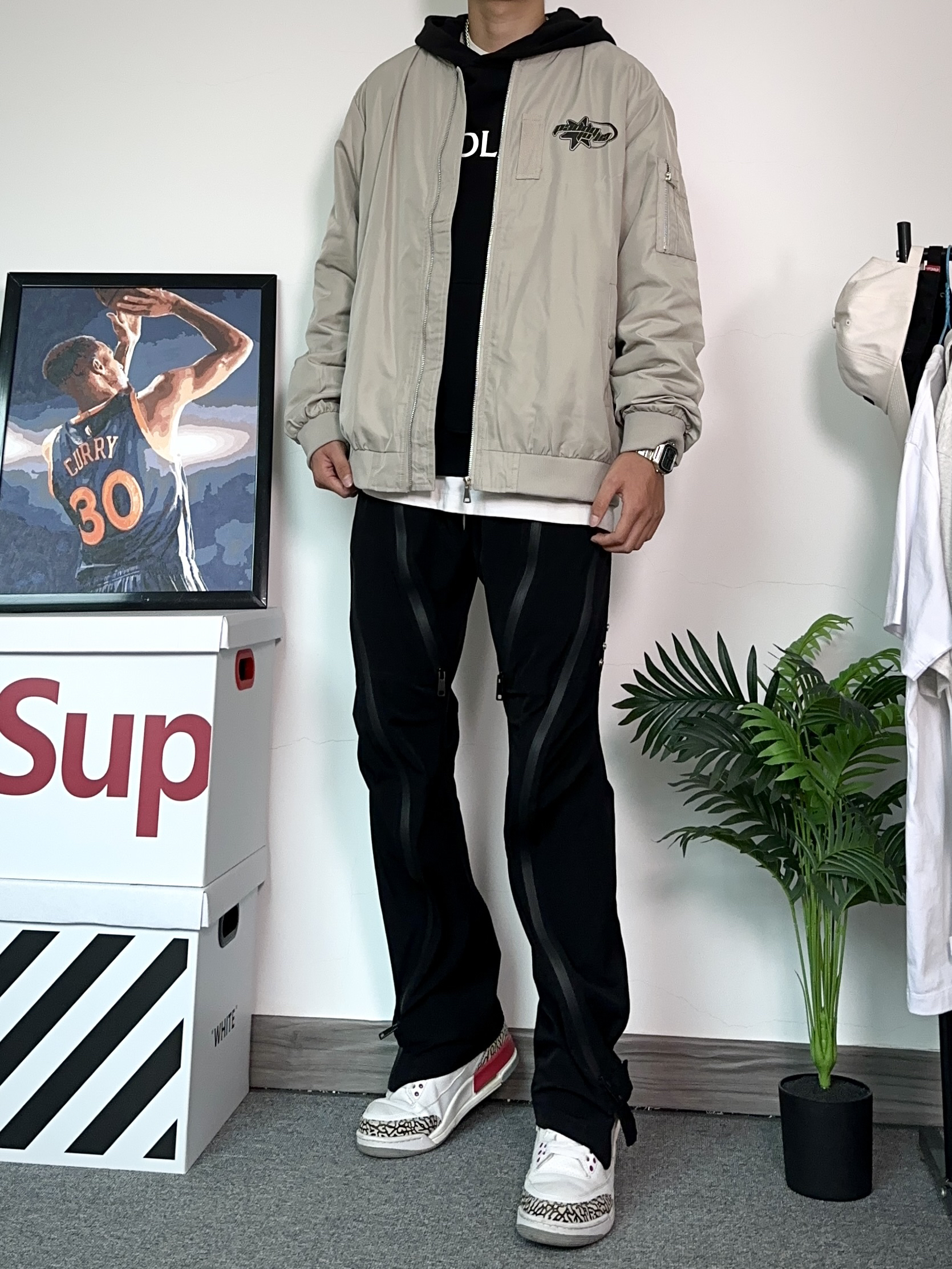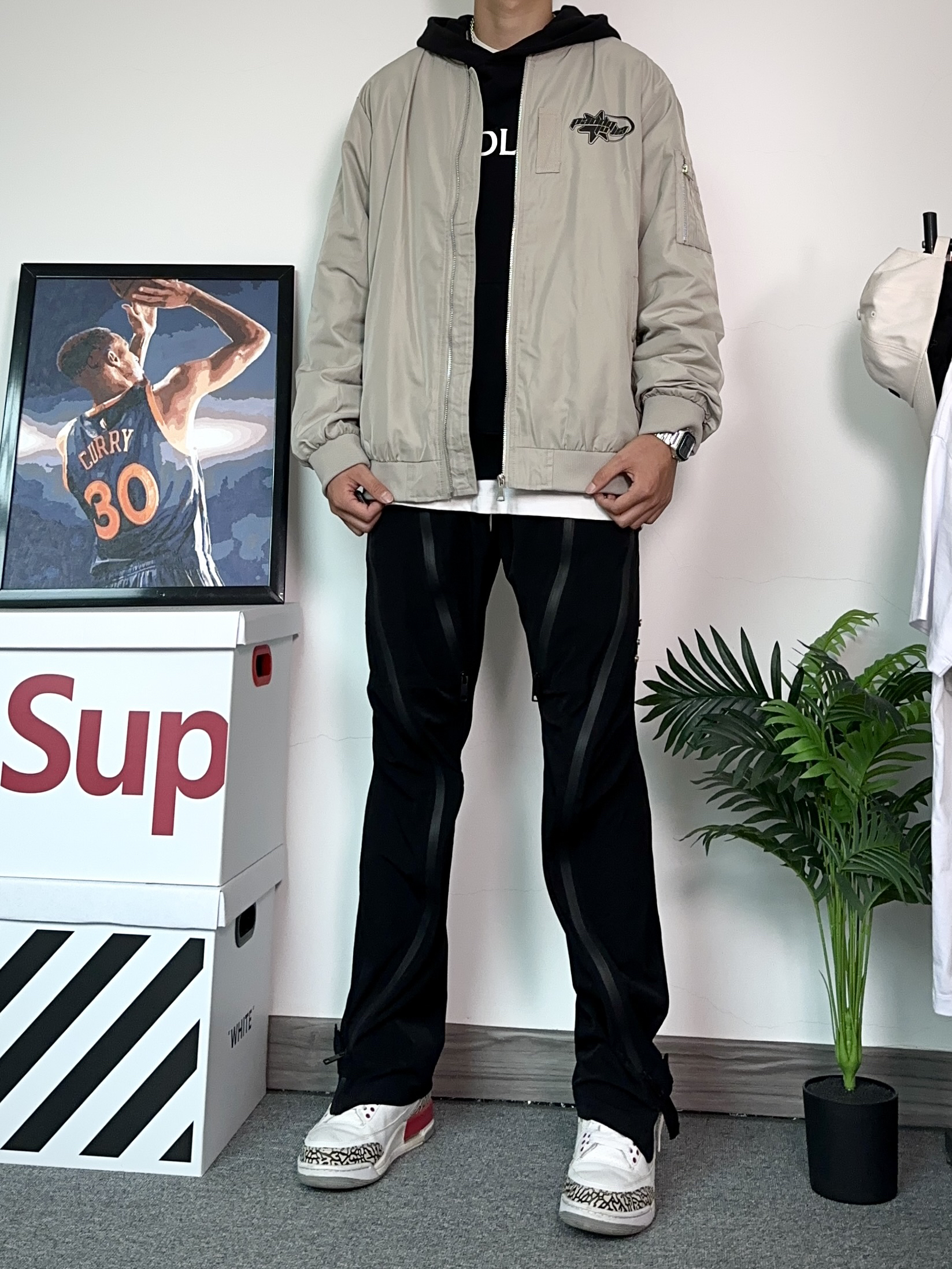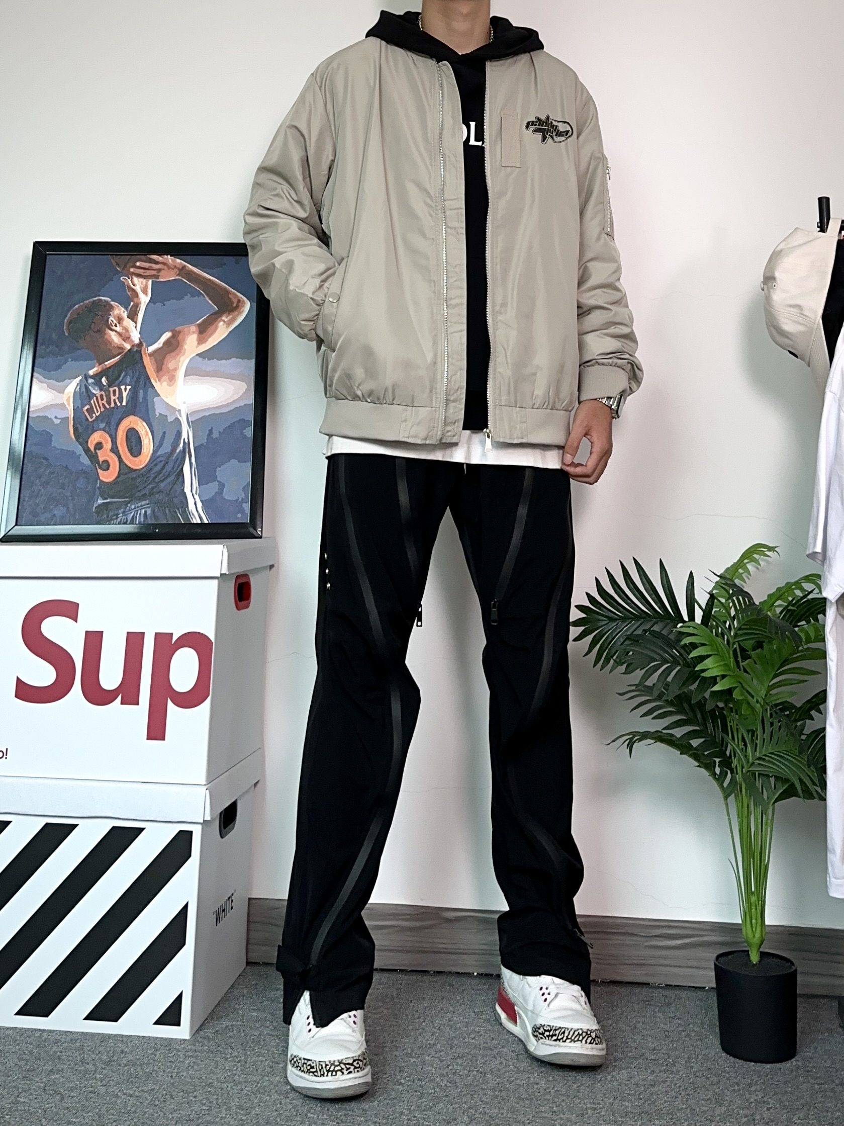 最近天气有所降温,该换秋装啦!今天分享一期入秋穿搭! - 上衣选择了一件卡其色棒球服!颜色是比较浅一点的卡其色,上身非常帅!很好搭配,搭配牛仔裤、休闲裤都很ok,百搭的勒! - 下身搭配了一条技能裤,尼龙材质的面料嘎嘎舒服!版型超级修饰腿型,上身很显瘦些 - 穿了百搭一双aj3!
