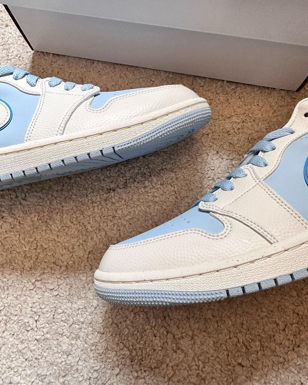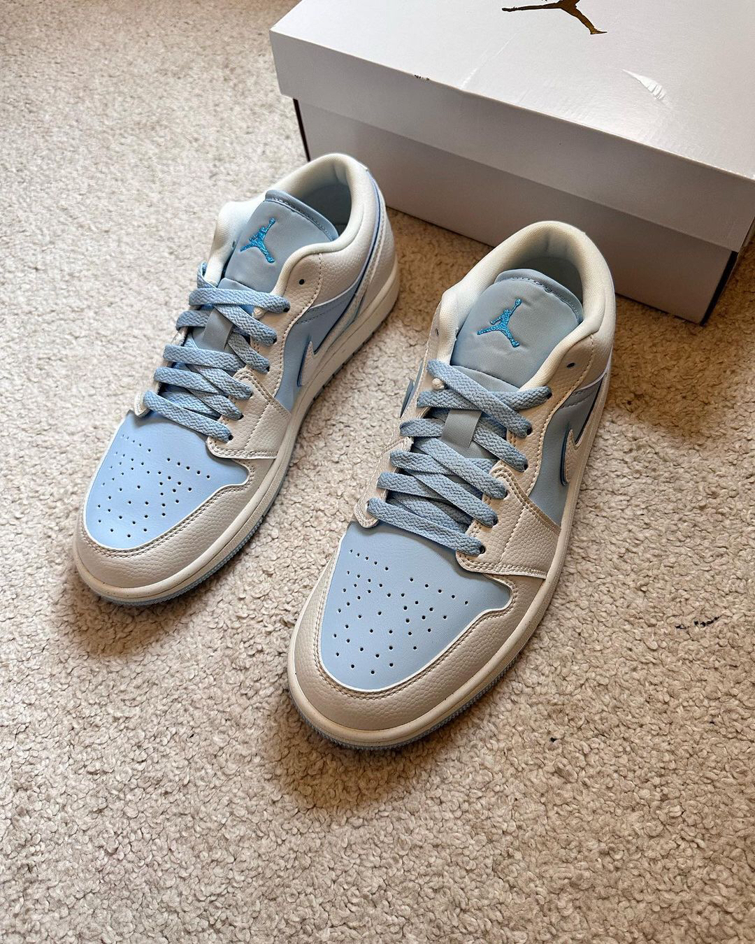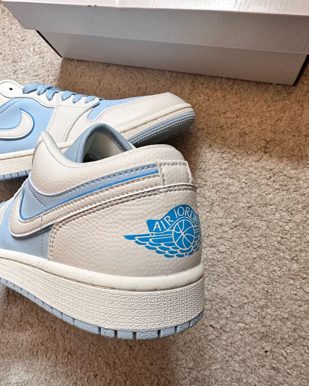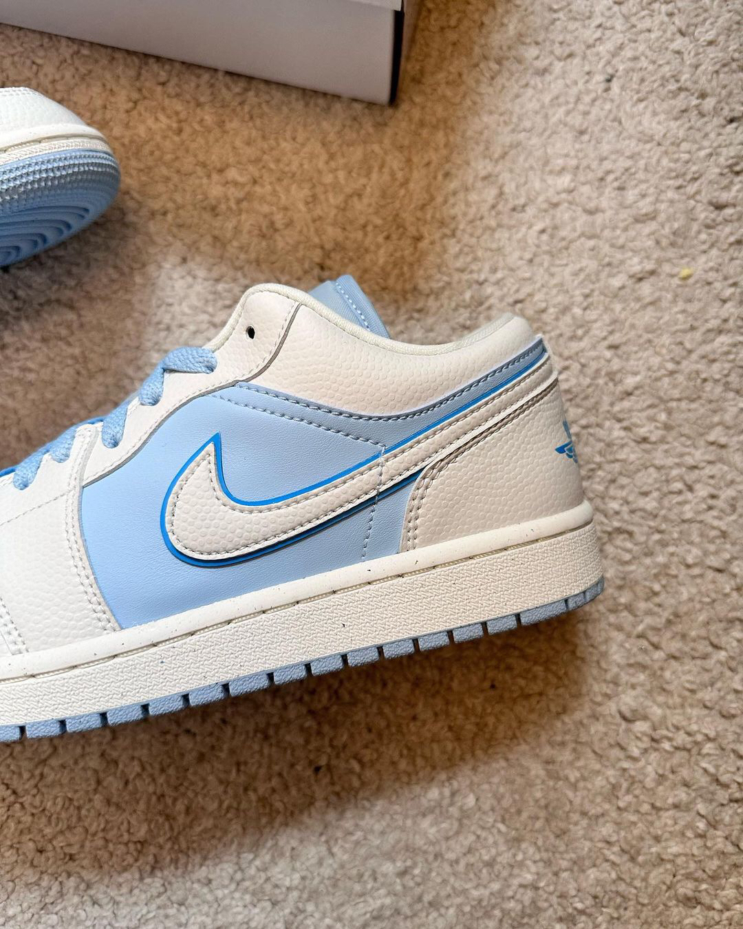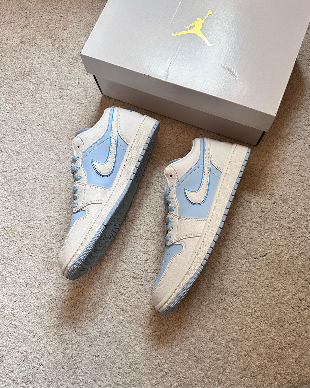 鞋一双低帮的AJ1也太好了吧‼️这个蓝色与白色的搭配✅真的很像是蓝天白云的组合☁️不仅给人心情愉悦的感觉🍐还为夏天的穿搭增加了一丝清凉感🫐皮革打造的鞋面穿起来是比较舒适的🥑两侧的钩子是用了白色皮革和深蓝色的皮革叠加而成🍒和鞋面的浅蓝色有些明显的对比🍑白色中底和蓝色大底的搭配🥝很好的呼应了鞋面🍎使鞋子整体的辨识度进一步提升🍔