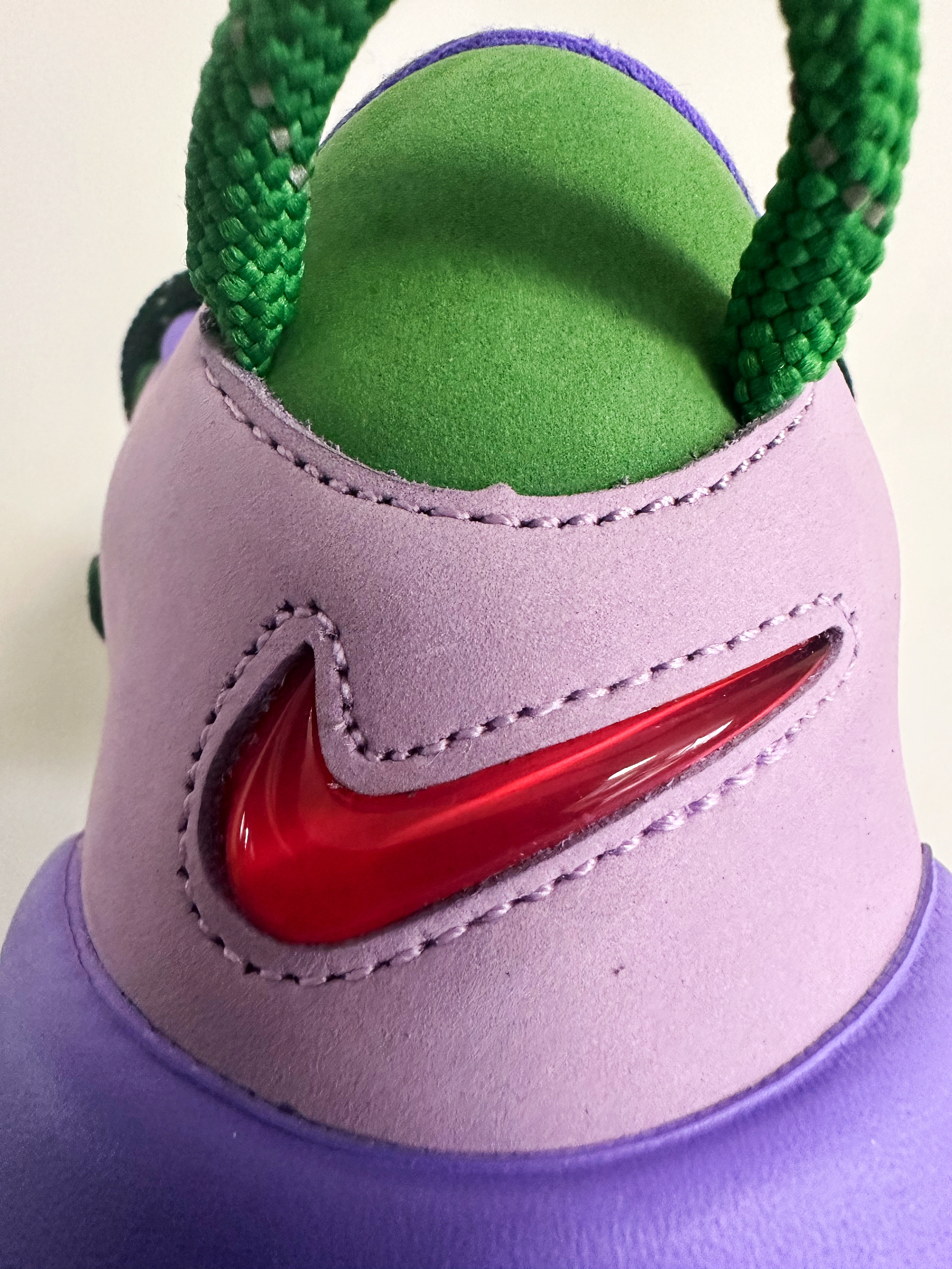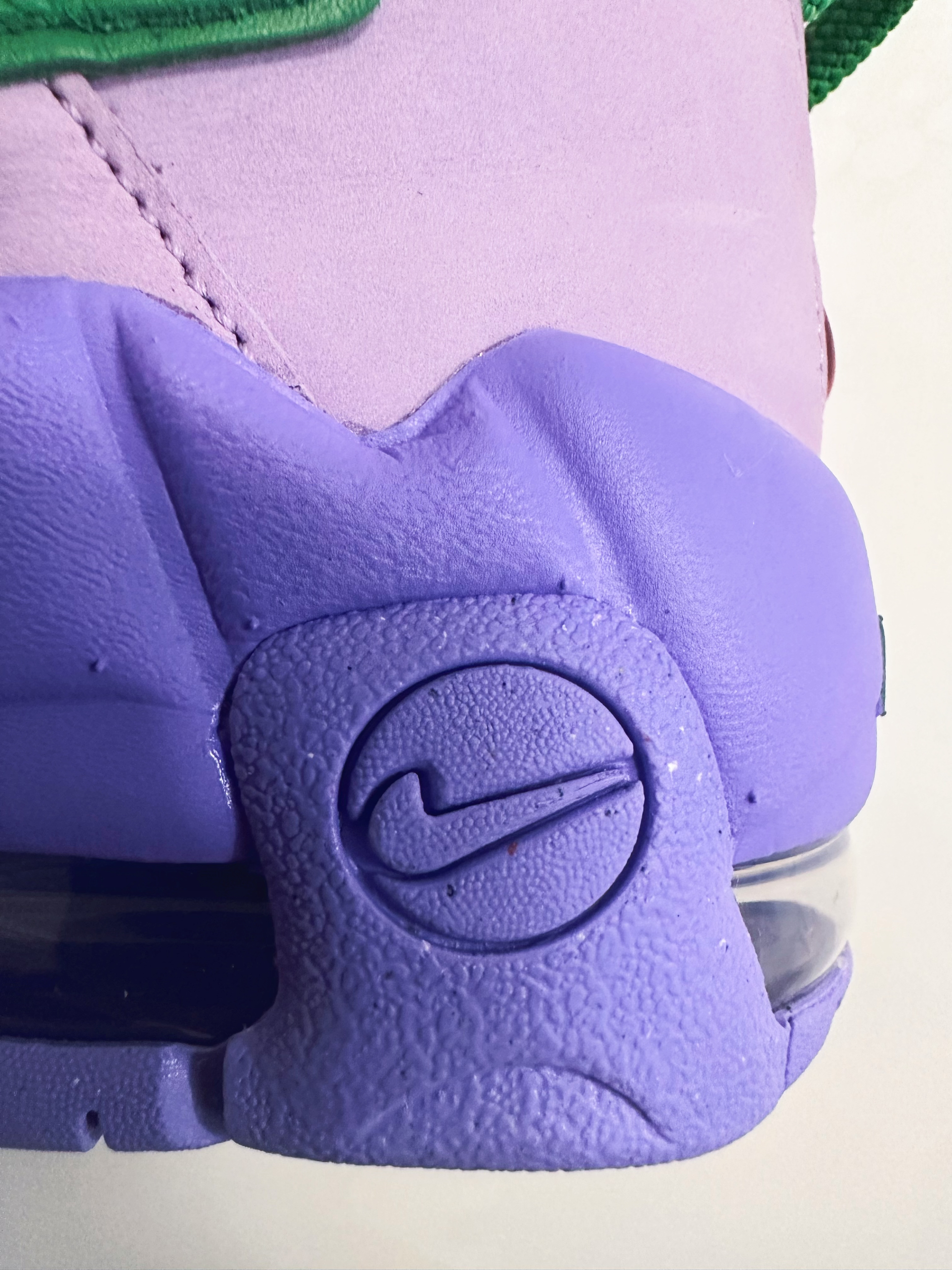 话说这双新款大AIR也太好看了吧。 深紫色加上绿色亮眼又吸睛,还有红色的logo点缀! 这双AMBUSH联名从视觉上会比普款矮一点,外置气垫摸着也没那么硬。脚感会比之前好点!