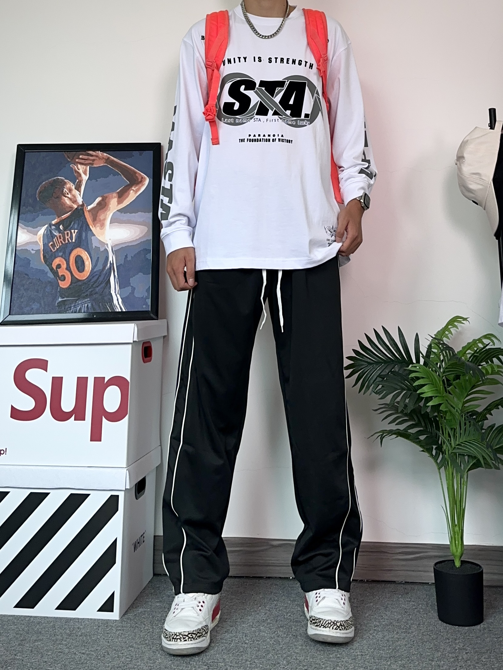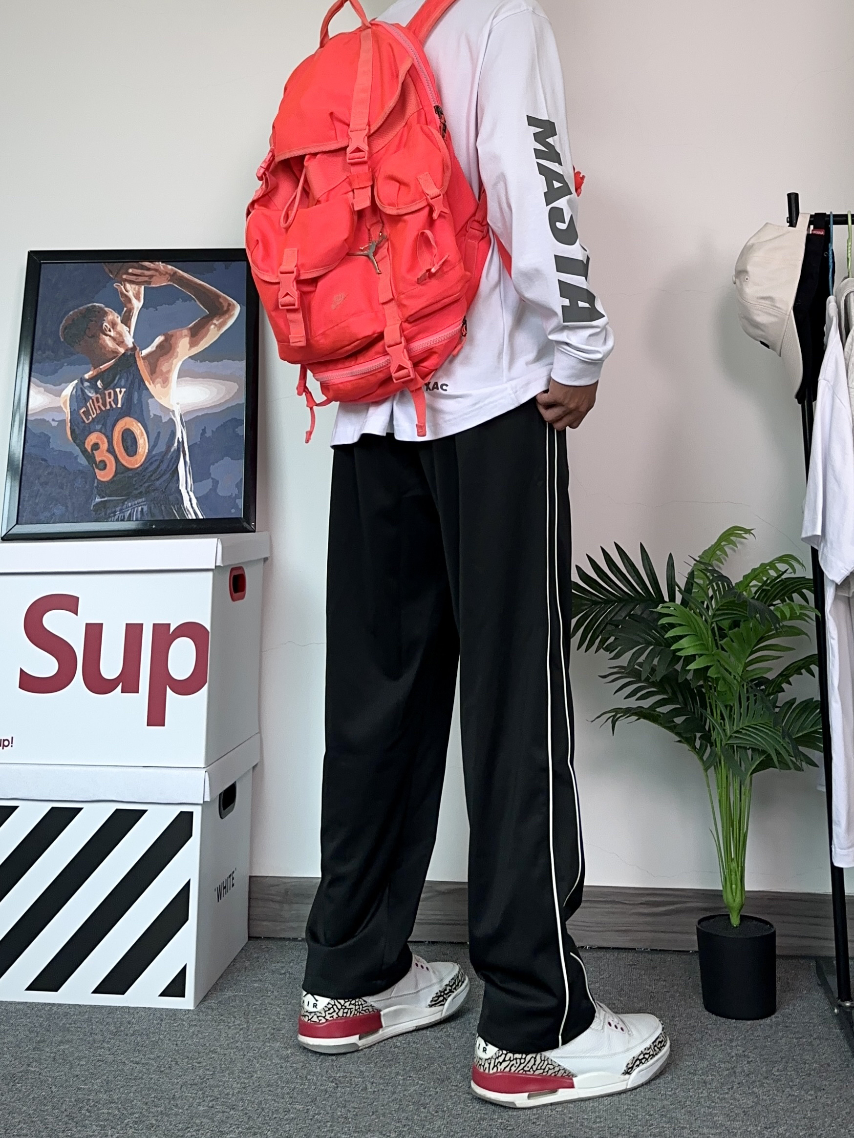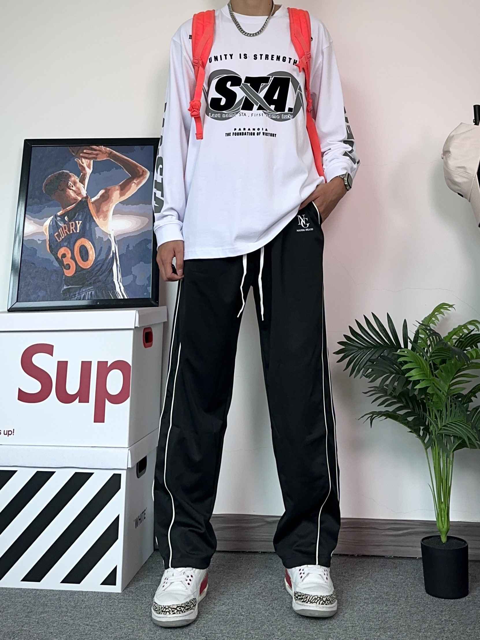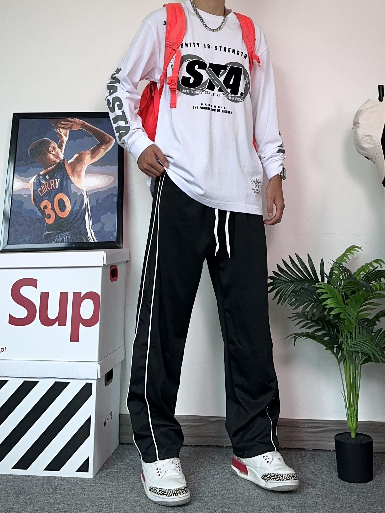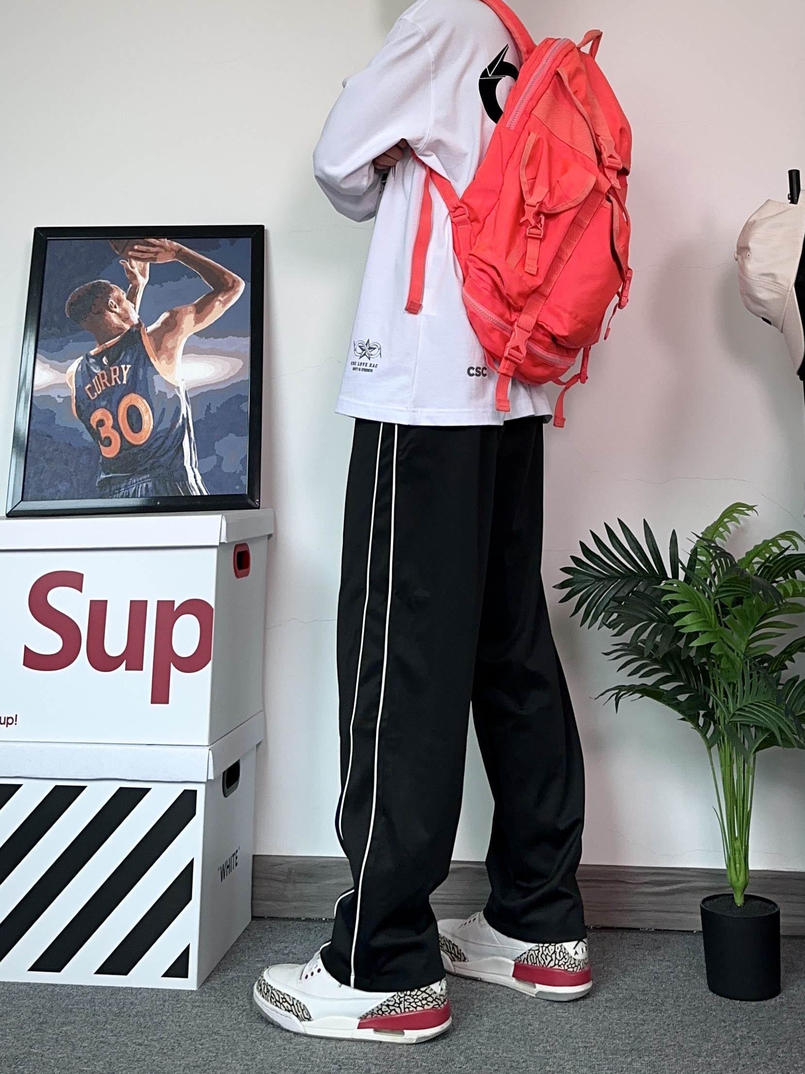 不得不说秋季才是休闲裤的主战场!这种阔腿版型的裤子真的穿不腻~ - 上身选择了一件联名款的T恤,上面的对称印花设计很有设计感!帅的勒 - 搭配了一条侧边条纹设计的黑色休闲裤! 阔腿的版型特别修饰显腿型,粗腿也可以轻松驾驭~很喜欢这种版型的裤子,真的能穿四季! - 选择了一双百搭的aj3来搭配今天的穿搭!
