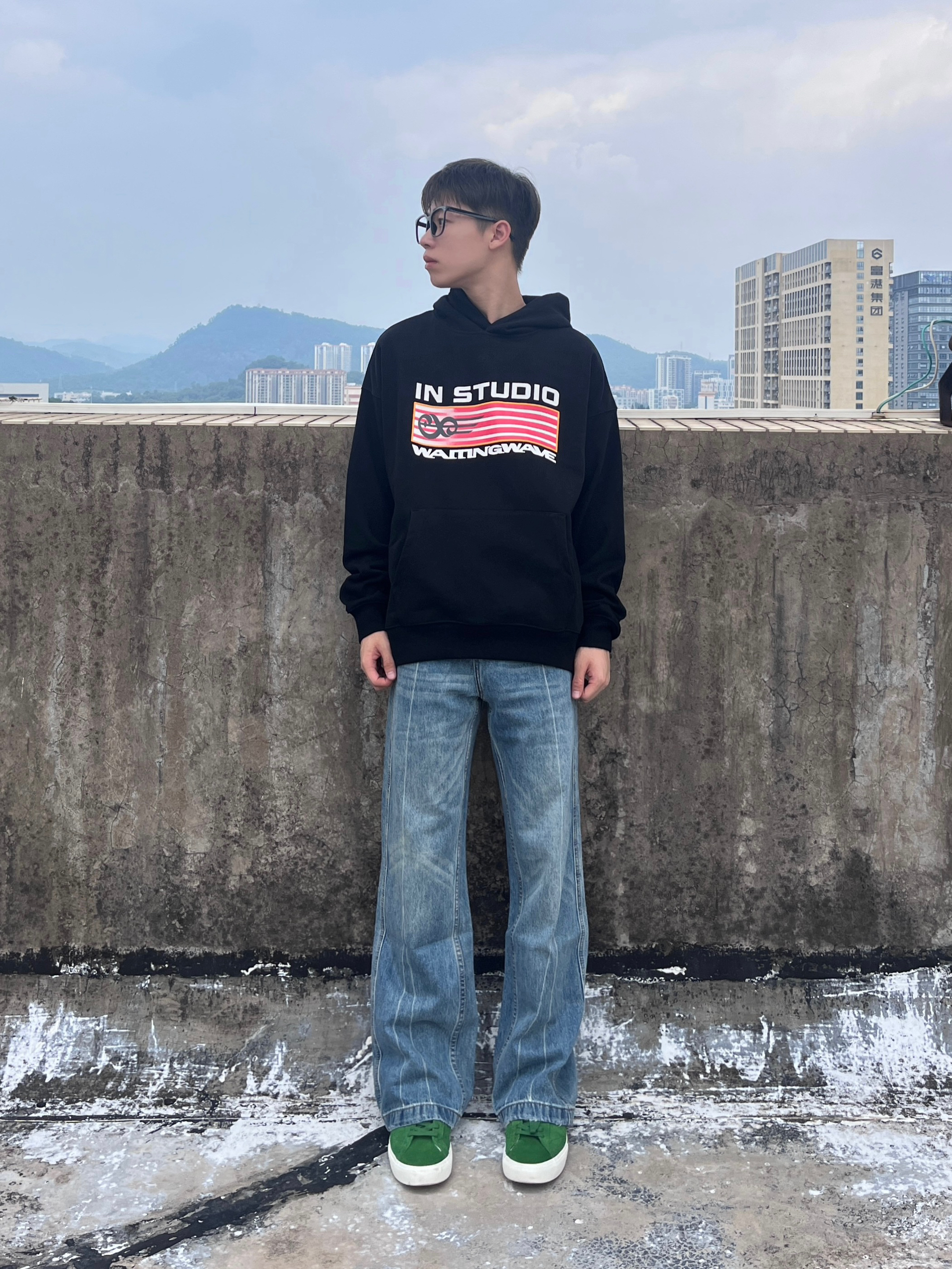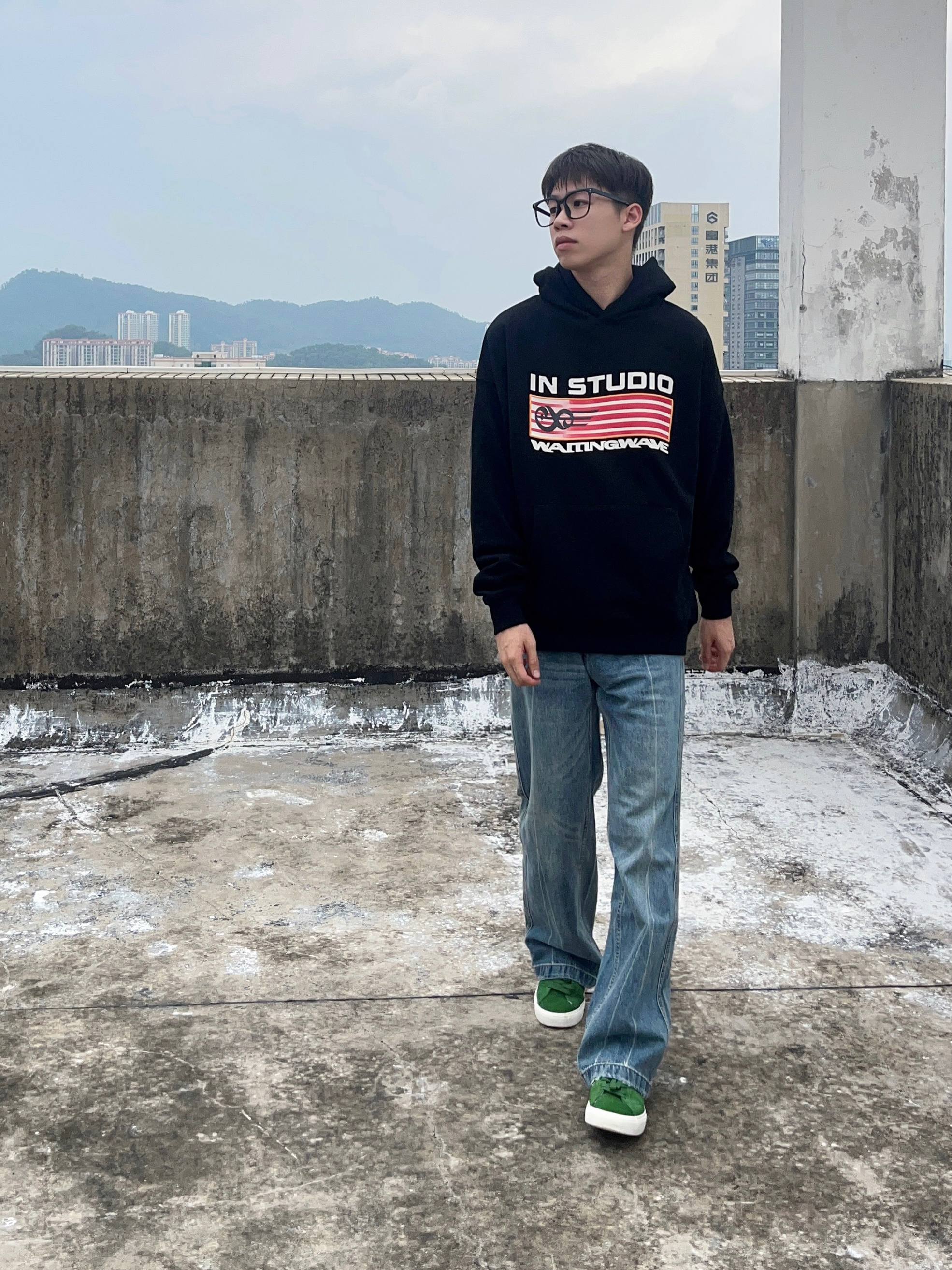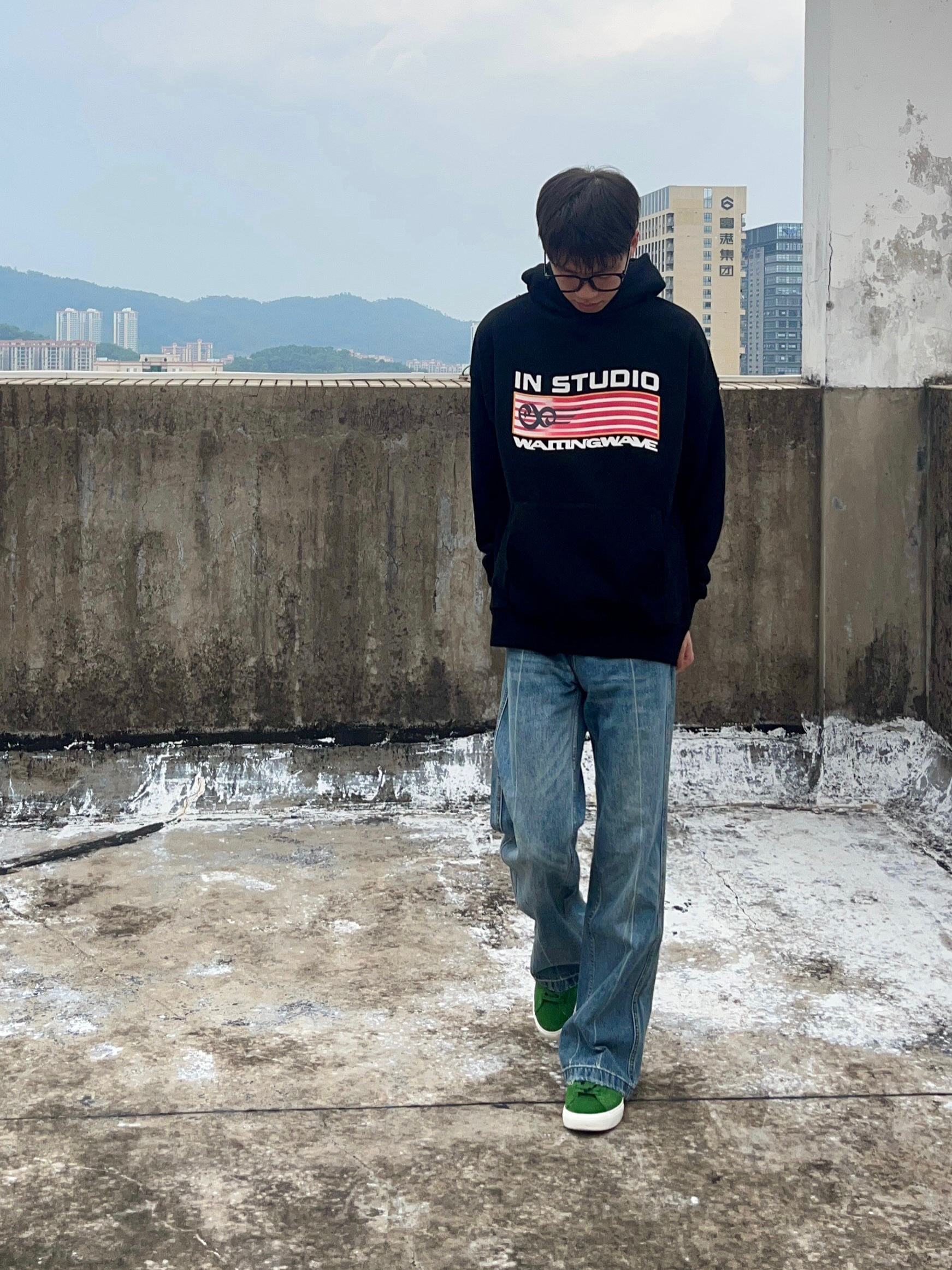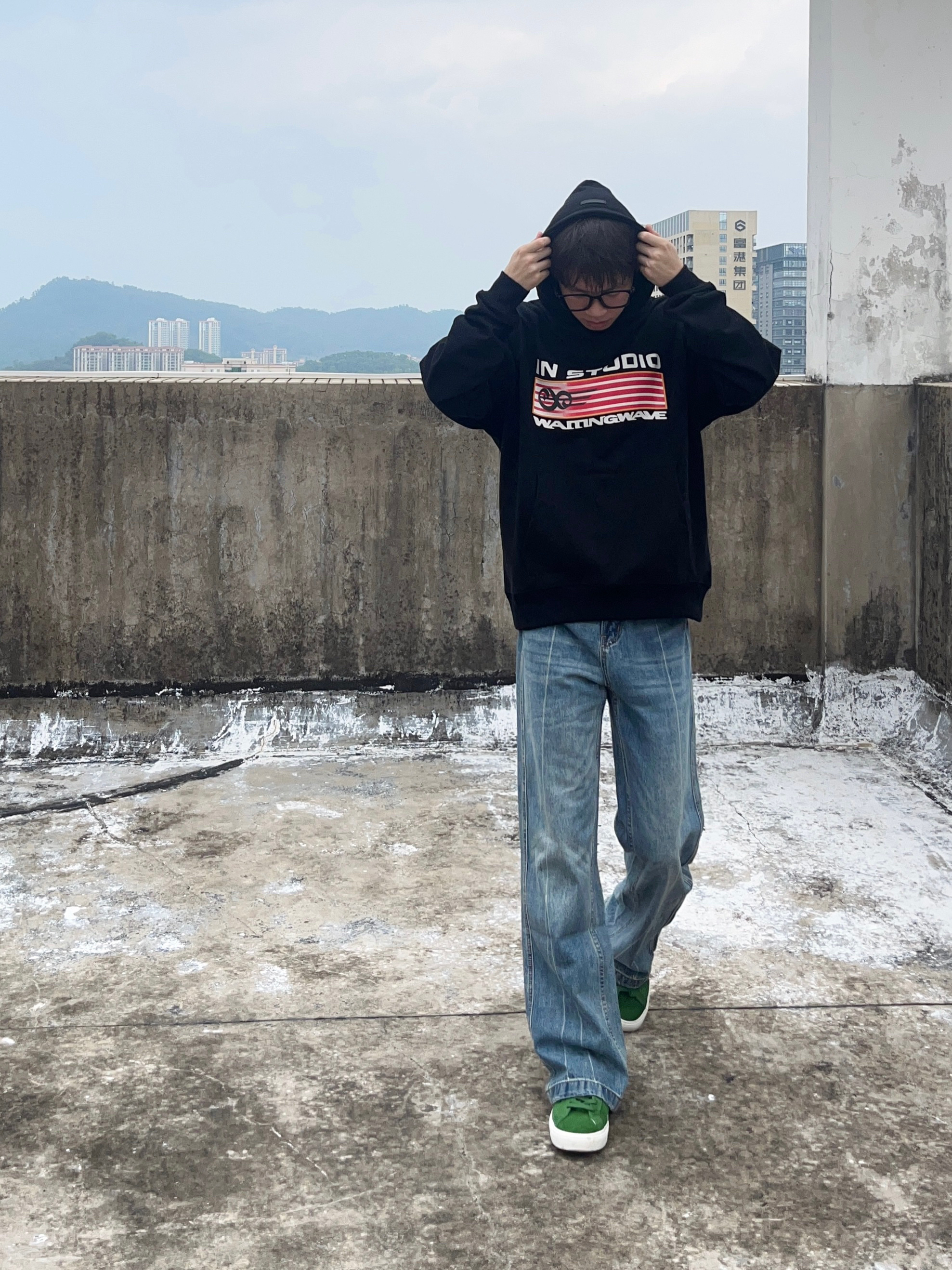 今天分享的是校园美式风高街穿搭 美式宽松入秋连帽外套搭配浅蓝色直筒牛仔裤 再上脚一双森林绿百搭面包鞋点缀 一套搭配下来 非常适合校园穿搭