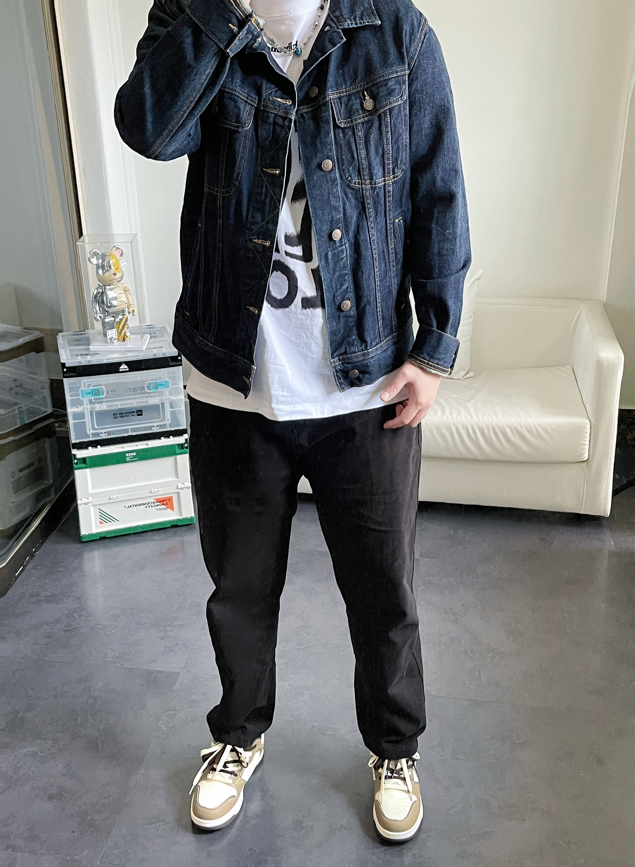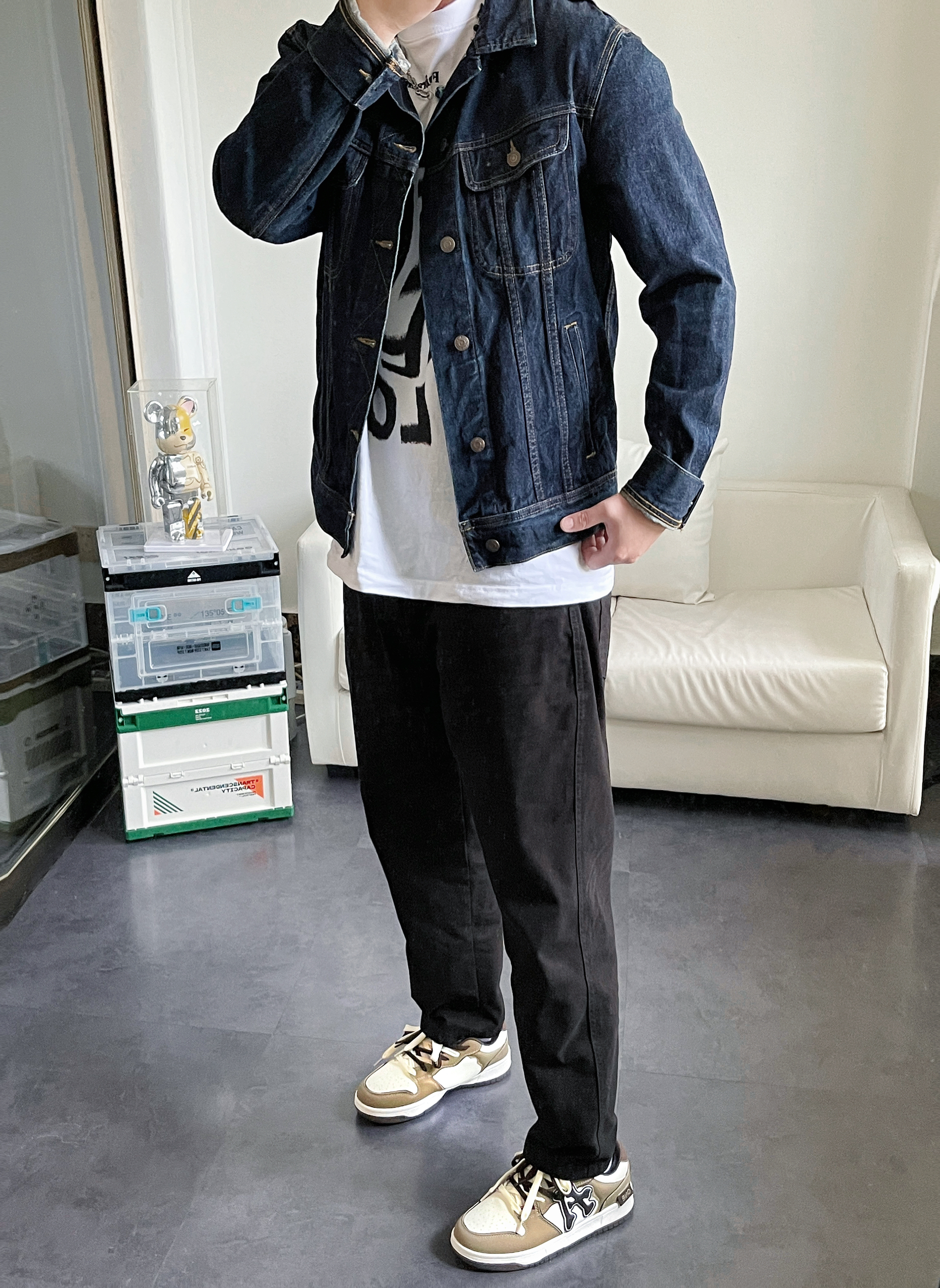 今日穿搭 牛仔➕摩卡棕👟真的太帅了 深蓝色牛仔外套确实很cool 短款的设计也很显比例 内搭了纯色T恤 会让一套搭配显得更休闲 - 直筒休闲裤也没得说 完全可以穿四季 黑色显腿瘦也不挑搭配 怎么穿👌🏻 - 再来双白配棕的板鞋直接完美! 摩卡棕简直就是秋天的配色🍂 双鞋带的设计很有层次感 上脚舒服柔软 👔 : Levis 👖 : ETAKS 👟 : A1