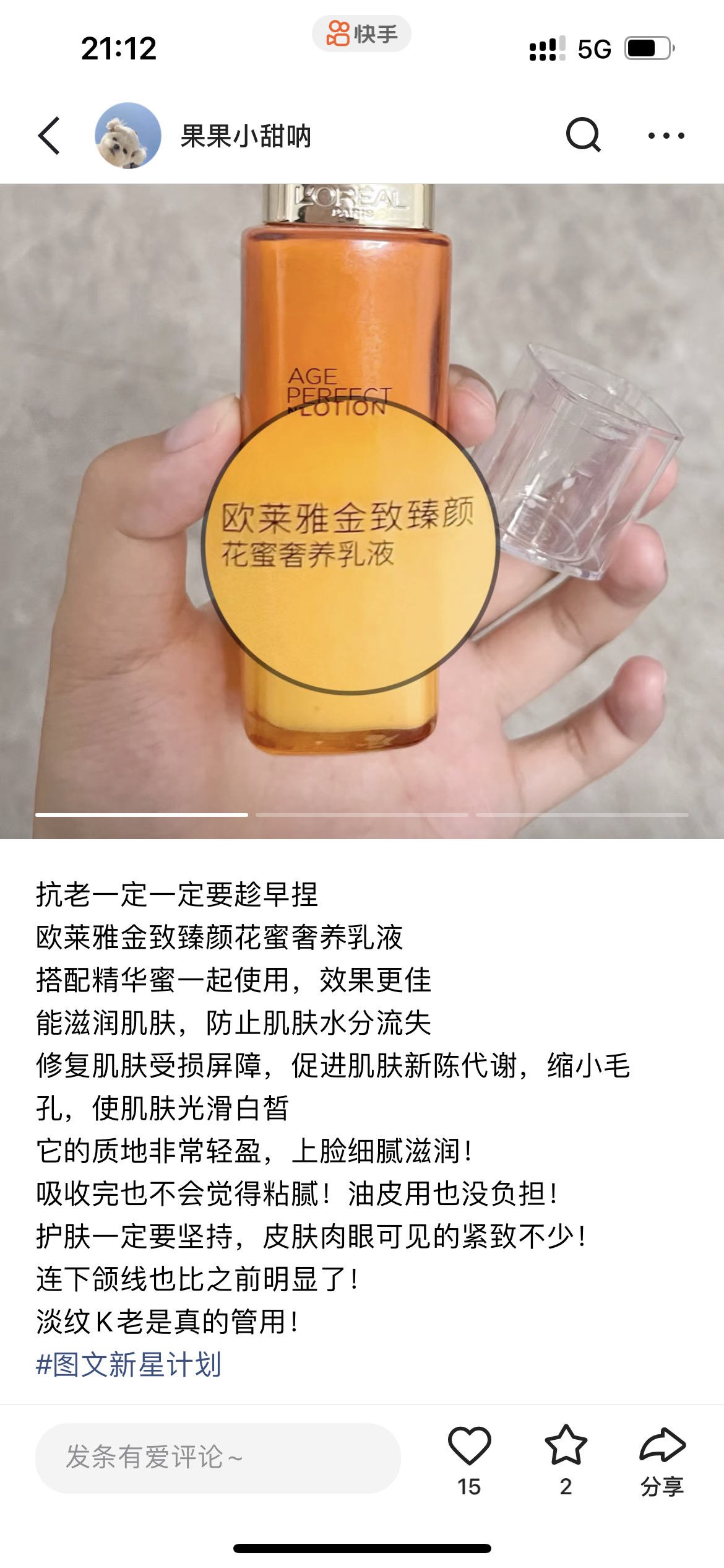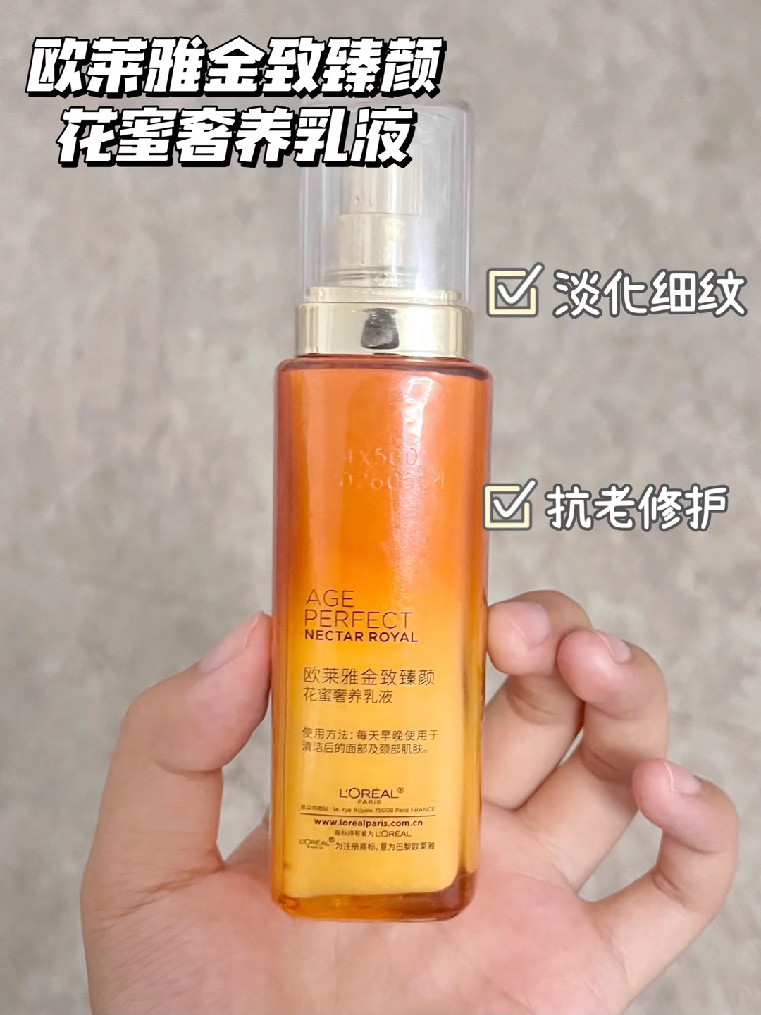 欧萊雅金致臻颜花蜜奢养乳液 搭配精华蜜一起使用,效果更佳 能滋润肌肤,防止肌肤水分流失 修复肌肤受损屏障,促进肌肤新陈代谢,缩小毛 孔,使肌肤光滑白皙 它的质地非常轻盈,上脸细腻滋润! 吸收完也不会觉得粘腻!油皮用也没负担! 护肤一定要坚持,皮肤肉眼可见的紧致不少! 连下颌线也比之前明显了! 淡纹K老是真的管用!