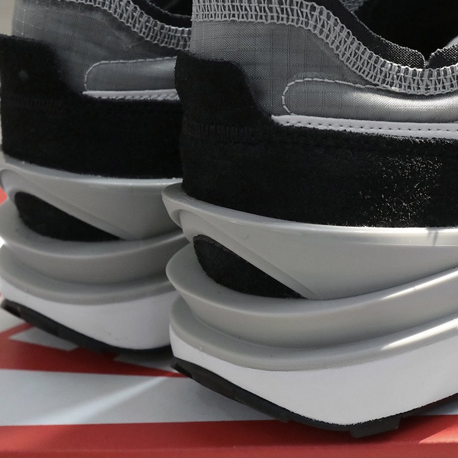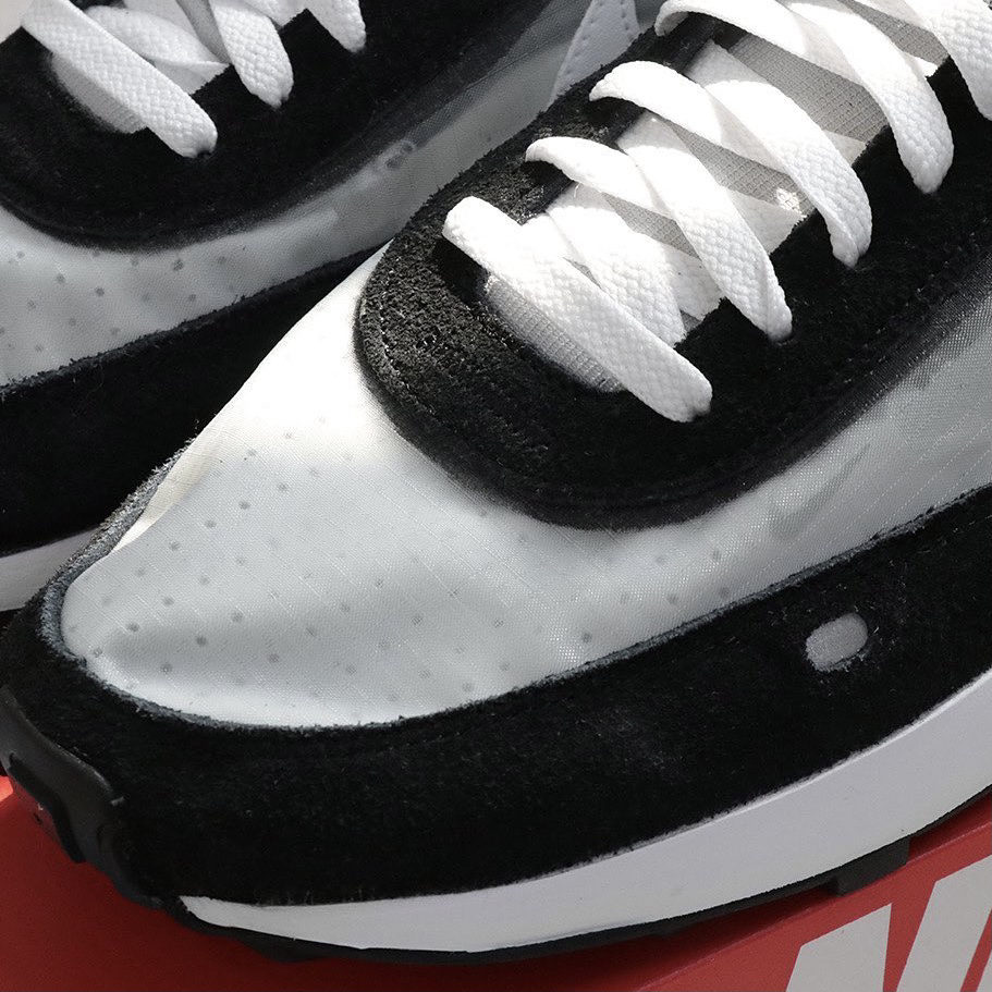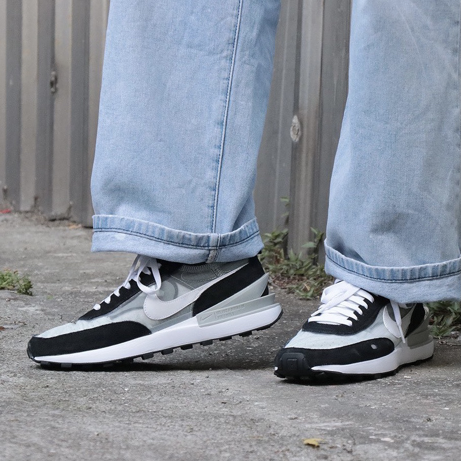 鞋名:Waffle One 黑灰色 外观及细节: 鞋子从外观上来看的话是一双比较具有时尚感的华夫鞋,整体的配色也比较简单,以黑灰色呈现,但外观细节上还是有亮眼的地方,后跟上运用了类似Sacai的多层设计,很有时尚感,并且又运用了蝉翼材料制作鞋面,又有点“死亡之吻”的感觉,黑色的麂皮也是增加了全鞋的质感,经典的黑色华夫格大底与白色泡棉的组合,将经典继续延续。