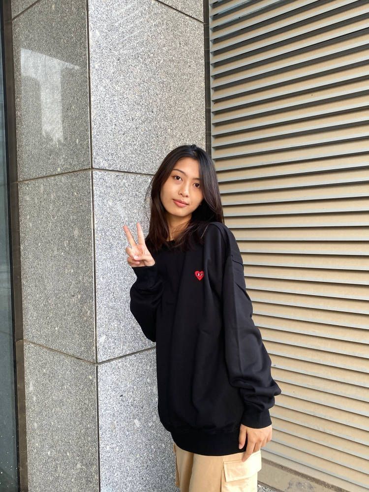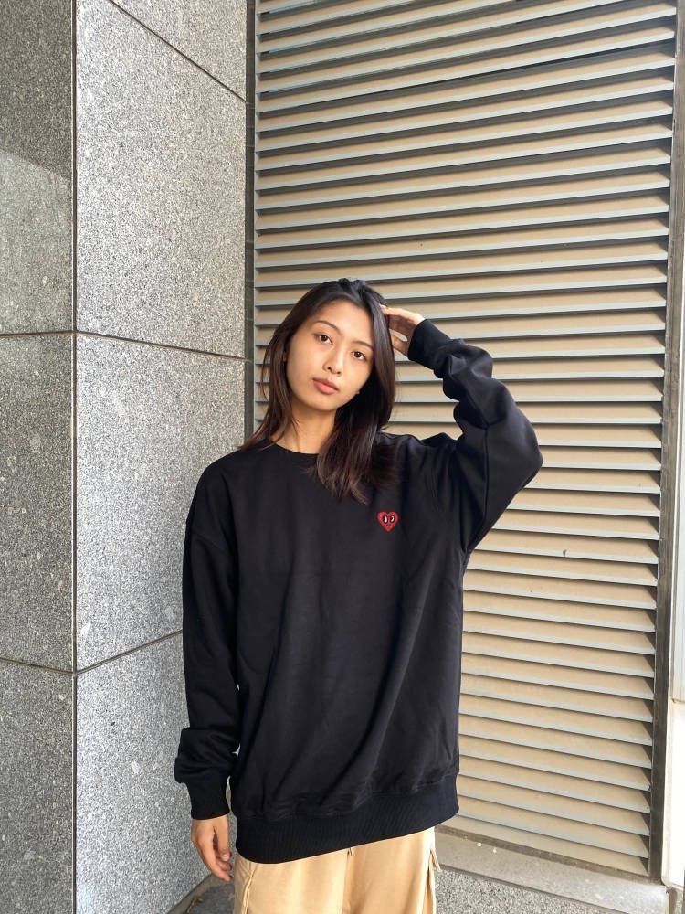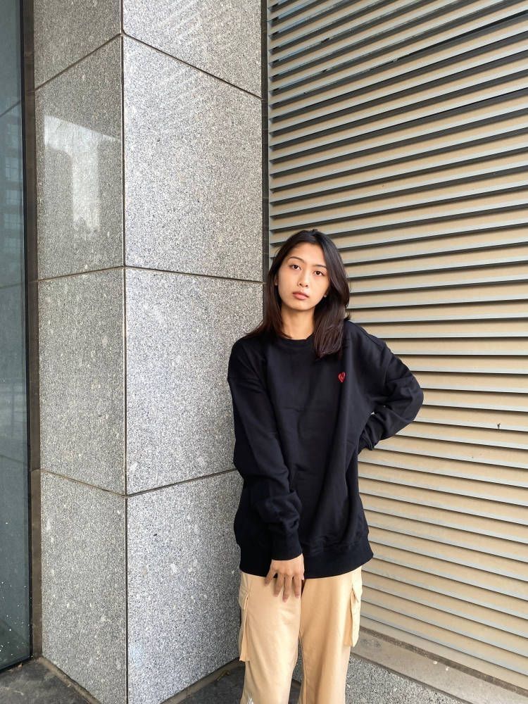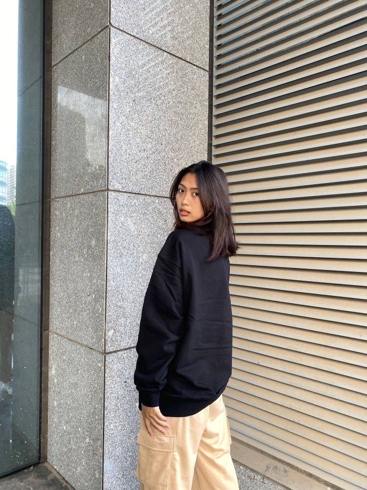 百搭的卫衣必须安排啦!酷酷的黑色上身是舒服随意的中性风,版型宽松挺廓有型好久,下身随便配一条裤子,舒适满分~