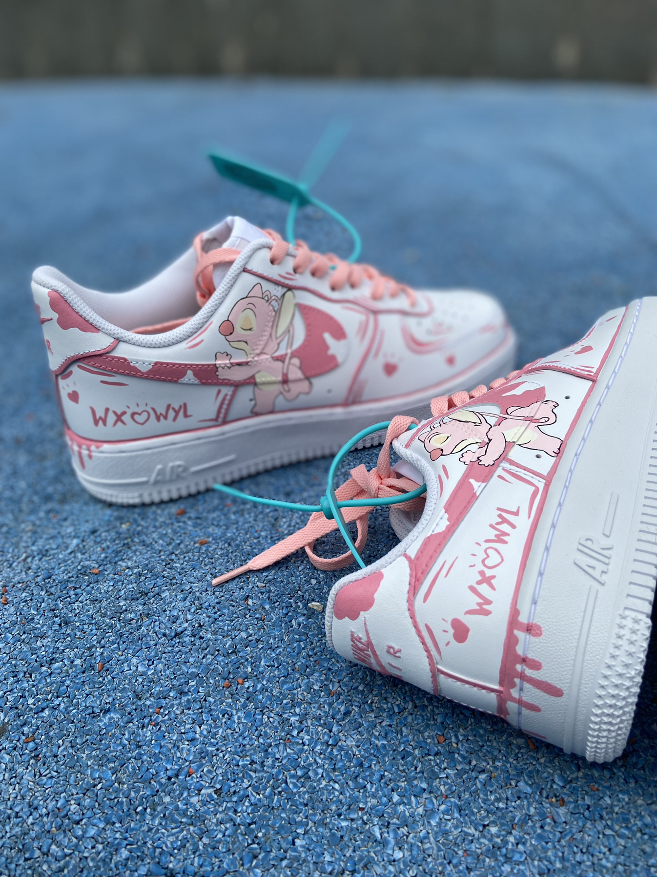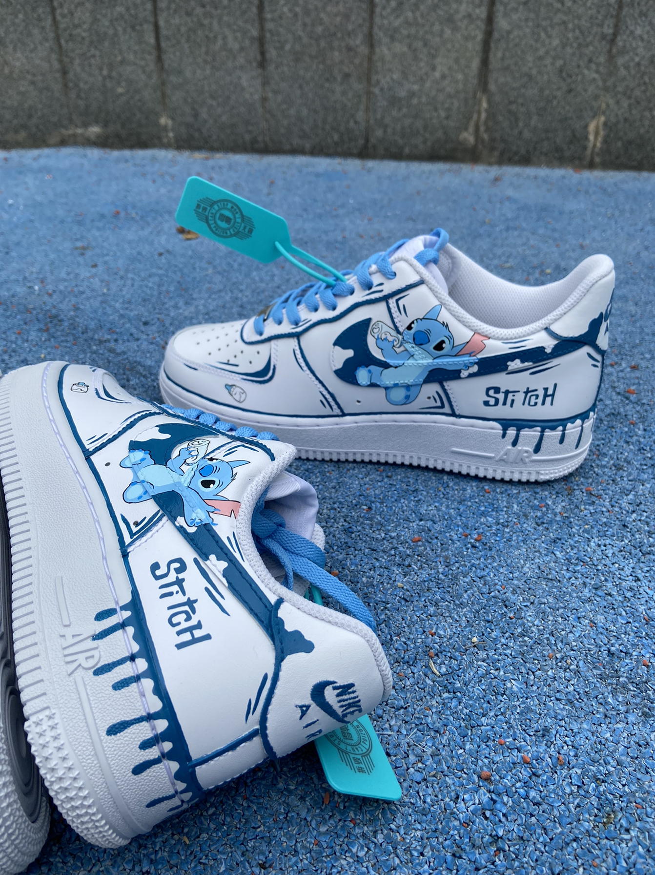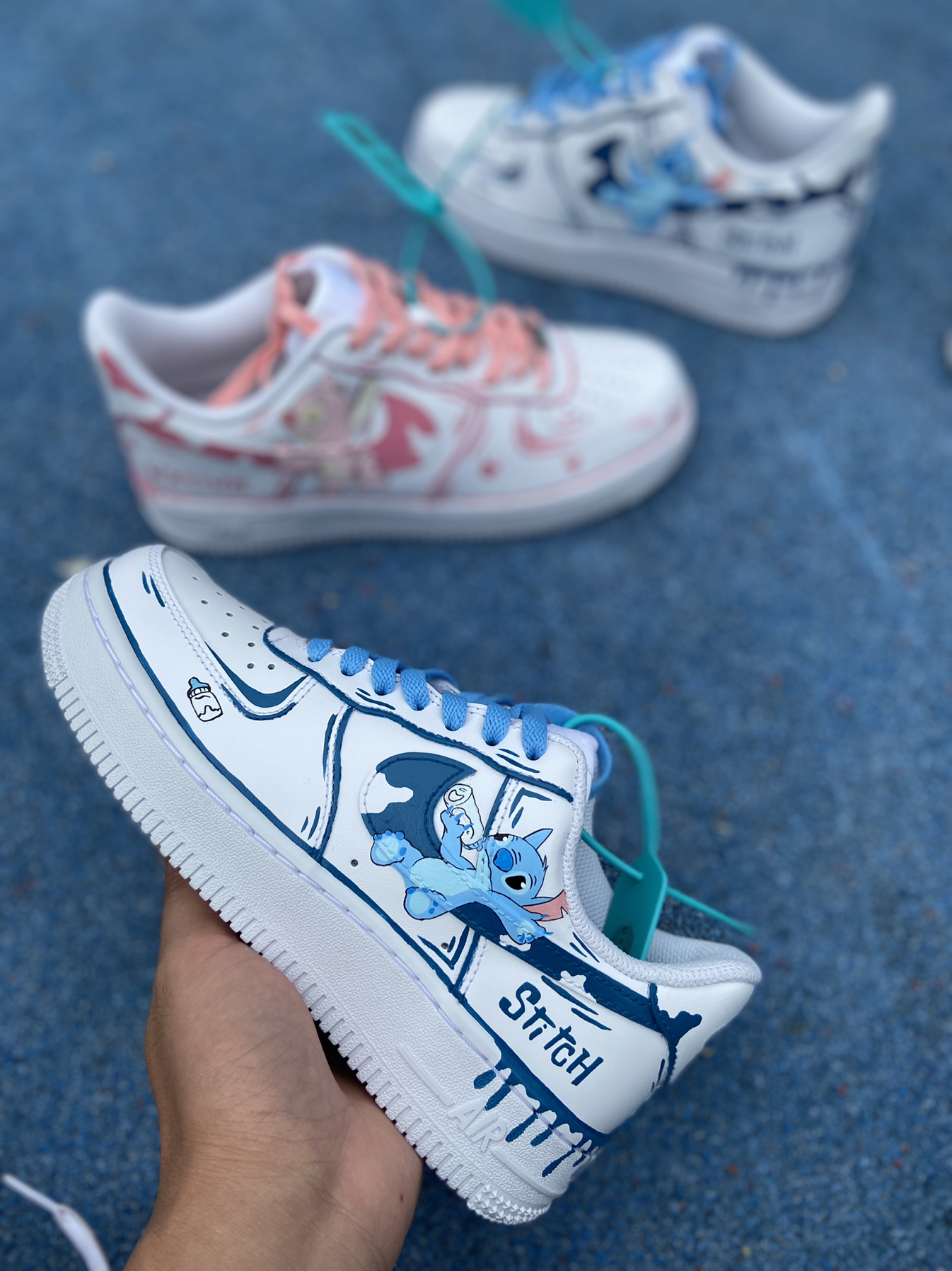 你有和你对象一起穿过情侣鞋吗,如果有那一定是一段刻骨铭心的回忆,这双情侣鞋以史迪仔为主题改造来的,简单的二次元风格,色调上一蓝一粉,有表白的情话也有你们的名字,见证着你们的爱情故事