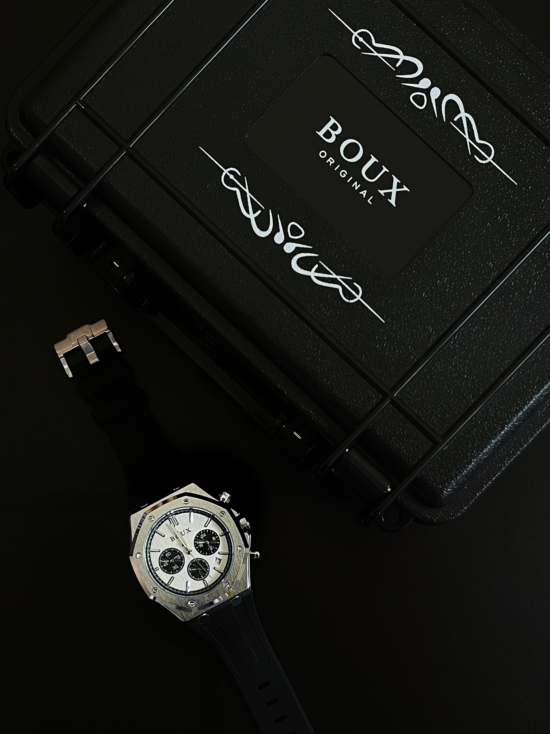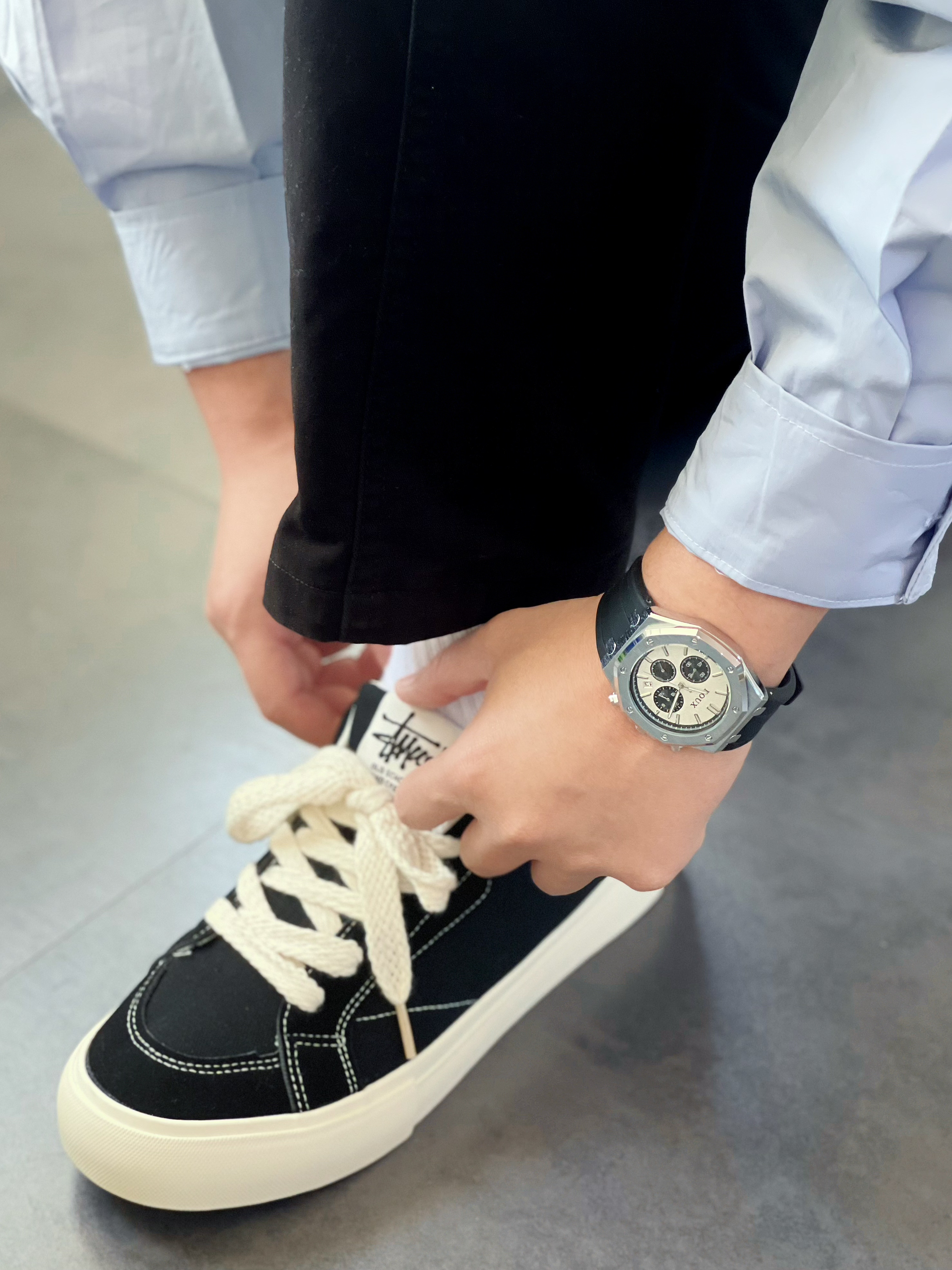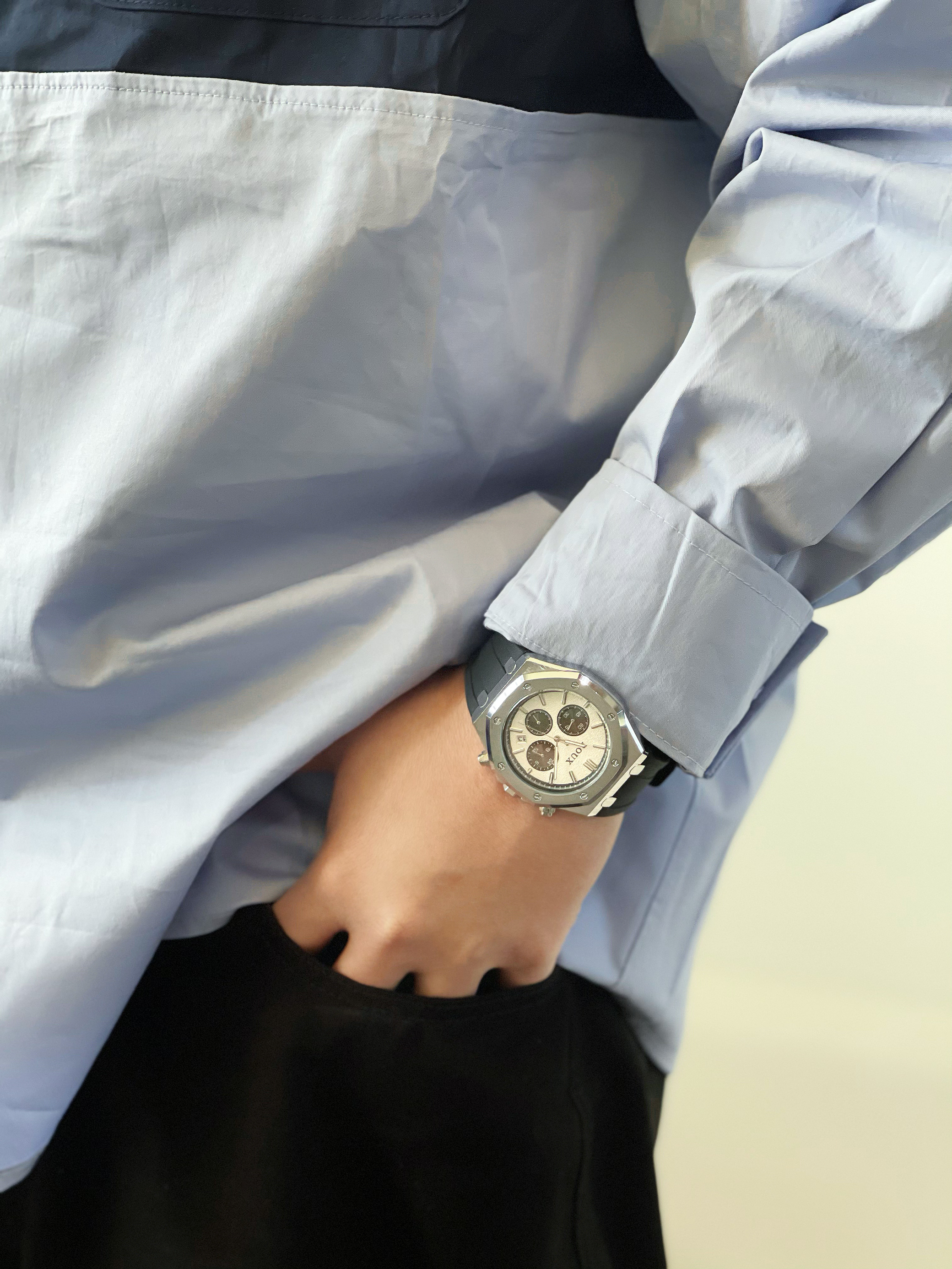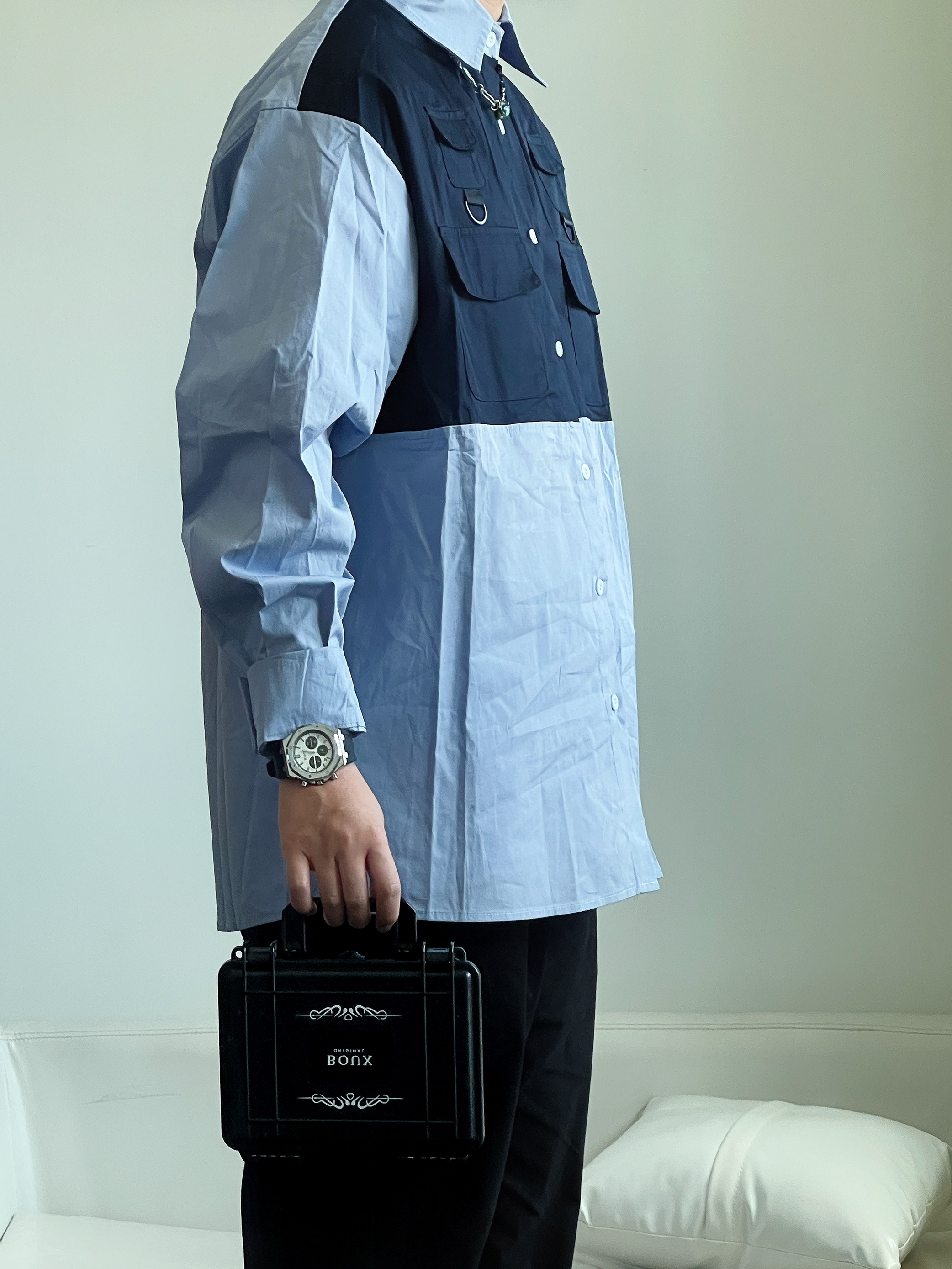 今日出门穿搭 - 👔 : 上身蓝色工装拼接衬衫 很机能风 👖 : 下身黑色直筒长裤 垂感很棒 真的是男生衣柜的必备 👟 : 上脚一双纯色板鞋 简约干净 非常百搭 ⌚️ : 最后来一块穿搭的点睛之笔 戴的是BOUX石英表 熊猫配色的表盘搭配经典的三眼六针 硅胶表带 亲肤舒适