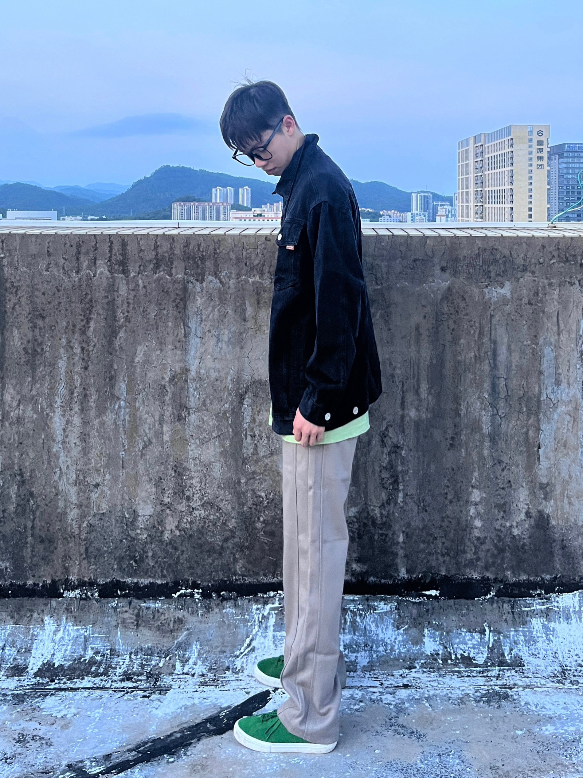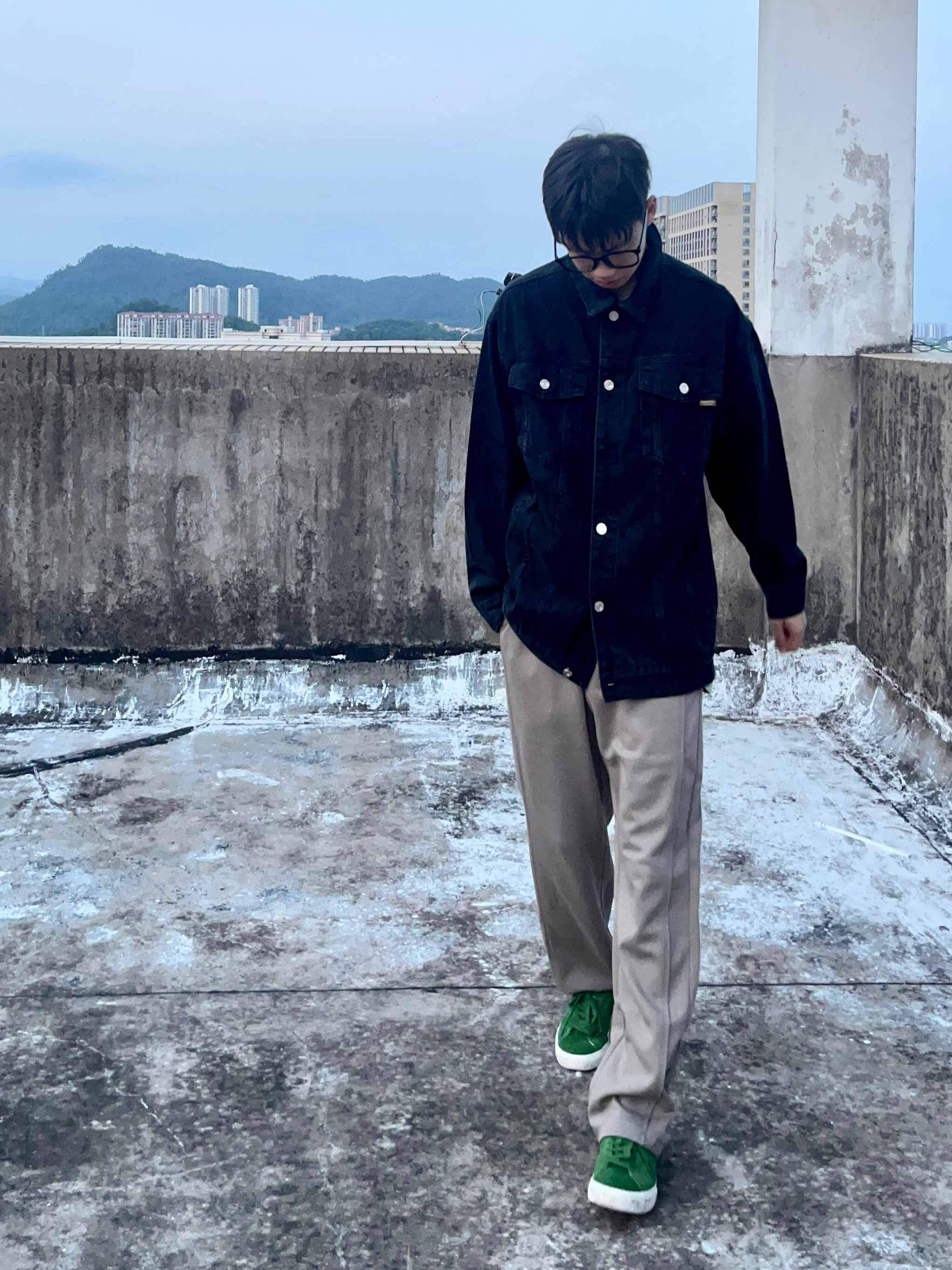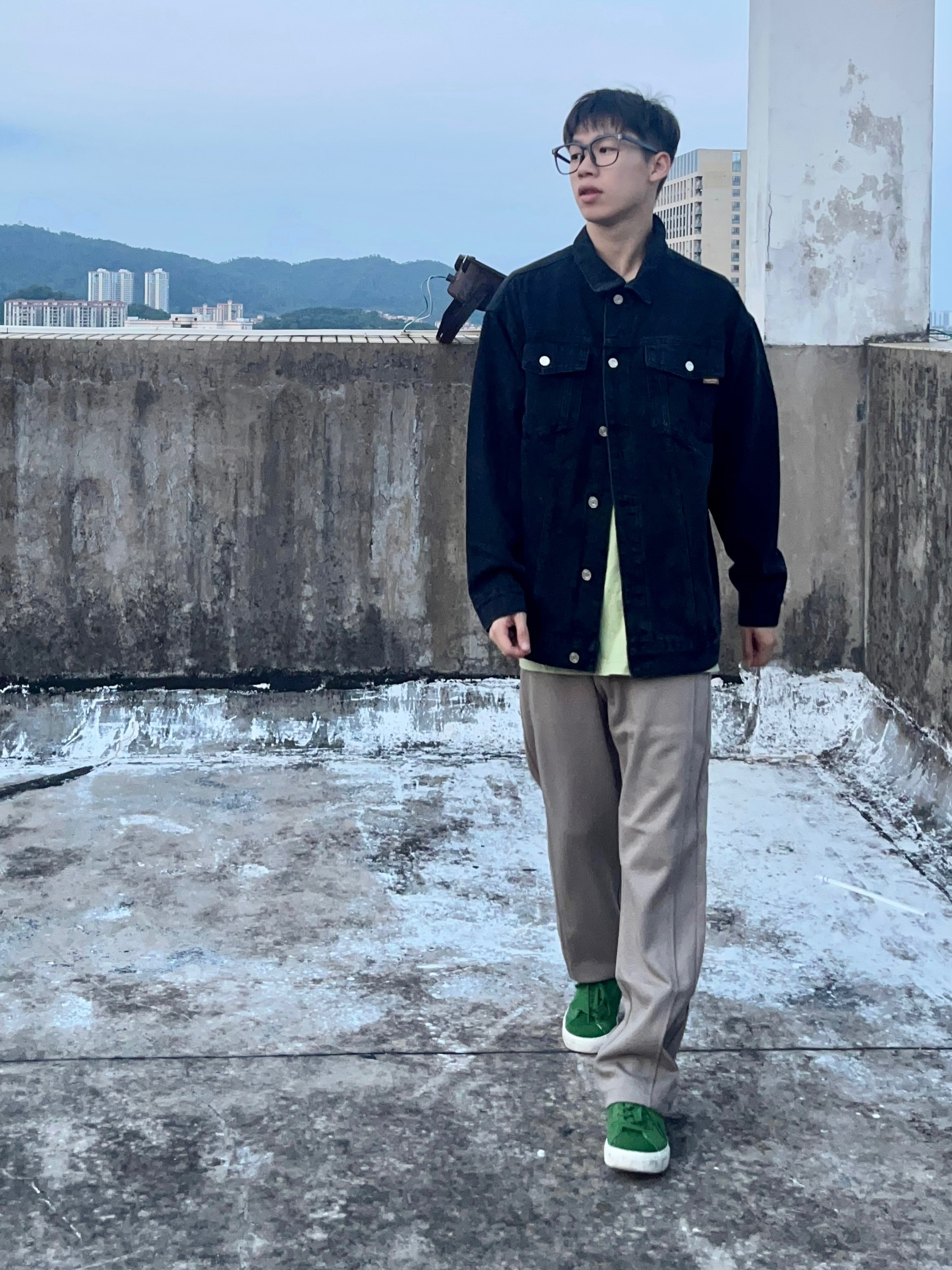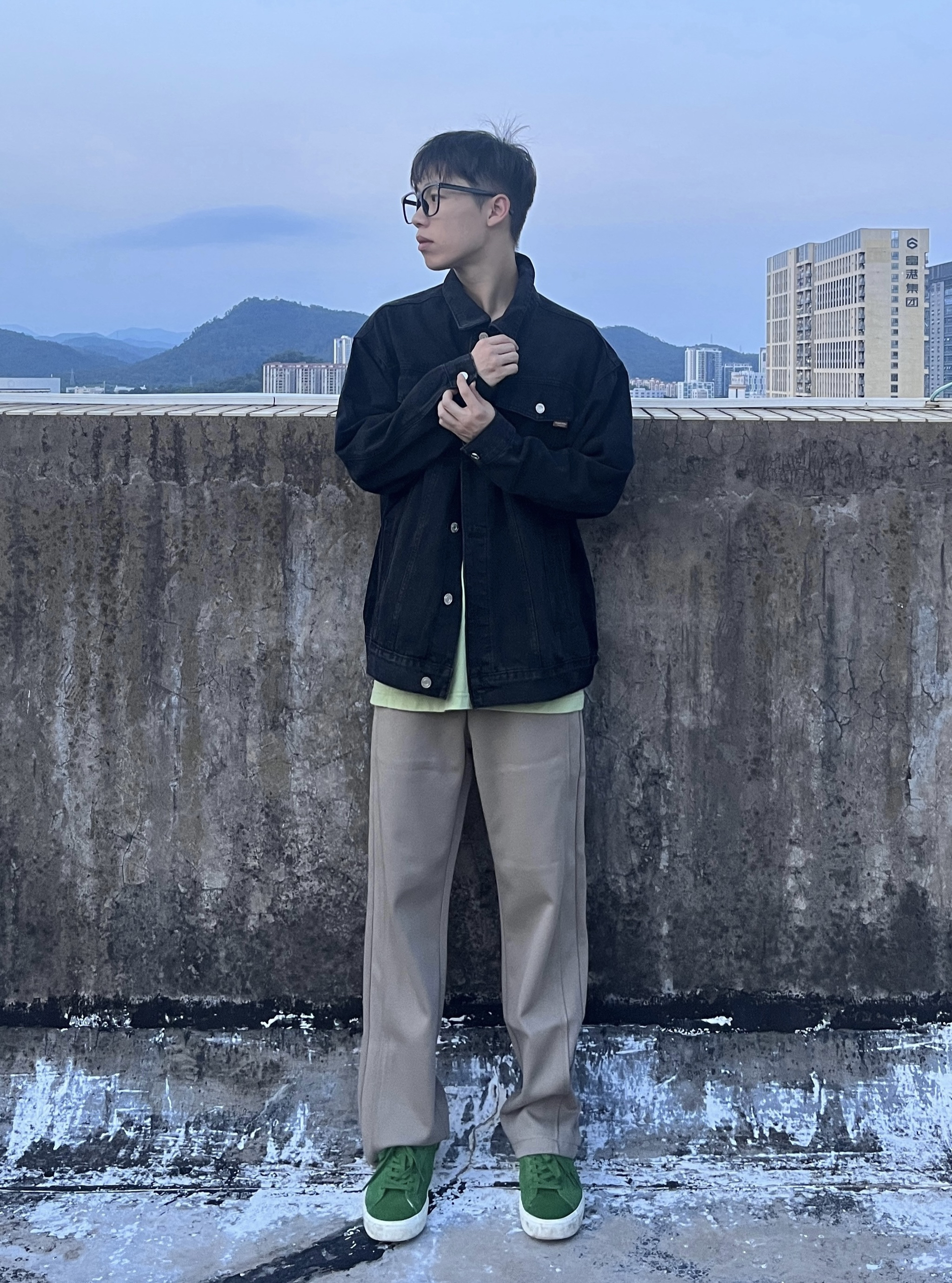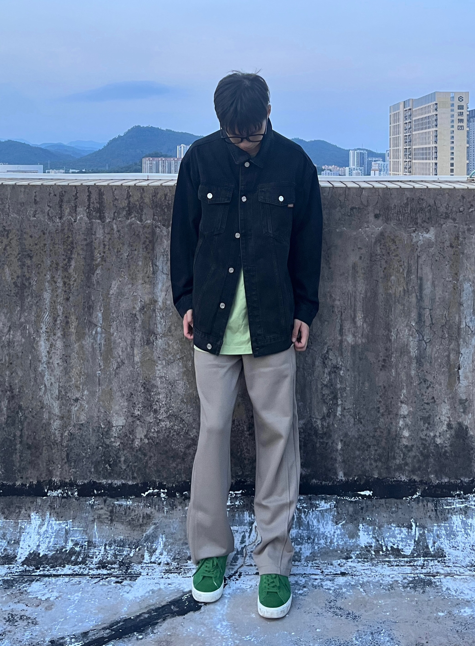 - 水洗黑工装夹克搭配浅卡其色直筒卫裤 再上脚一双绿色板鞋点缀 一套搭配显瘦舒适 校园穿搭百搭又好看 -