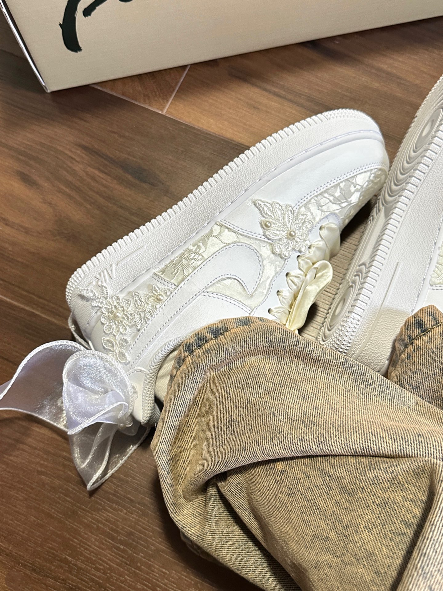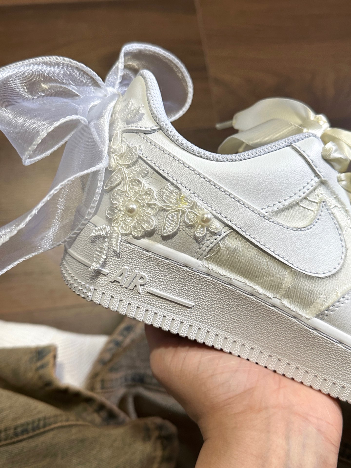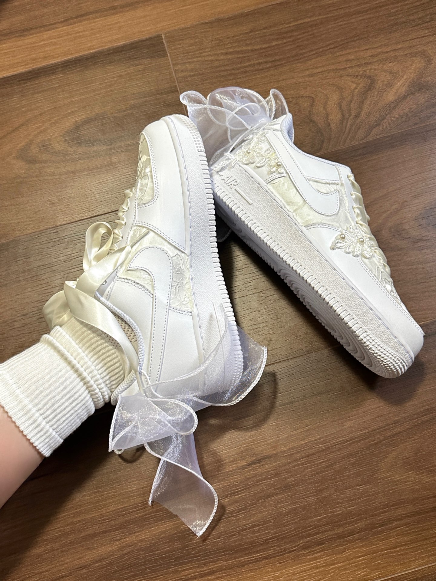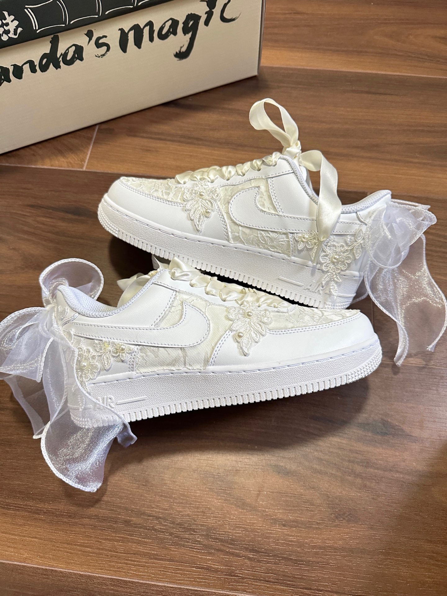 这还是我从小穿到大的空军一号吗?也太好看了吧!鞋面贴着蕾丝太梦幻了✨做工超级精致!作为从小到大都喜欢穿AF1的人来说结婚穿定制的AF1非常适合☺️后面的蝴蝶结太梦幻了🎀 #这鞋尊嘟好看吗 #神仙鞋子又来啦啦 #送给新人的结婚礼物 #谁说结婚不能穿球鞋 #耐克定制球鞋
