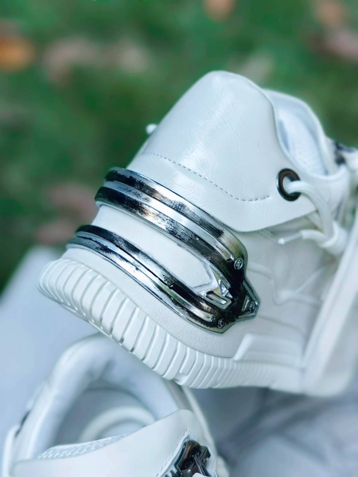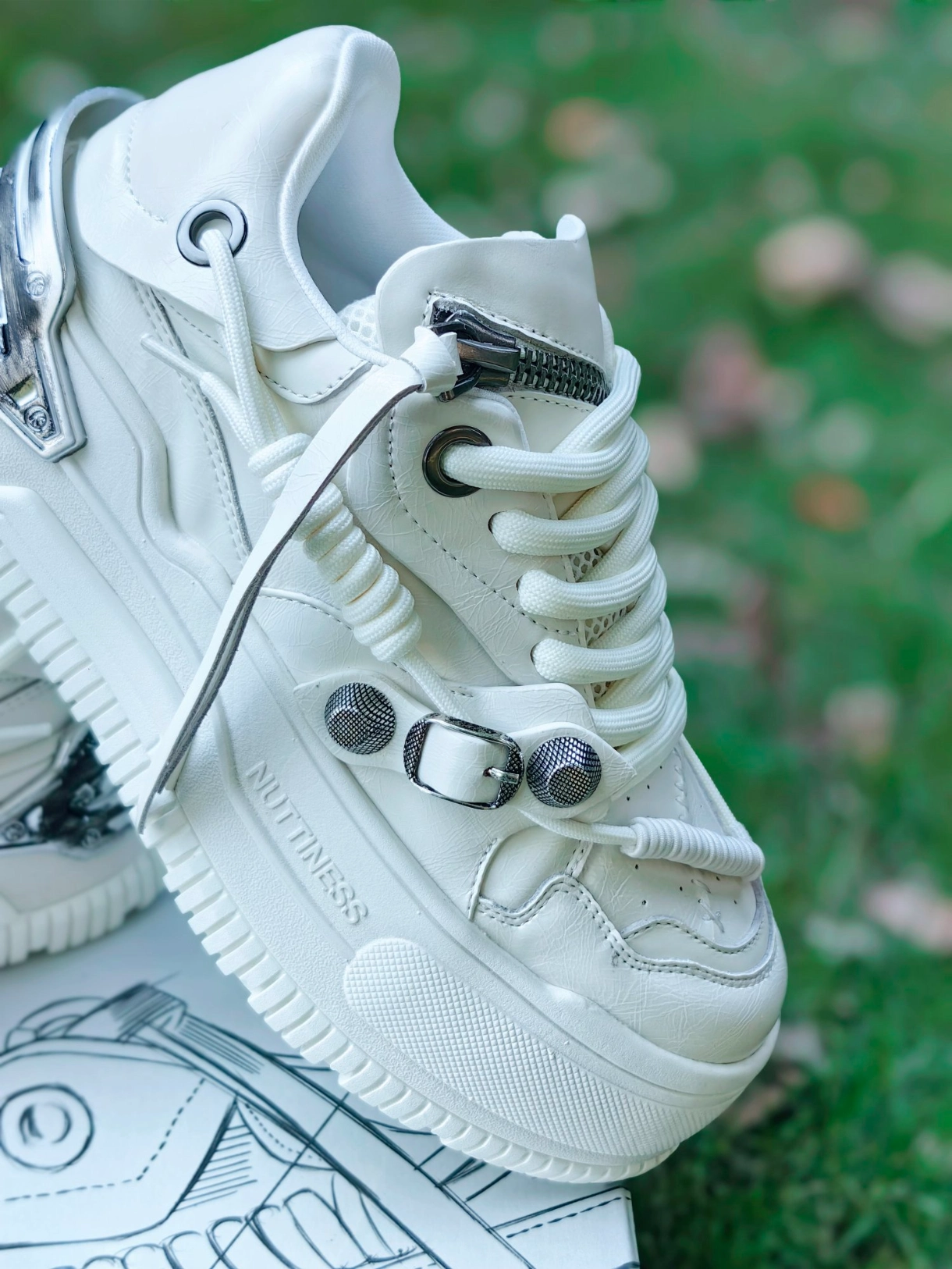 话说国潮小众板鞋也越来越好看,越来越有设计感了。这双狂野分子NUTTINESS不拘绳墨系列让人眼前一亮,面包板鞋鞋型,适合复古潮流休闲穿搭。这双是白色配色,鞋面很多设计师设计想发,双鞋舌,外层拉链设计,鞋面前部补丁缝接,双鞋带以及铆钉扣,还有后跟的机能风涂色的软质橡胶装饰,鞋底加厚轻便,可以搭配男女情侣款。这种随性的机能风街头潮流非常合适,走出自己特立独行的个性。#狂野分子厚底鞋 #被国货鞋惊艳了...
