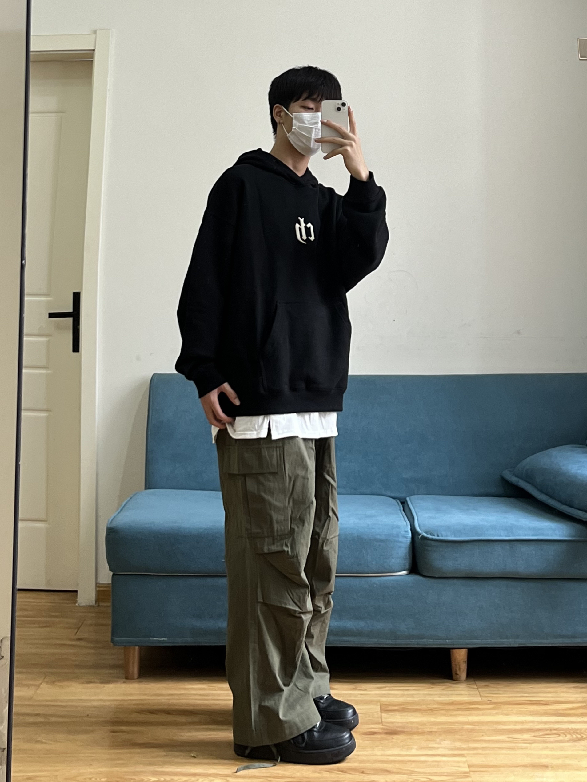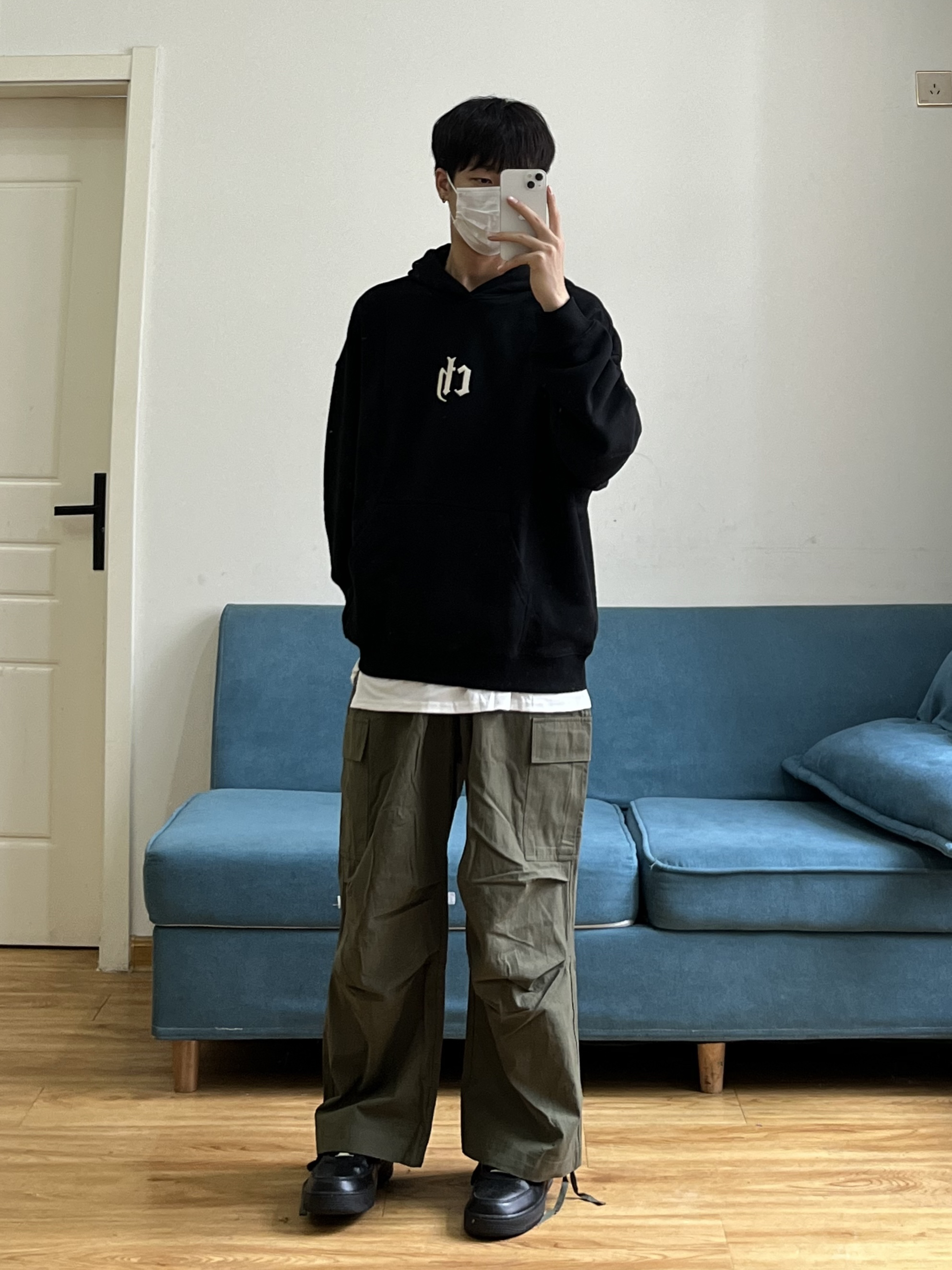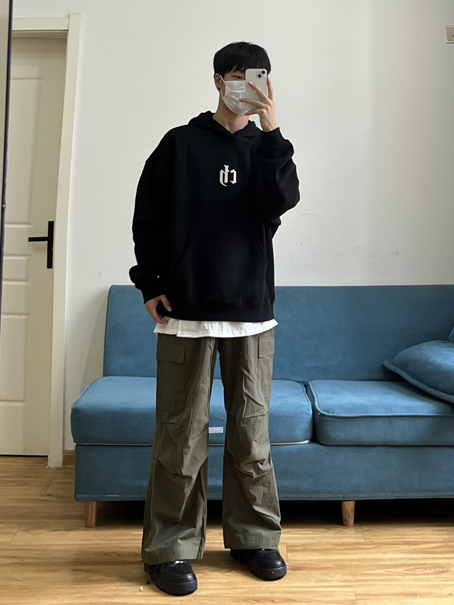 叮叮叮🔔今日穿搭分享来咯~ 📸 真的有被这件黑色的连帽卫衣帅到🎱 胸前依旧还是经典的logo刺绣设计🪡 面料是比较亲肤的,可以贴身穿🕶️ 这个版型细节也做得很到位~ 📸 这条军绿色的工装裤也太慵懒了❗️❗️ 整条裤子没有走常规工装裤的设计🧢 而是大胆尝试了褶皱的风格⚾️ 别说穿上身慵懒的感觉立马出来🫧 裤脚的绳子设计我也是蛮喜欢滴~~ 👔:黑色卫衣 👖:军绿色工装裤 👟:黑色板鞋
