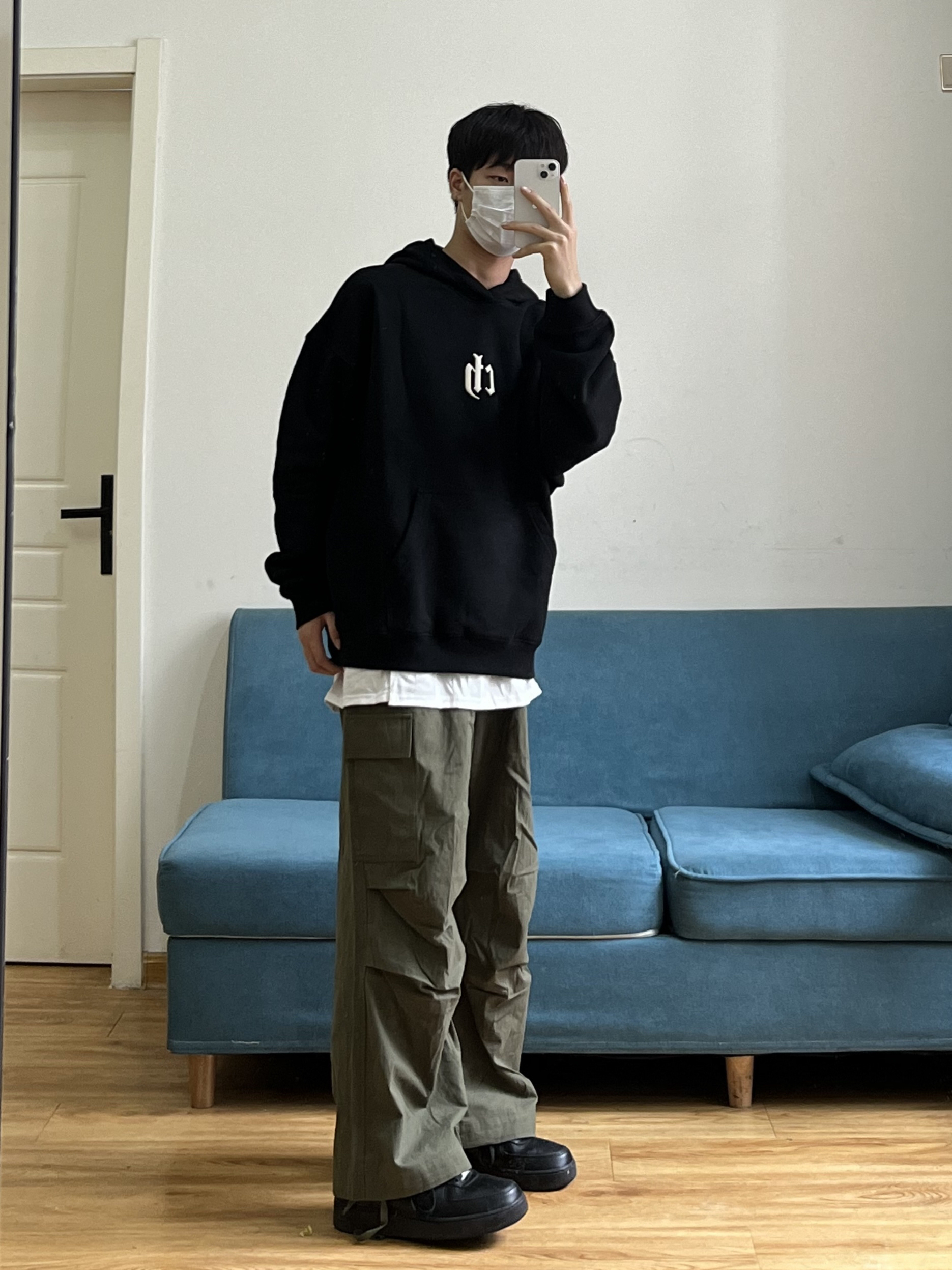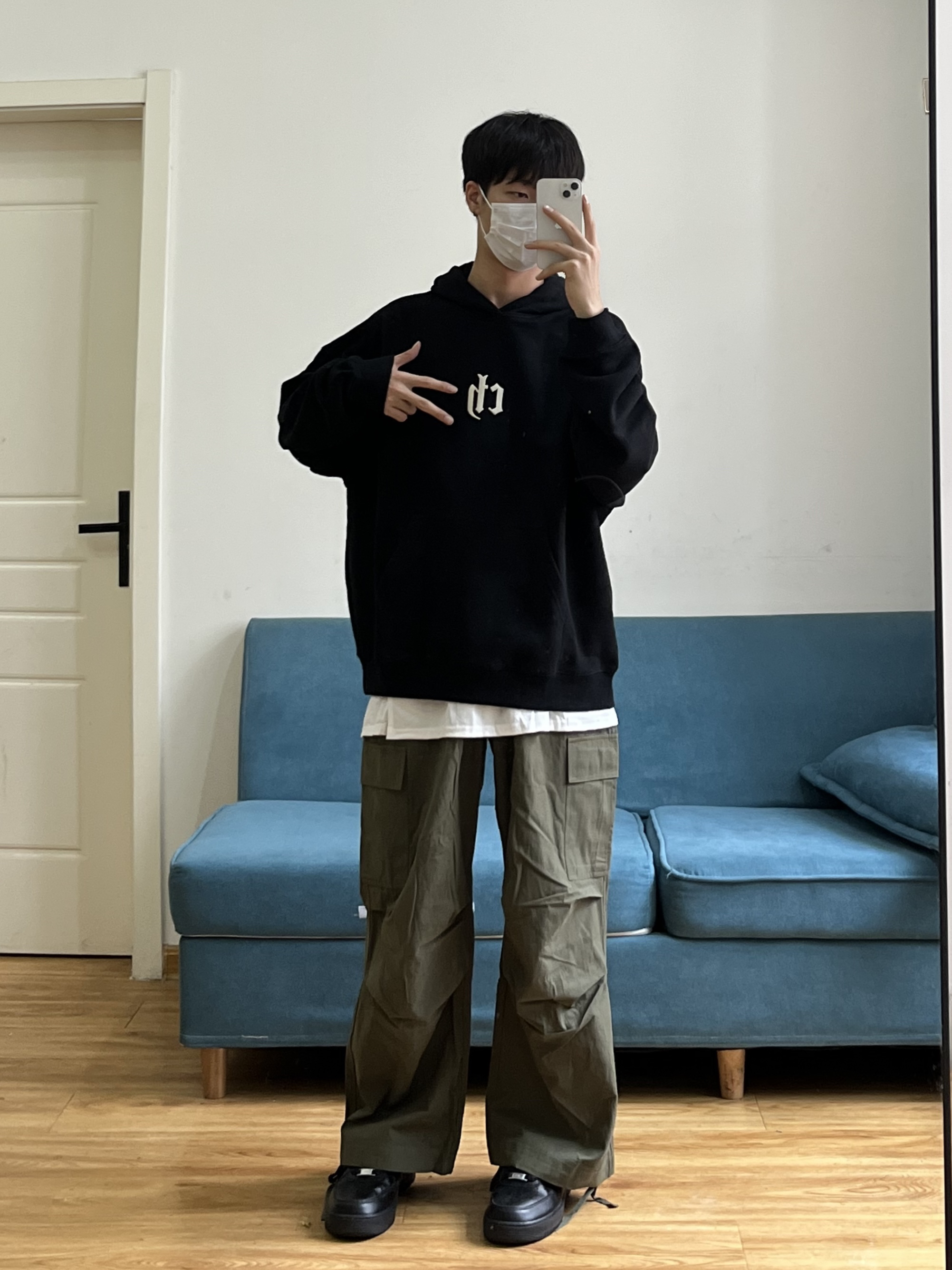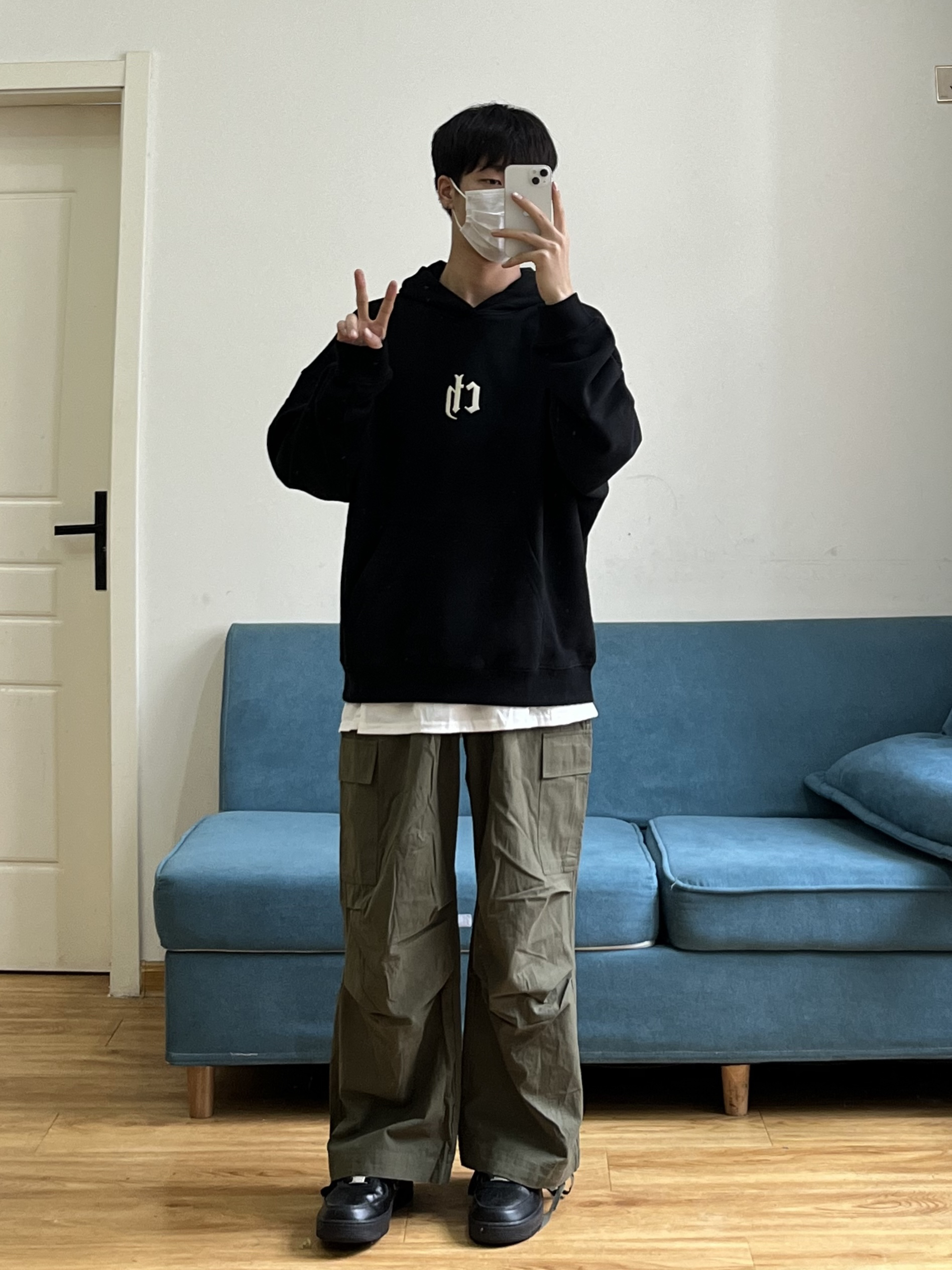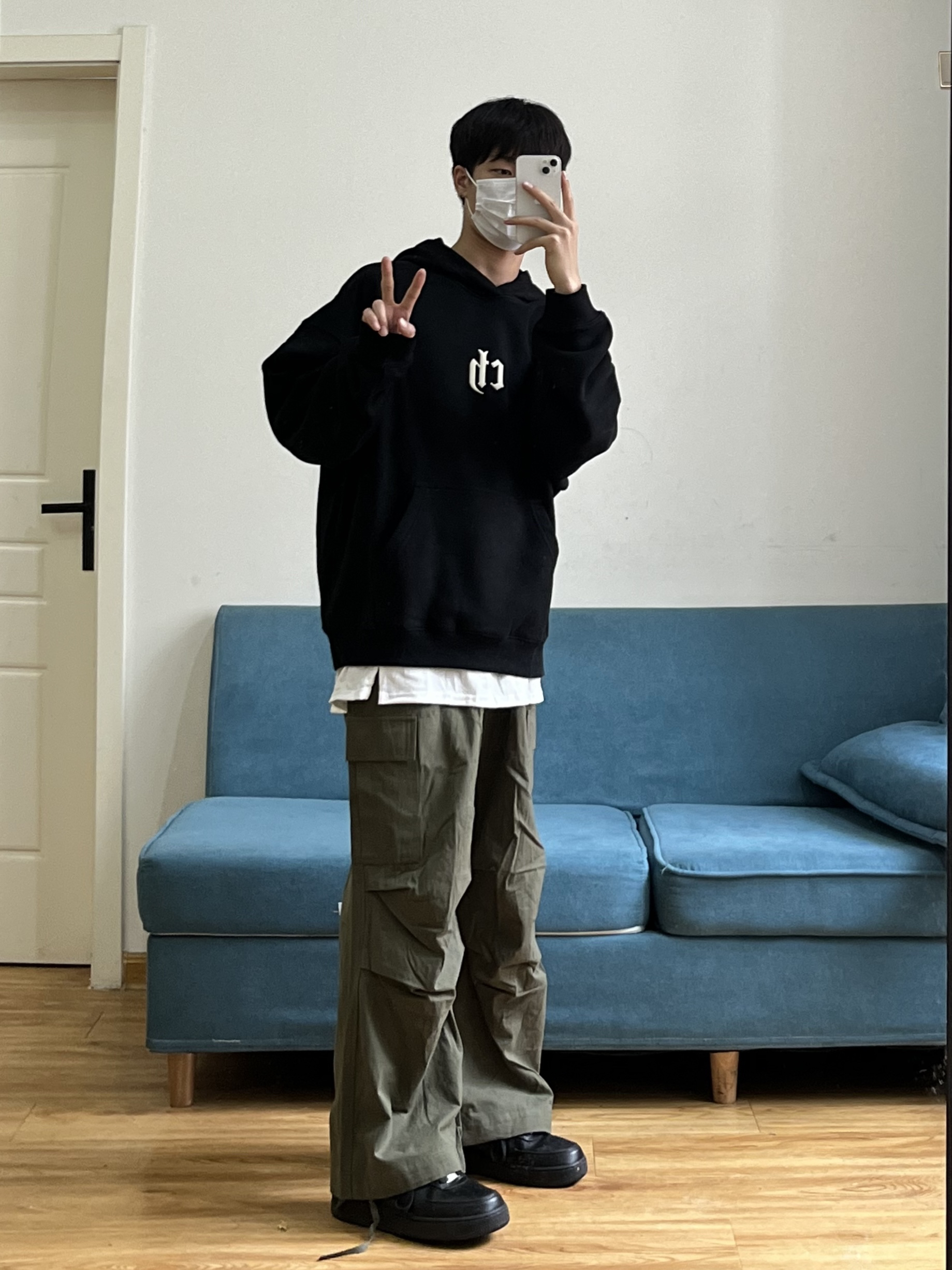叮叮叮🔔今日穿搭分享来咯~ 📸 真的有被这件黑色的连帽卫衣帅到🎱 胸前依旧还是经典的logo刺绣设计🪡 面料是比较亲肤的,可以贴身穿🕶️ 这个版型细节也做得很到位~ 📸 这条军绿色的工装裤也太慵懒了❗️❗️ 整条裤子没有走常规工装裤的设计🧢 而是大胆尝试了褶皱的风格⚾️ 别说穿上身慵懒的感觉立马出来🫧 裤脚的绳子设计我也是蛮喜欢滴~~ 👔:黑色卫衣 👖:军绿色工装裤 👟:黑色板鞋