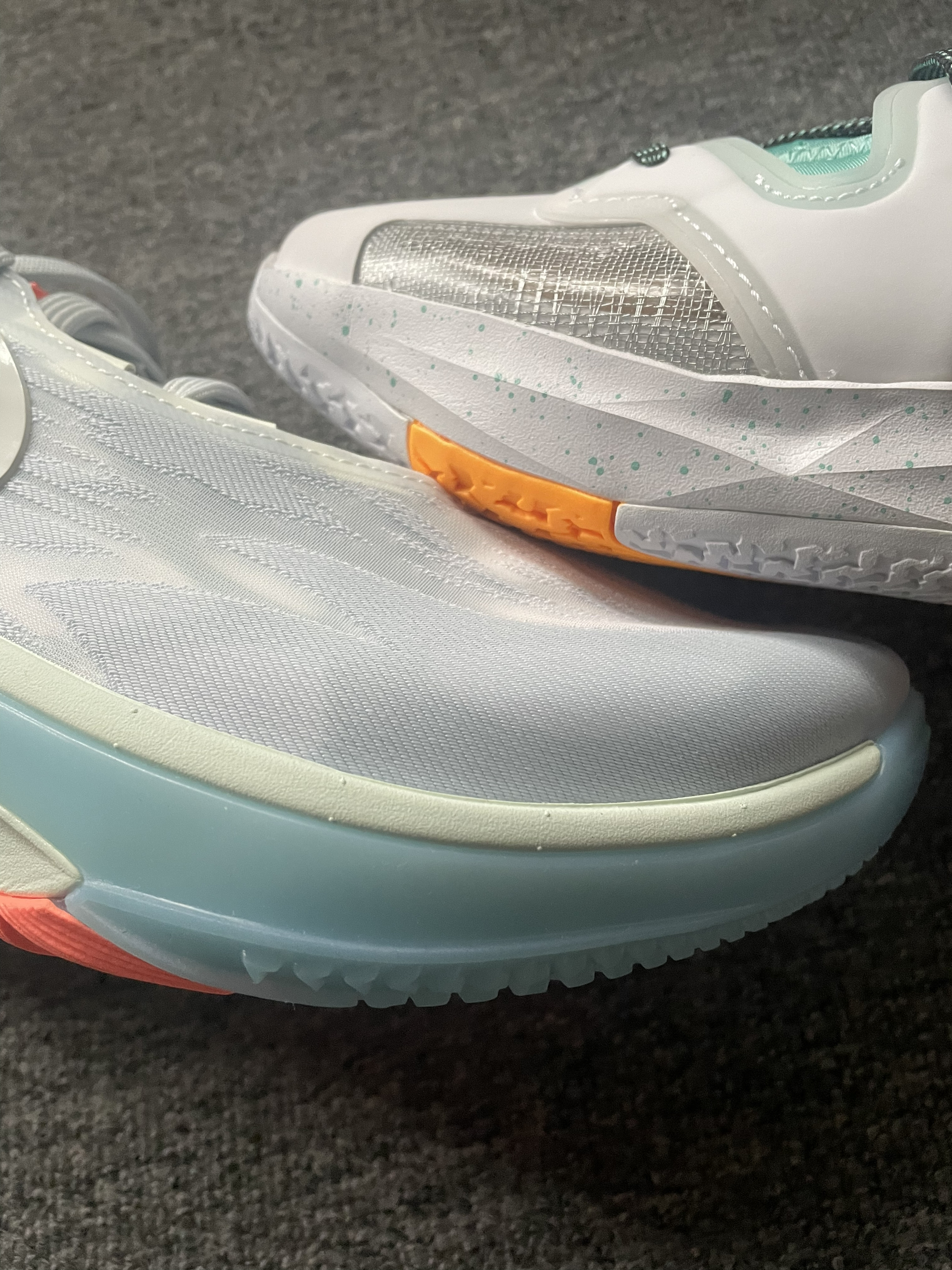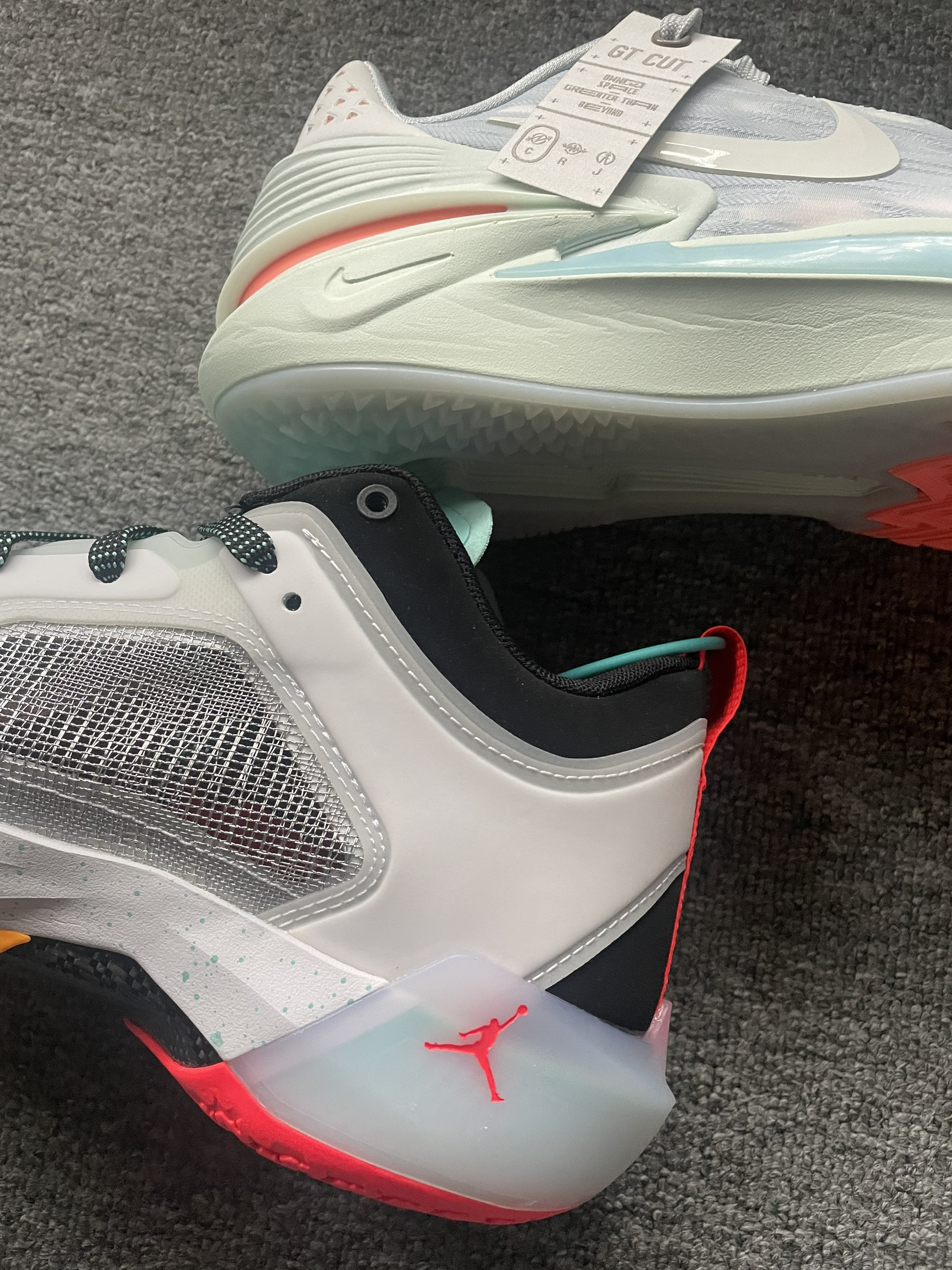 Air Jordan 37 low Guo PF 郭艾伦 网纱加太空棉加橡塑材料鞋面,包裹支撑不错! 中底前掌双层Zoom Air 气垫加后掌F23缓震泡棉前弹后韧,脚感非常不错,中底还有一块碳板加持,稳定性和抗扭都非常不错。 外底为XDR橡胶大底,抓地力和耐磨表现不错! Nike Air Zoom G.T.CUT 2.0 灰色 鞋面为织物鞋面加太空棉鞋舌结合后跟皮革拼接组成,...