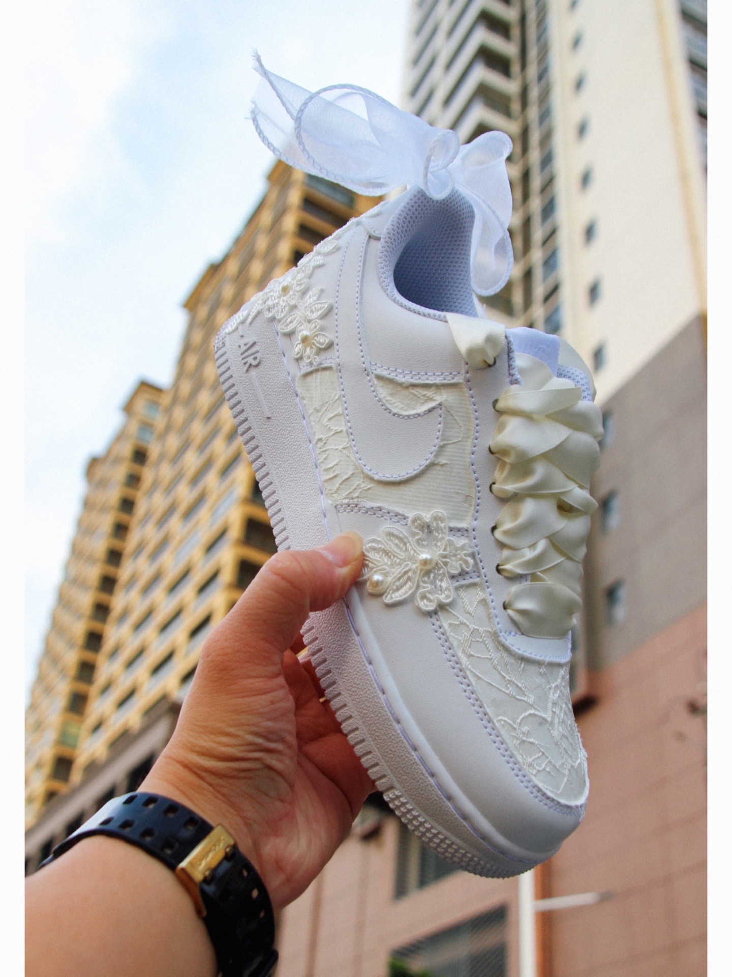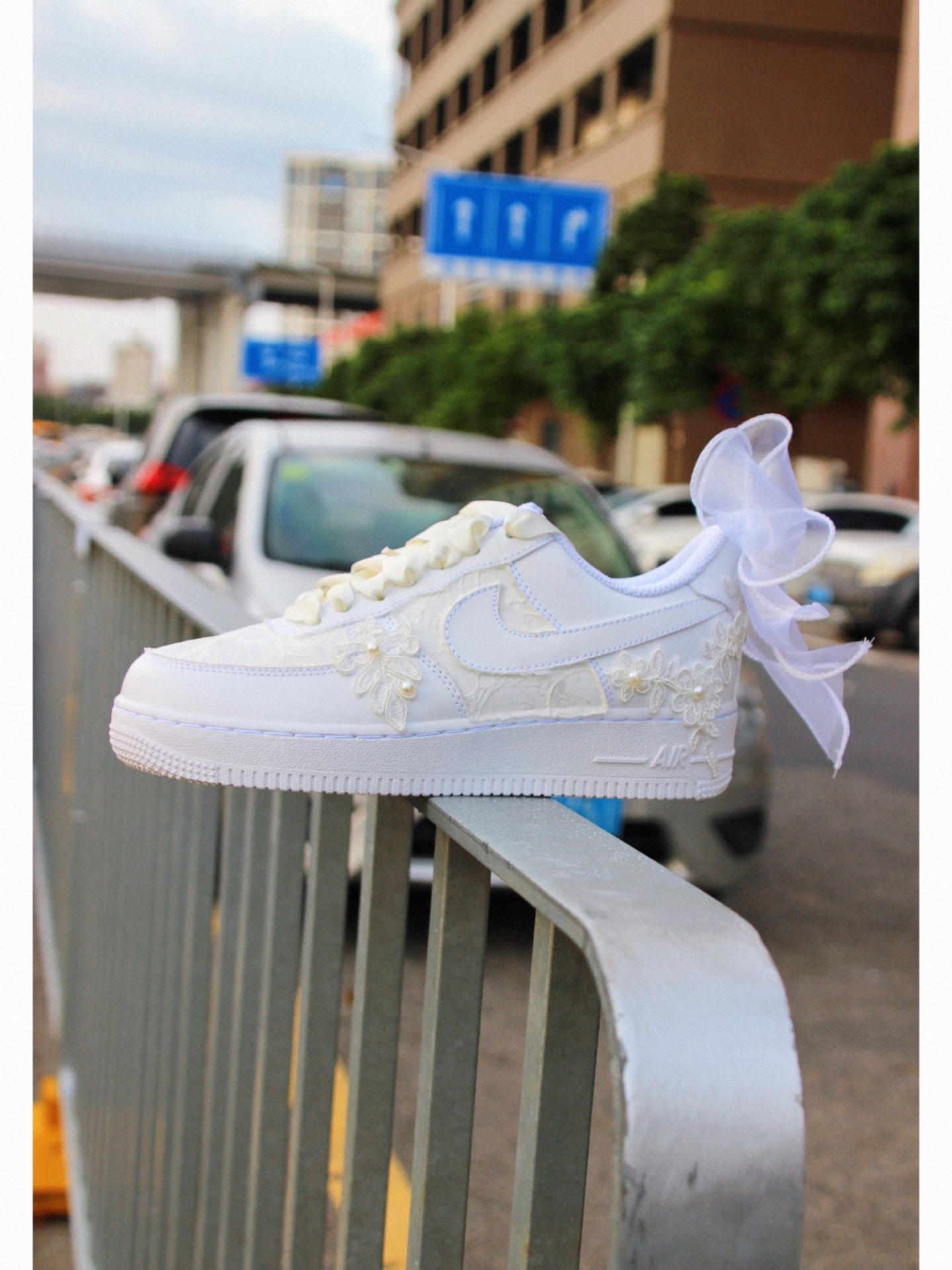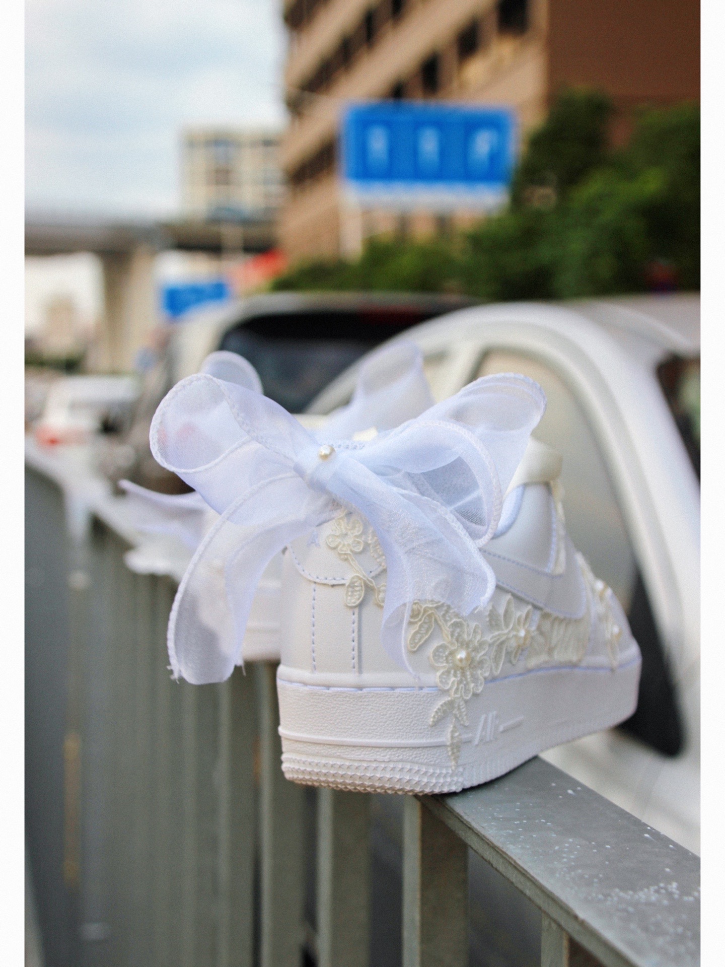 这双定制的蕾丝贴面空军一号真的很好看,特别后跟的蝴蝶结🎀特别应景,花与珍珠完美匹配在一起,白色丝带鞋带象征着纯洁的爱情,让婚纱除了高跟鞋以后,板鞋也能搭配出不一样的味道! 在特殊的日子里,收获特别的幸福,穿着时尚的蕾丝婚鞋与另一半踏入婚姻的殿堂,享受甜蜜的幸福时光。 #婚鞋推荐 #结婚婚鞋 #适合做婚鞋的球鞋 #无法拒绝的秋日时尚鞋 #婚礼婚鞋