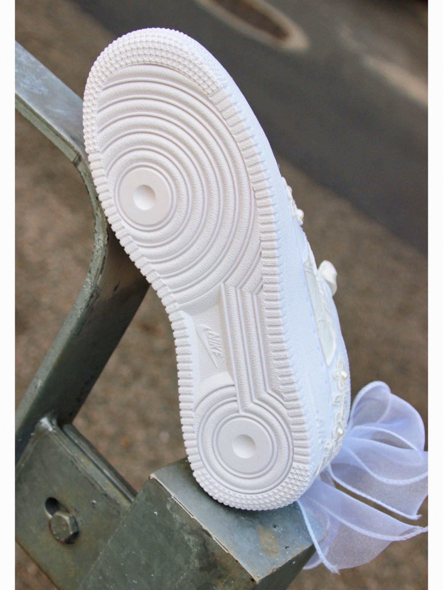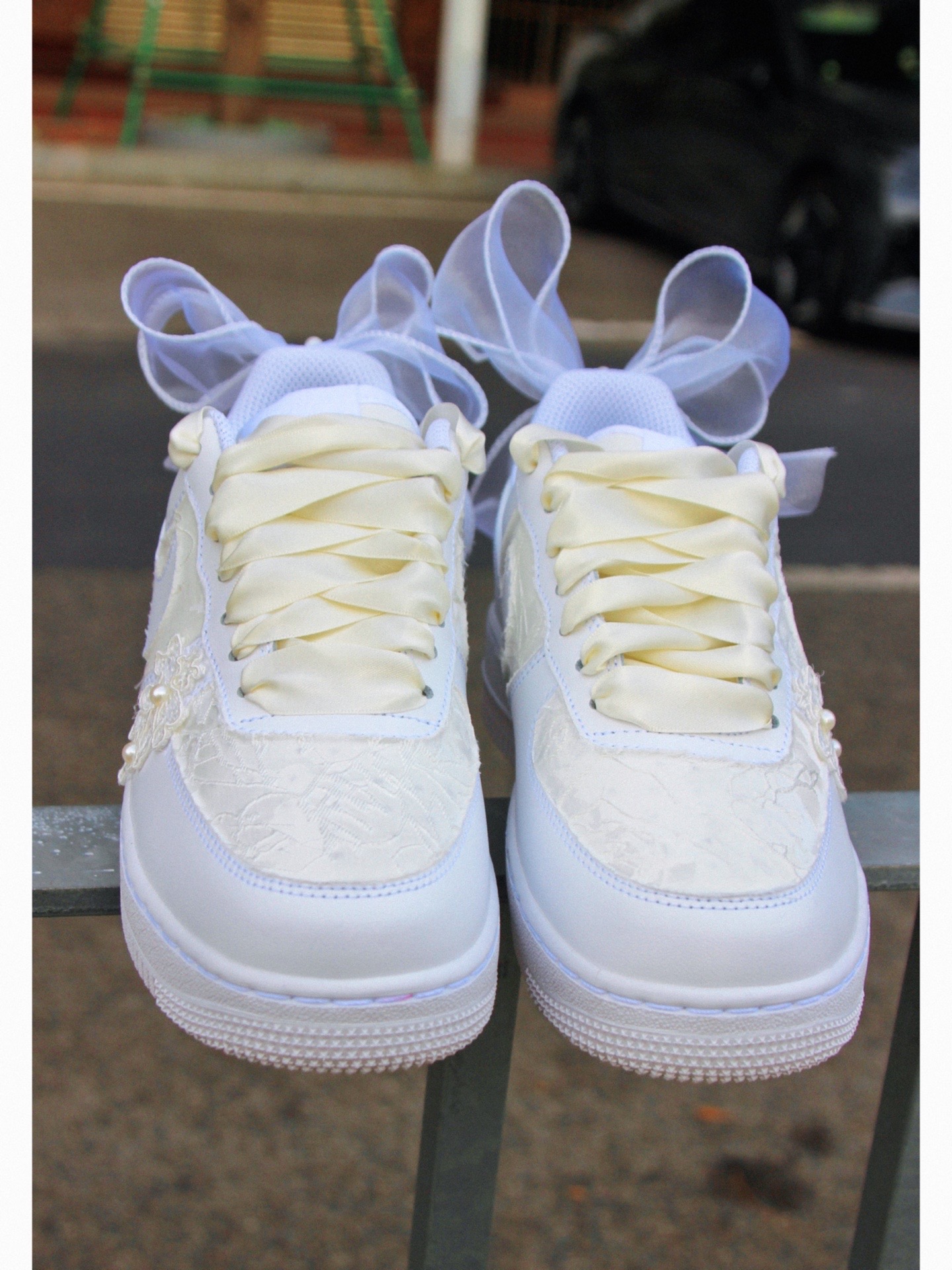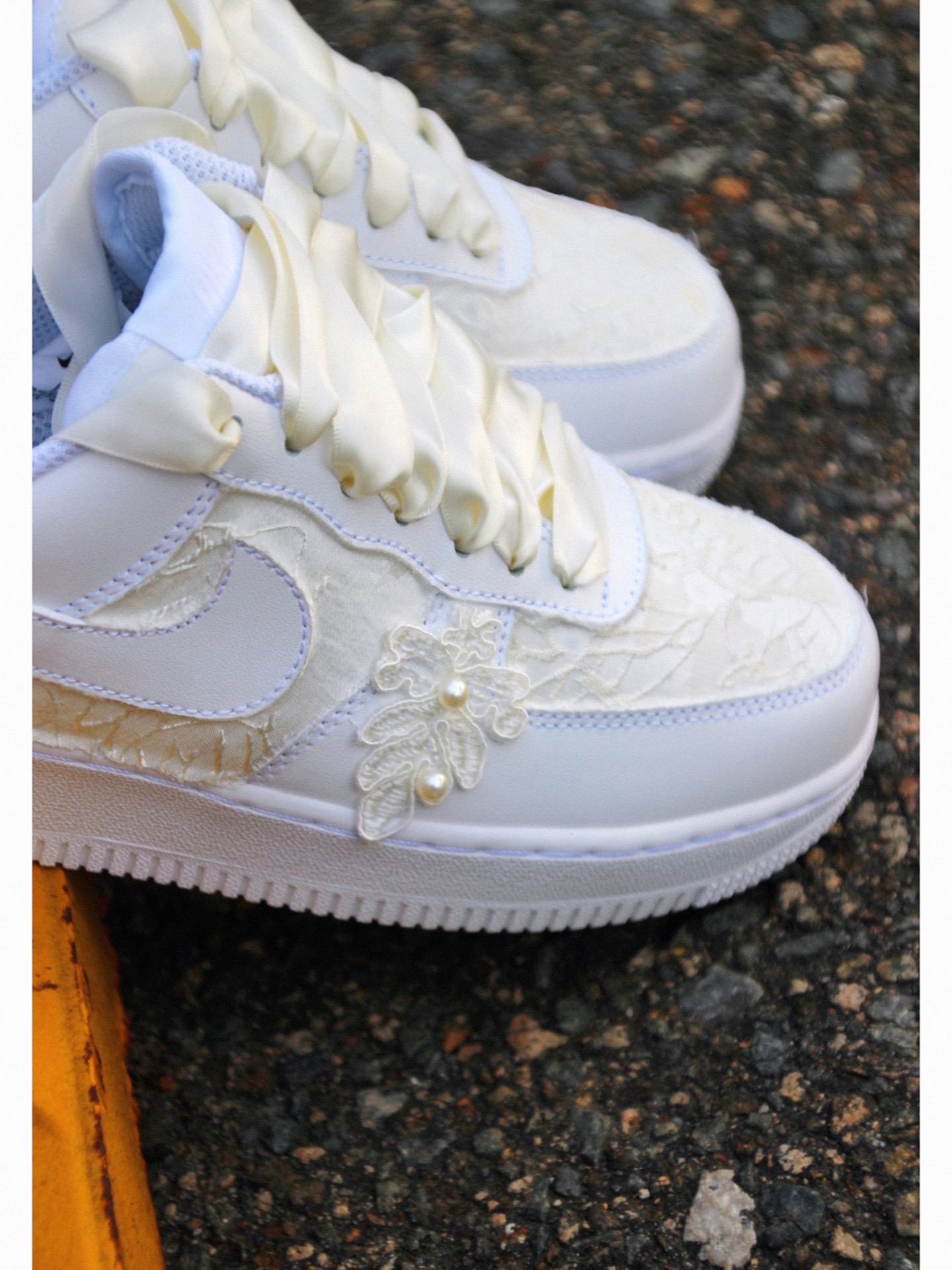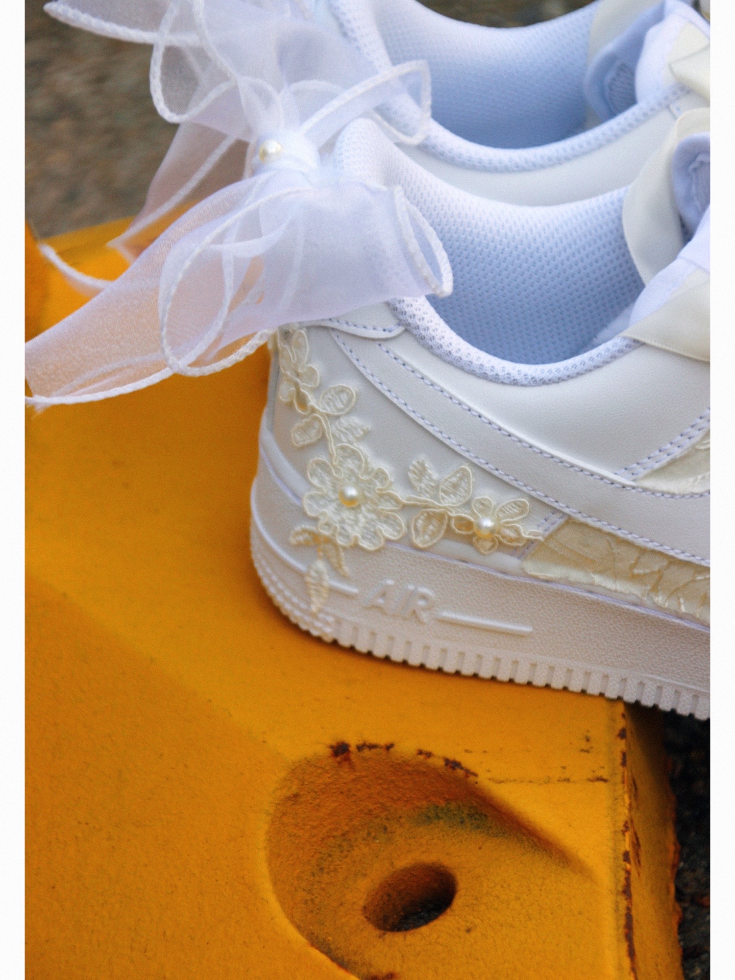 这双定制的蕾丝贴面空军一号真的很好看,特别后跟的蝴蝶结🎀特别应景,花与珍珠完美匹配在一起,白色丝带鞋带象征着纯洁的爱情,让婚纱除了高跟鞋以后,板鞋也能搭配出不一样的味道! 在特殊的日子里,收获特别的幸福,穿着时尚的蕾丝婚鞋与另一半踏入婚姻的殿堂,享受甜蜜的幸福时光。 #婚鞋推荐 #结婚婚鞋 #适合做婚鞋的球鞋 #无法拒绝的秋日时尚鞋 #婚礼婚鞋