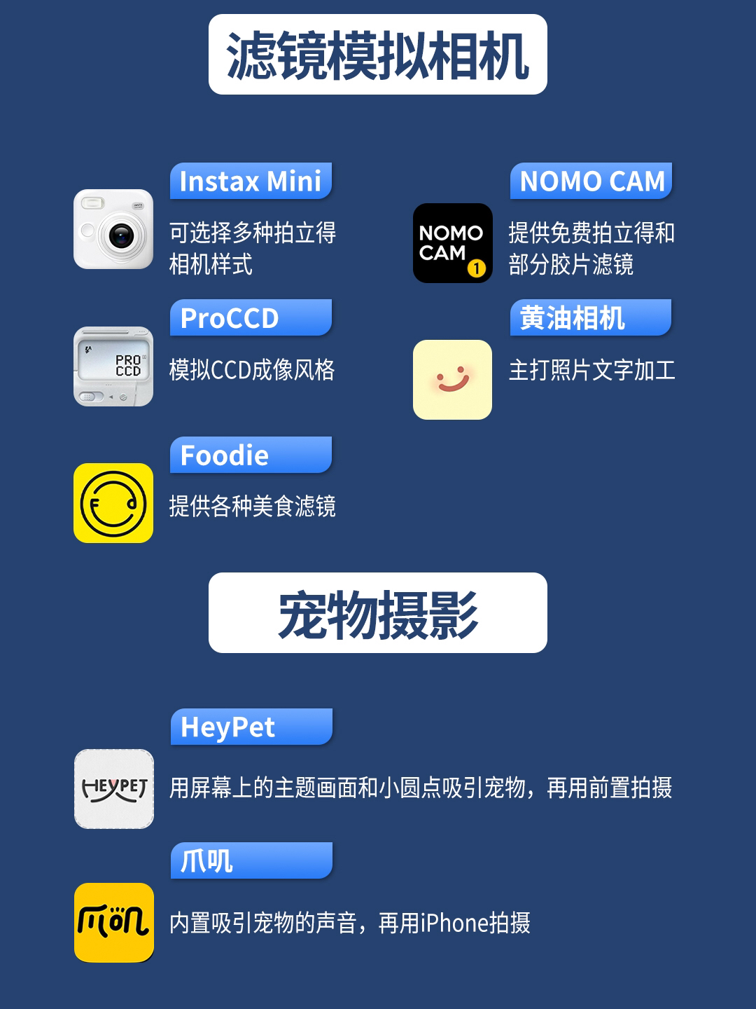 滤镜模拟相机: (1)Instax Mini:可选择多种拍立得相机样式,但取景拍摄框为圆形,与现实拍立得相机的方形取景框有所差异 (2)ProCCD:模拟CCD成像风格,还可添加CCD相机的日期水印,有了这个APP还买CCD相机干啥 (3)Foodie:提供起司、牛排、烧烤等各种美食滤镜,拍完看着就让人食欲满满。 (4)NOMO CAM:部分拍立得和胶片滤镜免费,界面操作和滤镜成像模拟还原度...