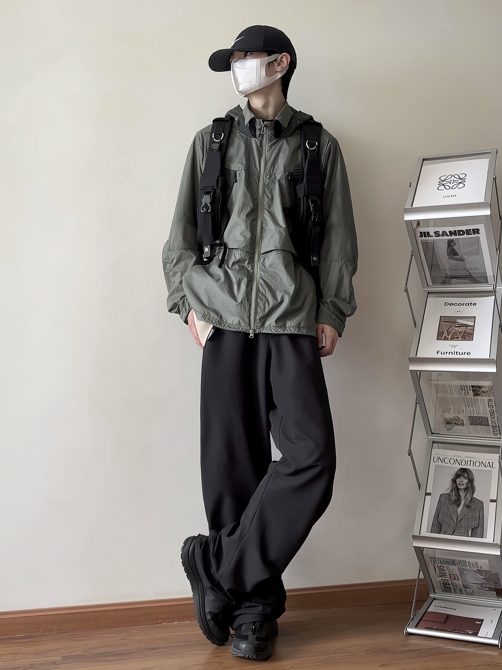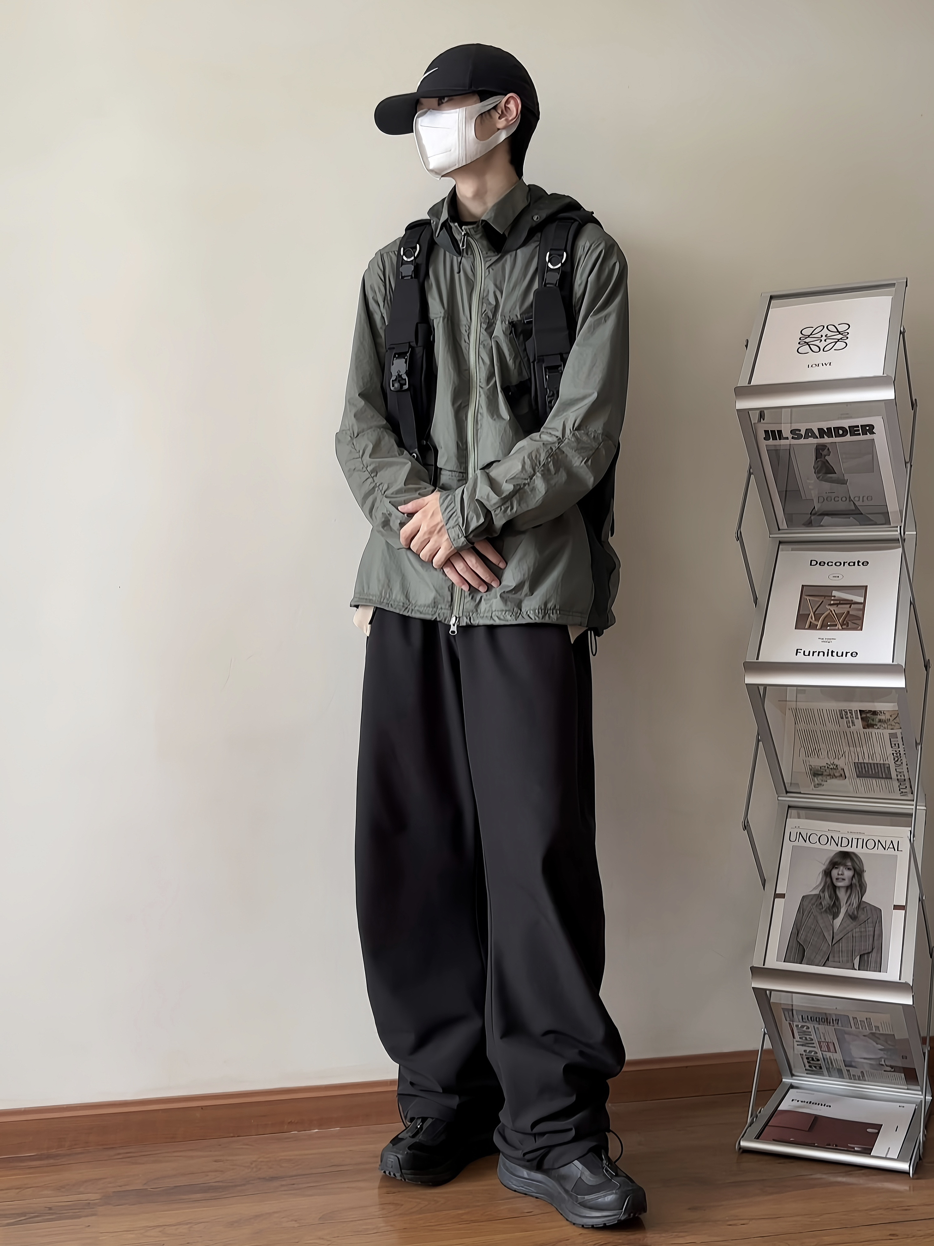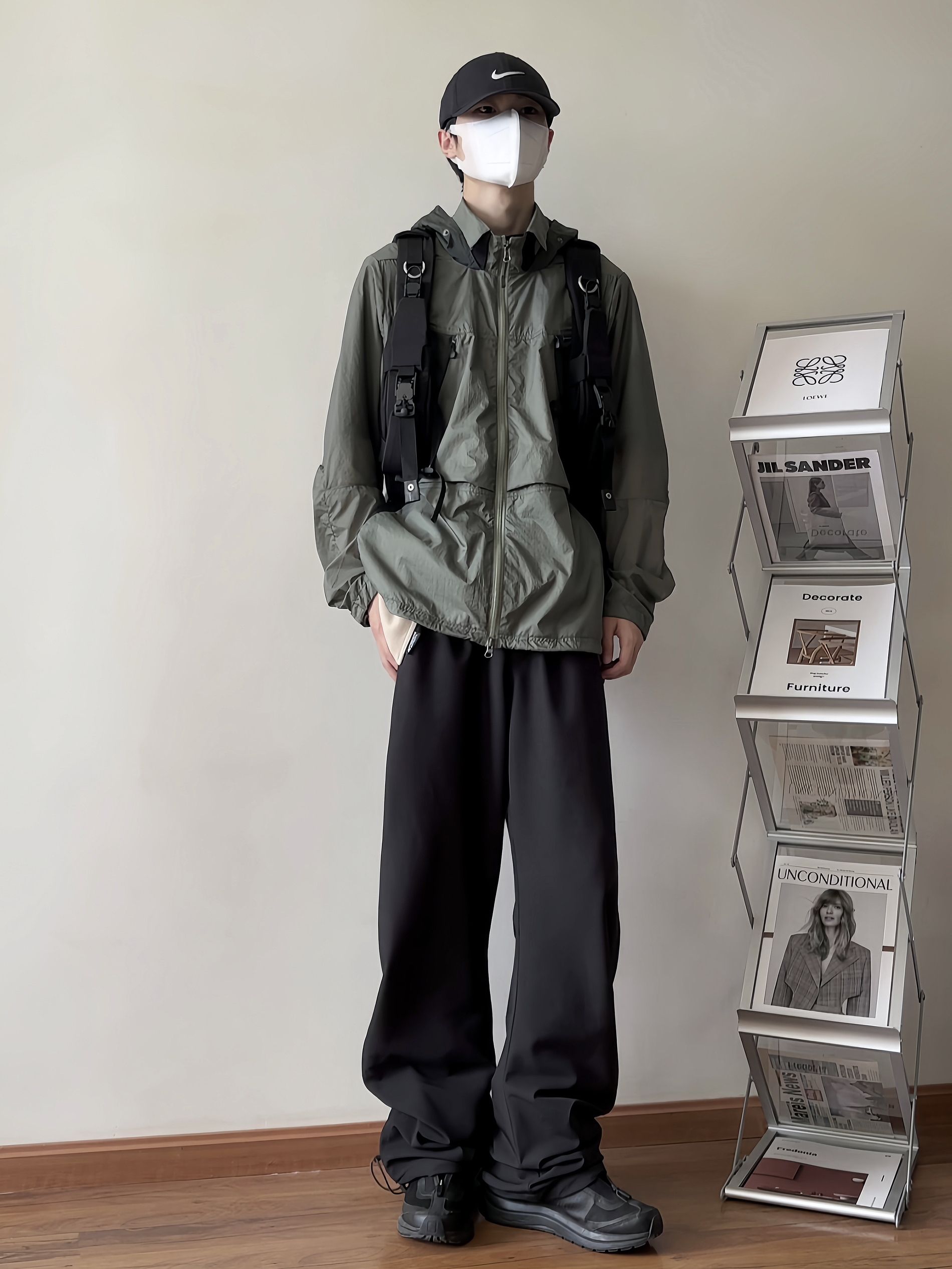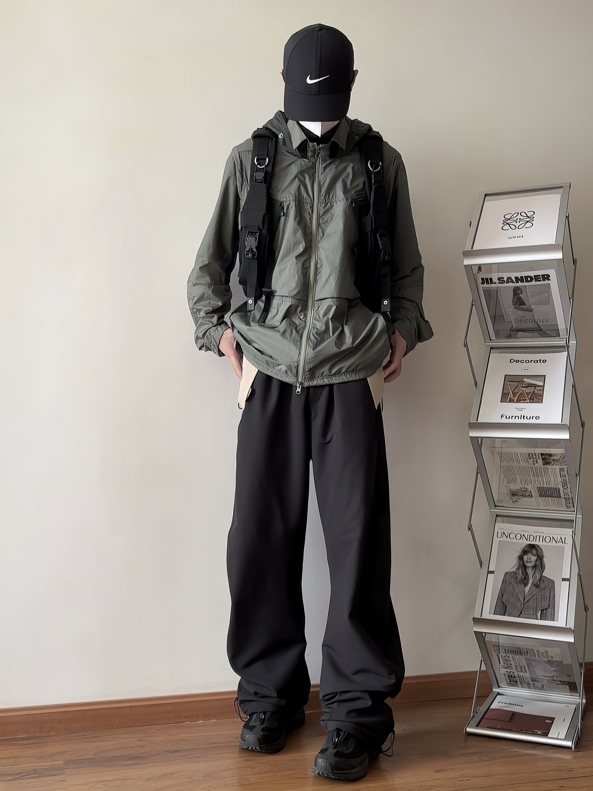上身军绿色外套防晒又易搭✨ 外面再套一件黑色机能马甲丰富整体造型效果 裤子简单选择一条黑色阔腿机能西裤👖 最后鞋子来双黑色高帮机能靴 主打一个黑色与军绿的机能穿搭就完成了☑️