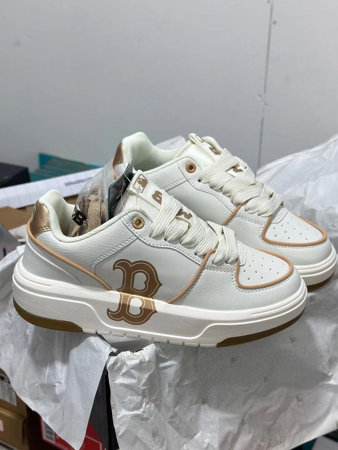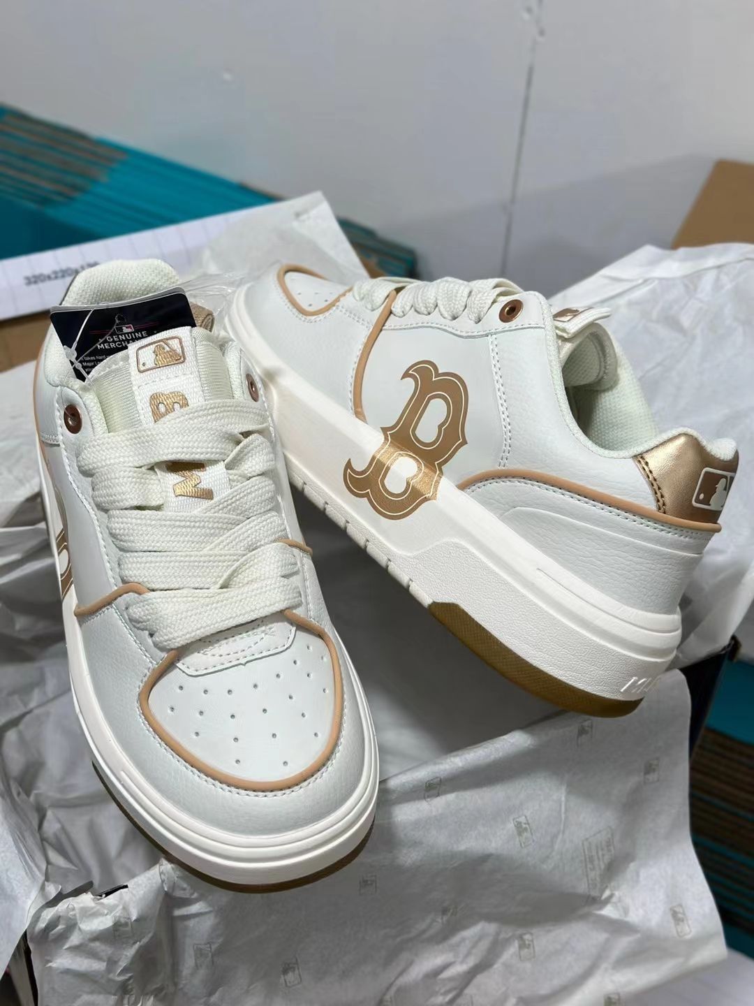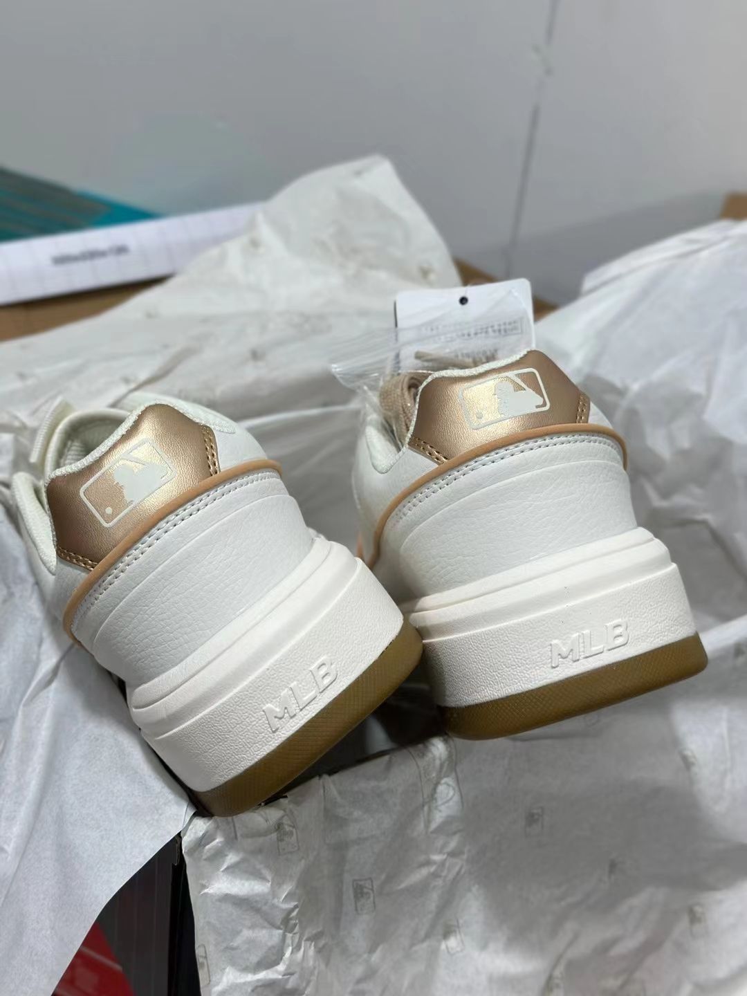 这双小白鞋真的好看 mlb logo印在上面 金色印花在鞋子上面 真的很好看爱了爱了