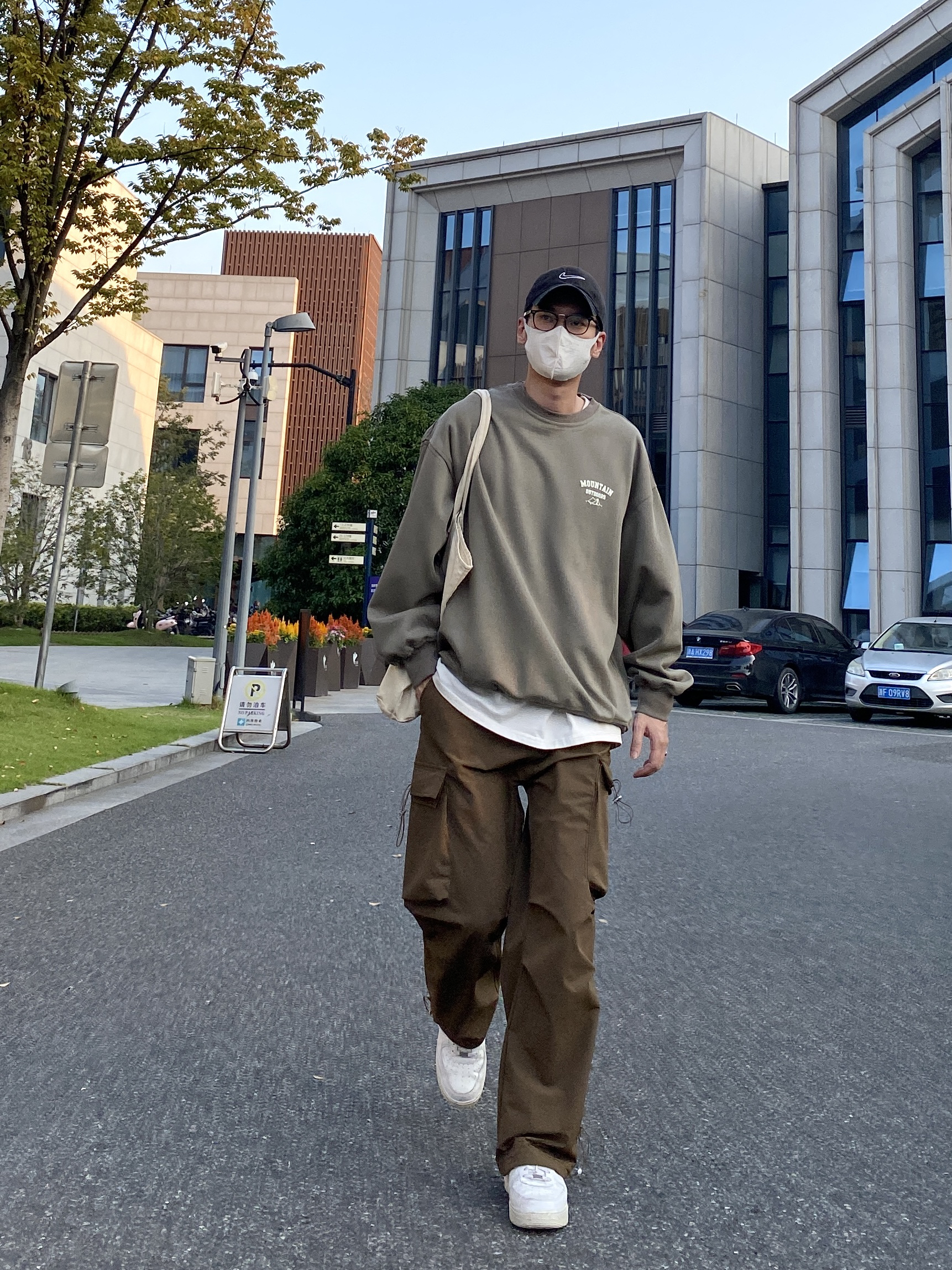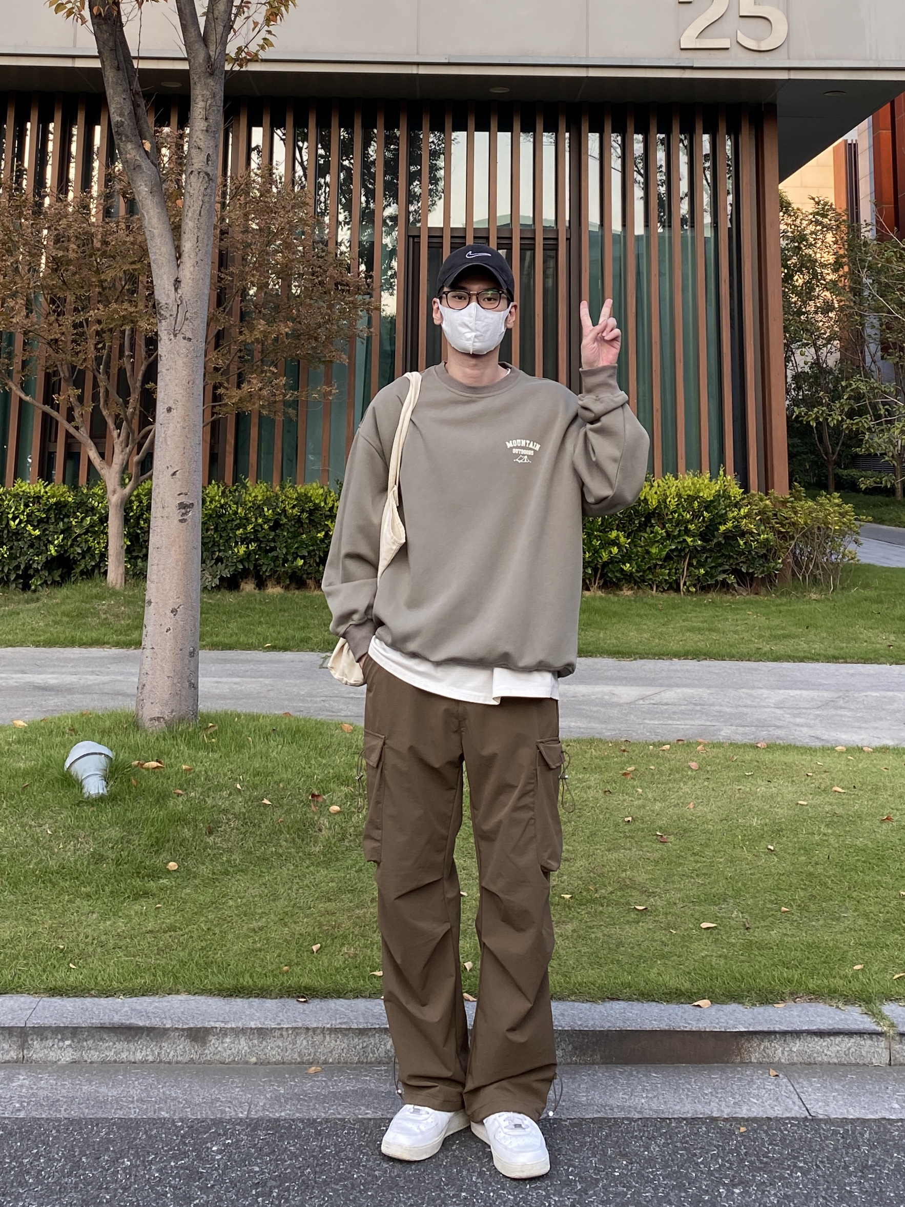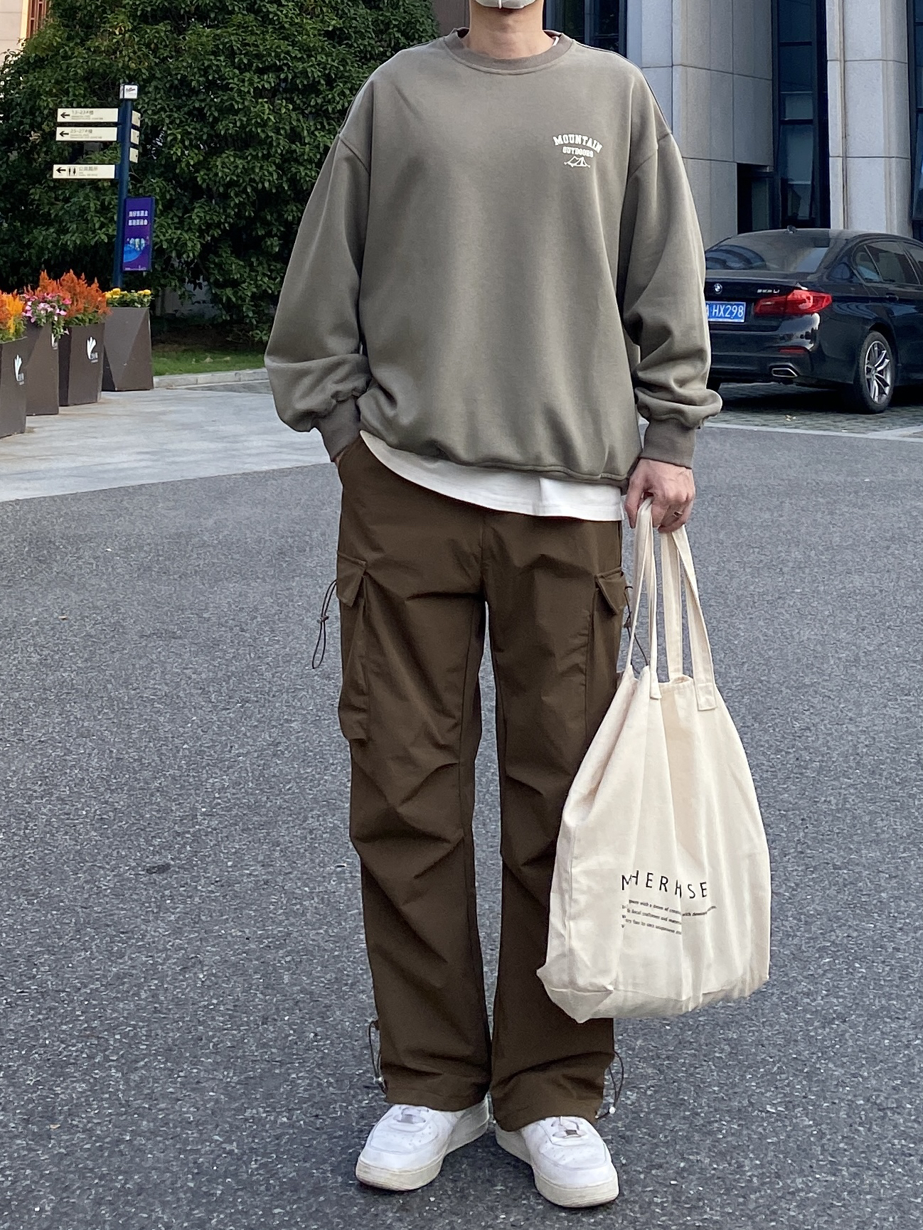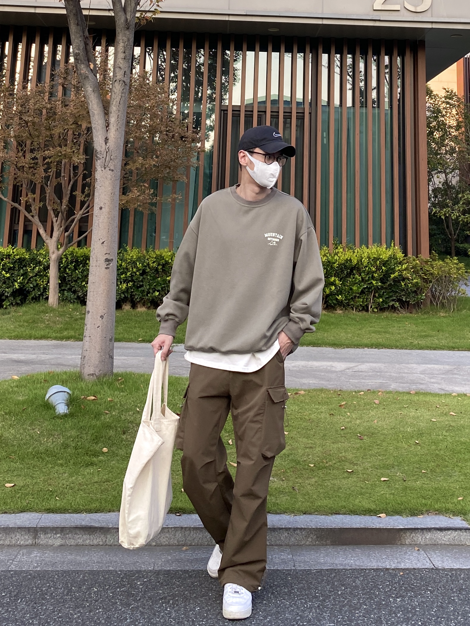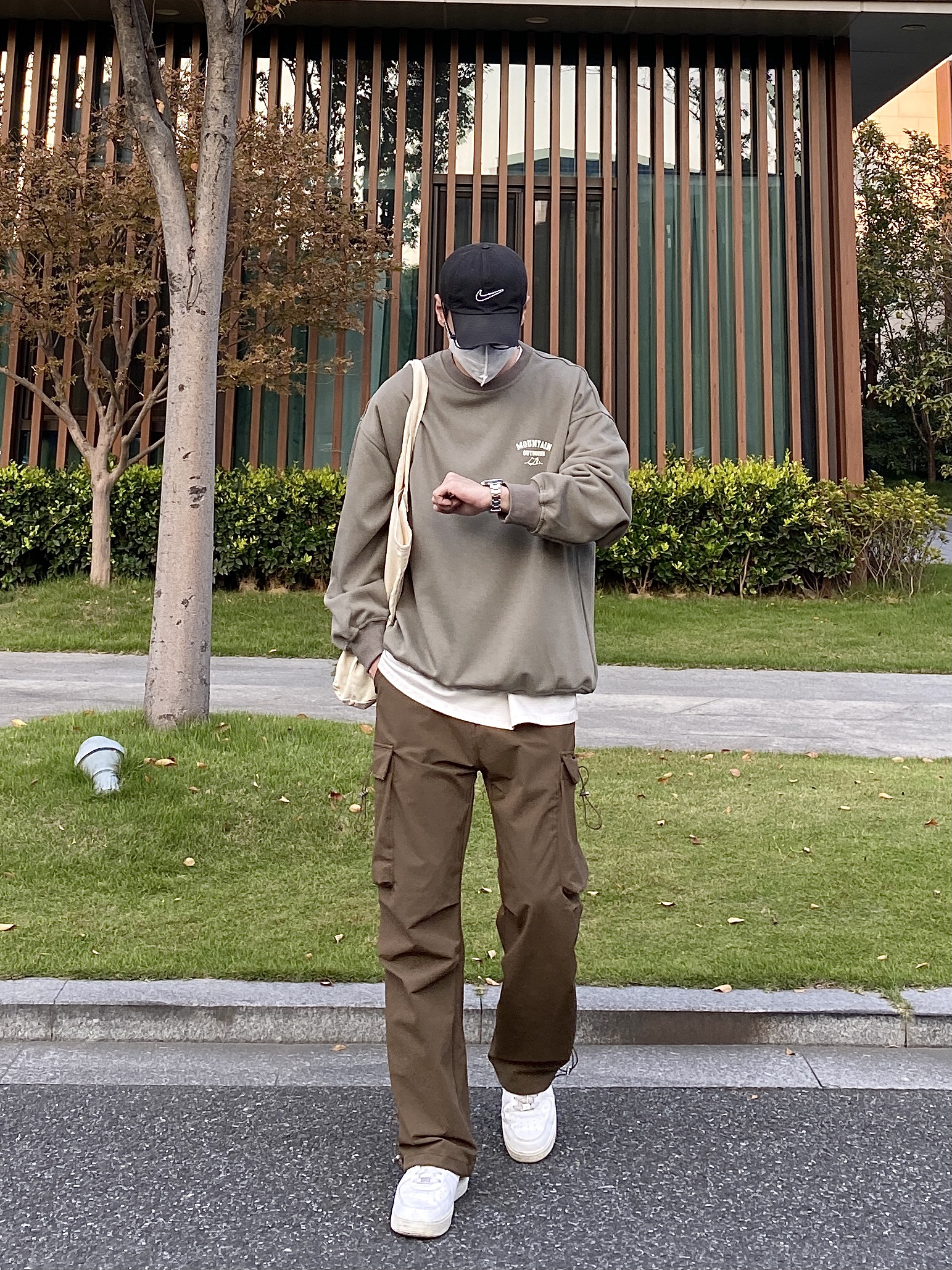 今天这套先用圆领白T做打底,裤子选择咖啡色直筒抽绳系带多口袋机能伞兵裤,鞋子上脚清爽干净的纯白色AF1,接着套上绿色宽松阔版重磅字母印花套头卫衣,最后背一个大容量帆布托特包,OK,出门看看搭配效果吧! - 今日穿搭 衣服裤子:NICE LILI 鞋子:AF1纯白