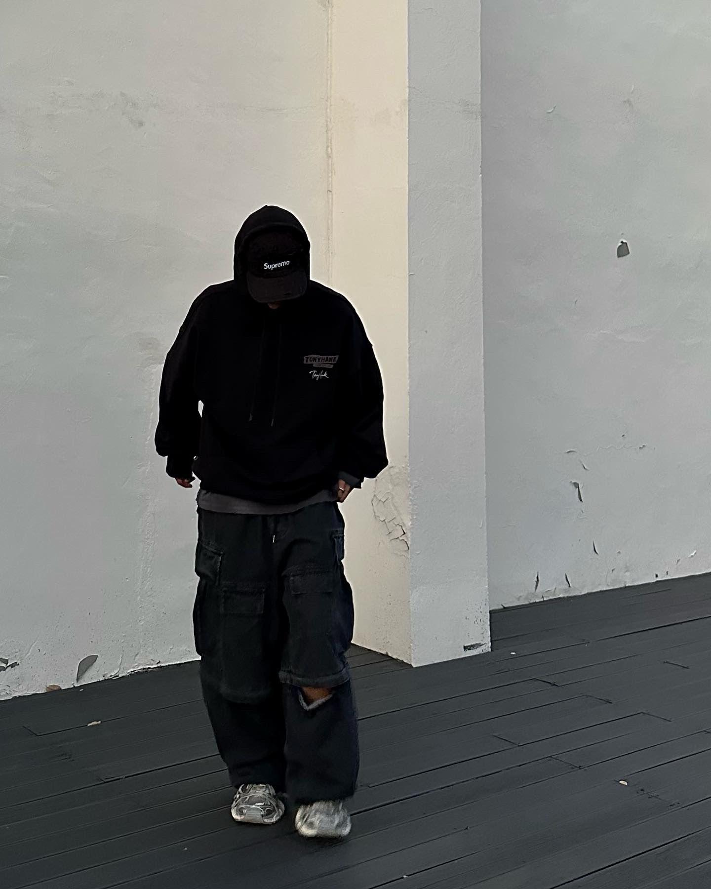 身高|体重:178 70 🧍♂️ 穿搭风格:街头时尚 🧢 帽子:Supreme黑色 👔 上衣:tony hawk_kr搭配深灰色T恤 👖 下装:某宝作旧工装裤 👟 鞋子:巴黎世家