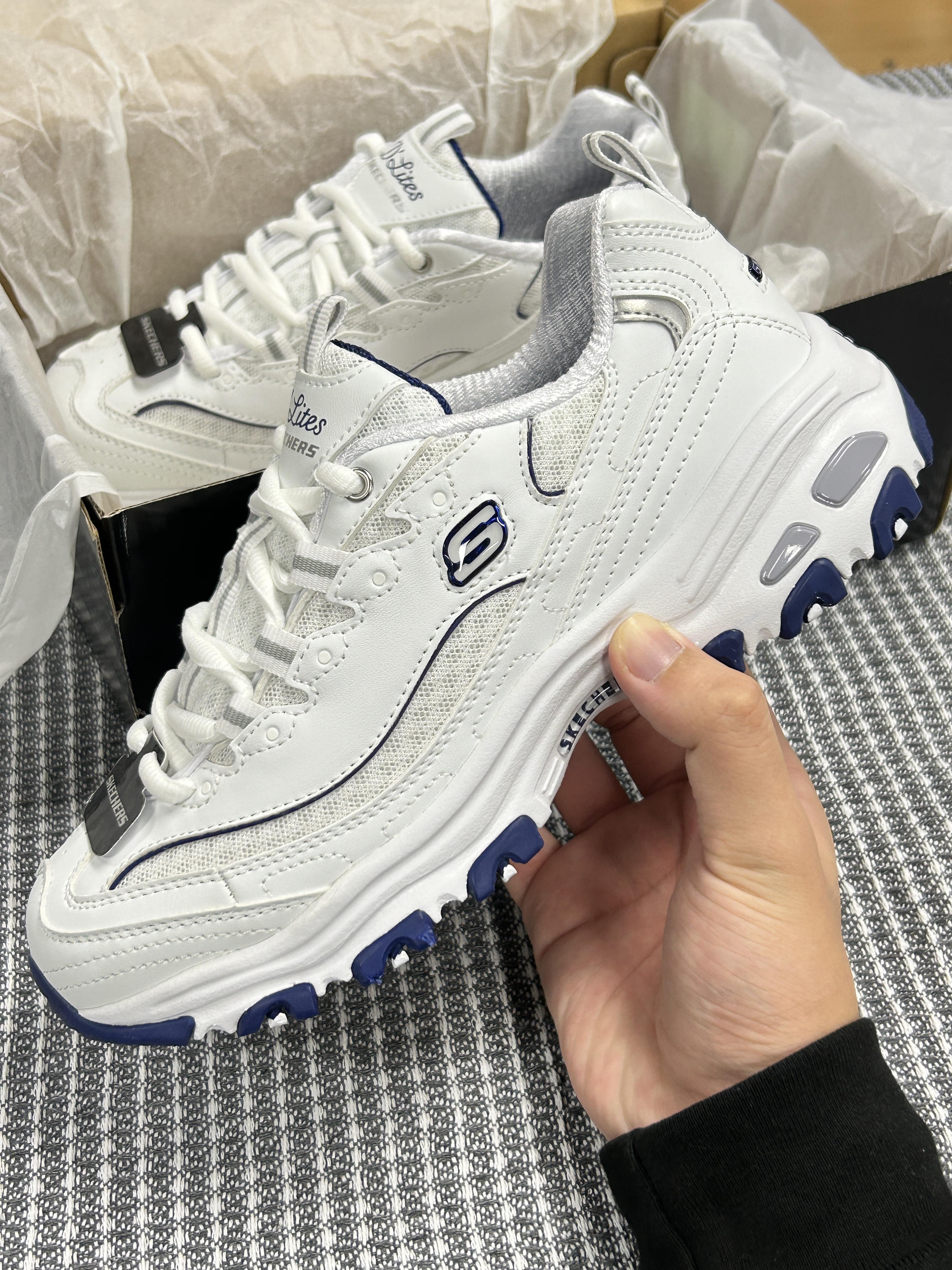 本篇笔记关联了Skechers/斯凯奇 D'Lites 1.0 奶茶熊 熊猫鞋 老爹鞋 闪穿鞋 厚底增高复古缓震百搭 低帮/女款/白色/海军蓝等商品,为用户提供真实的使用体验和购买参考。