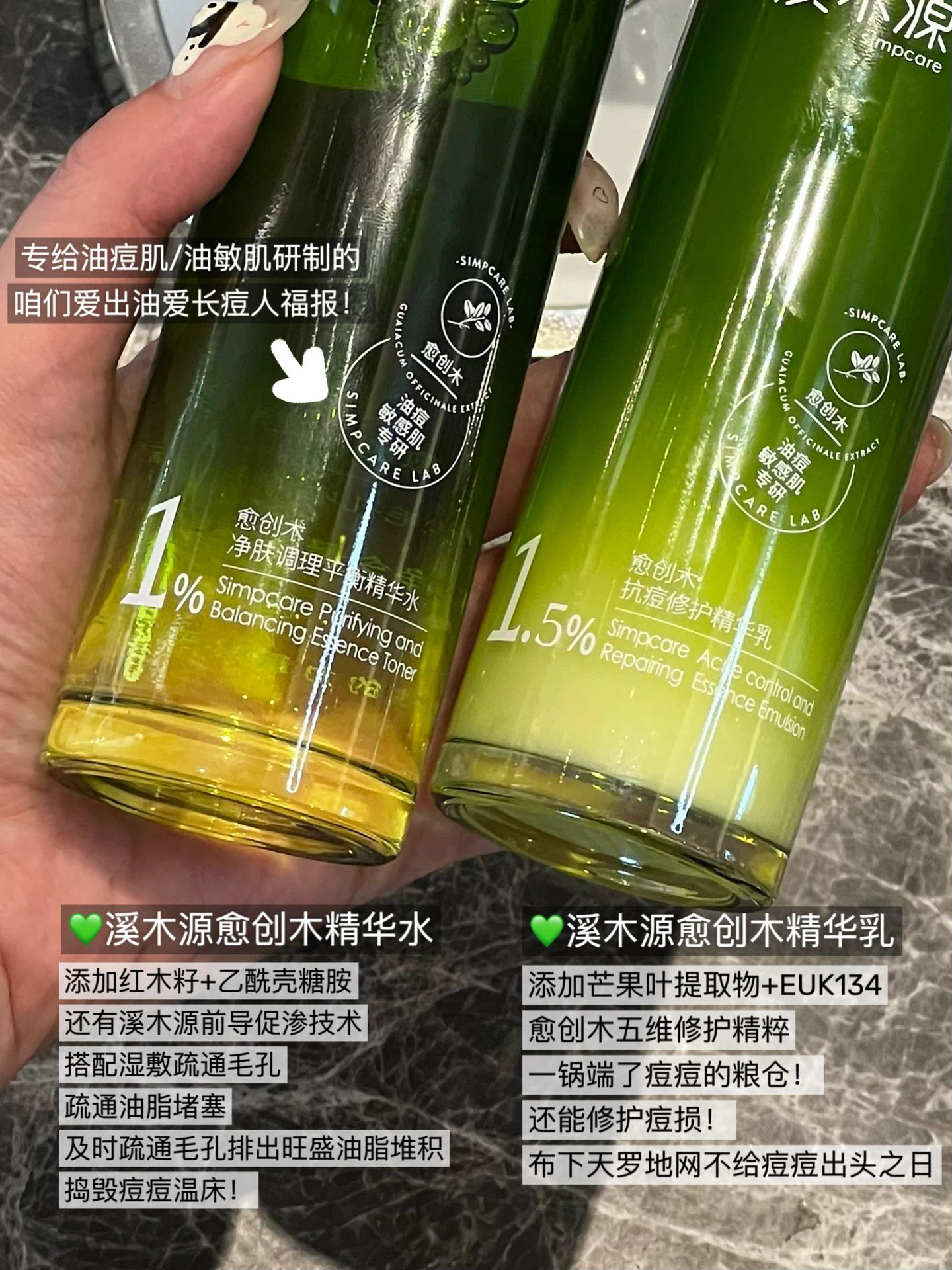 啊啊啊啊~我的心的创飞了!!! 终于找到找到了油痘肌的本命水乳!! 就是这套👉🏻溪木源愈创木水乳! 像我这种坐标广东 就算冬天不出油都能被‘热气’ 🔥或者火锅奶茶烧烤炸物熬夜等 创得大痘小痘满脸飞 反反复复长痘的敏皮只有它能懂我!!!! 看我现在皮肤真的没人知道我以前是个油痘肌! - 这套水乳主打就是无酸控痘!!! 因为反复长痘就是因为⬇️ 油脂堵塞提供痘痘温床和繁殖养料 我的用法是洗完脸用精华水...