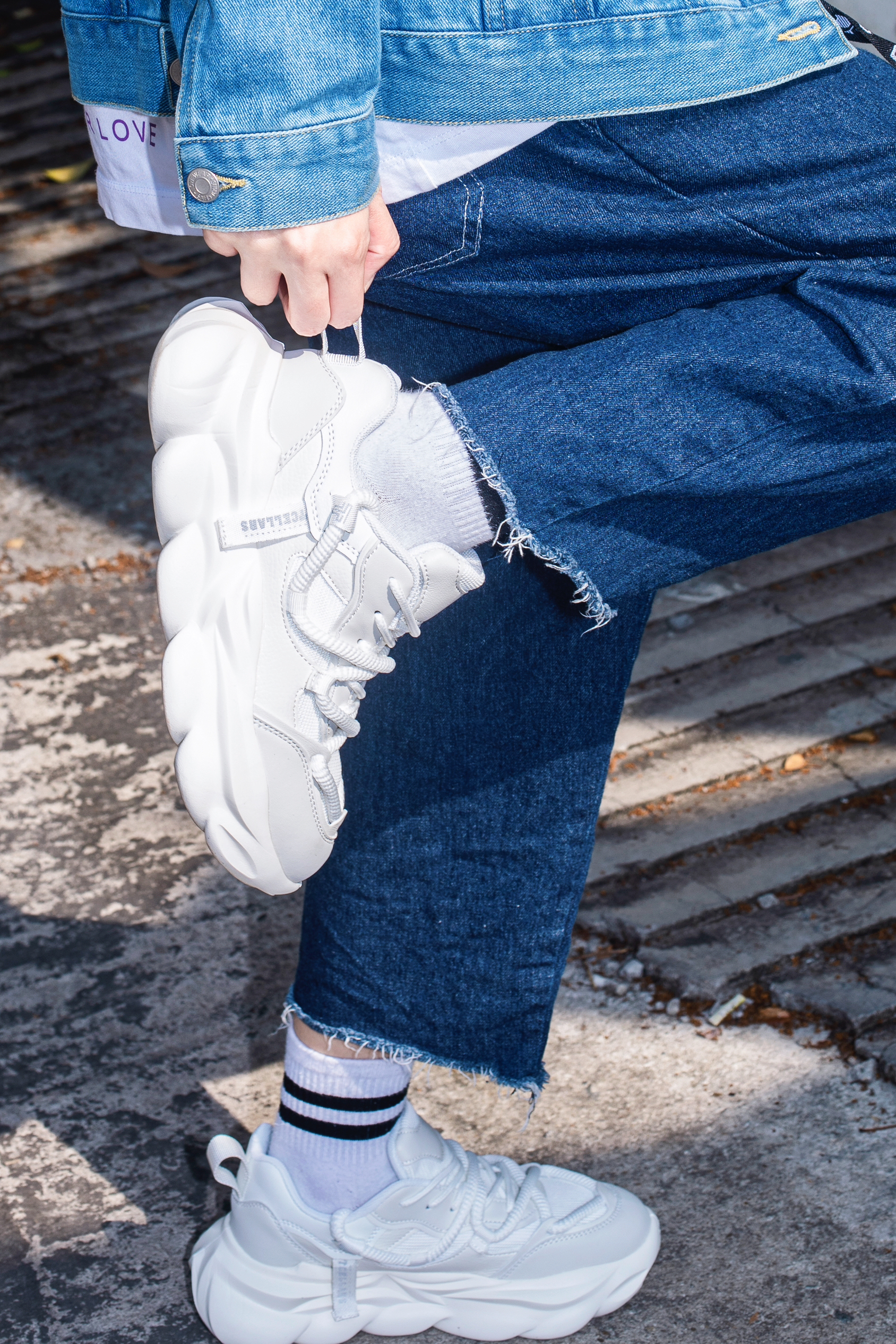 秋季穿搭单品少不了牛仔元素 今天分享一套自带少年感的牛仔穿搭 穿搭指南: 上身一件白色基础T恤打底 外搭一件浅蓝色牛仔外套 下身一条深蓝色工装牛仔裤 上脚一双Tcellars新款老爹鞋 全白配色百搭又很清爽 厚鞋底让脚感很舒适 还能隐形增高 双携带鞋带的设计细节满满 再用一顶浅蓝色的棒球帽小呼应一下 整套蓝色系不同色调搭配好有活力