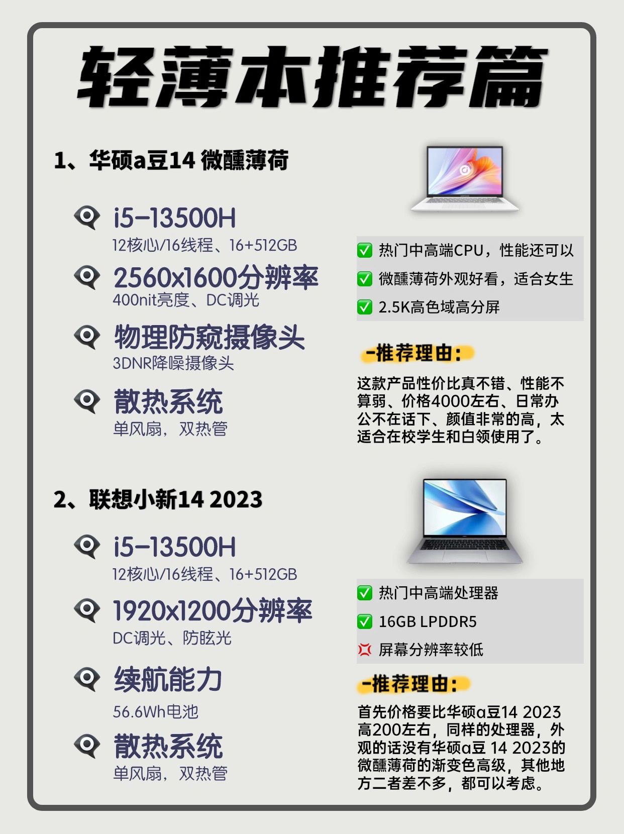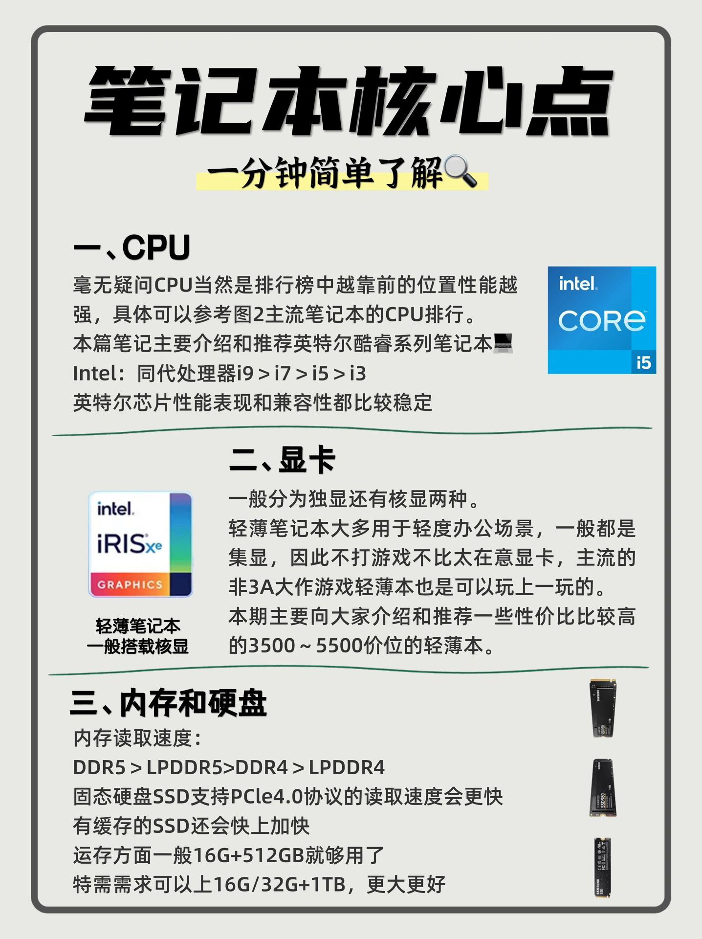 很快就要迎来双十一,刚刚步入大学生活的大学生们想必还有不少人在等着大促换新电脑,本篇笔记将从六个方面总结:回答大家最想知道的几个问题以及如何选择一台适合自己的轻薄笔记本! 1、 CPU(intel酷睿)、显卡、内存和硬盘 毫无疑问CPU当然是排行榜中越靠前的位置性能越强,具体可以参考图2主流轻薄笔记本的CPU排行。 轻薄笔记本大多用于轻度办公场景,一般都是集显,因此不打游戏不比太在意显卡,主流的非...
