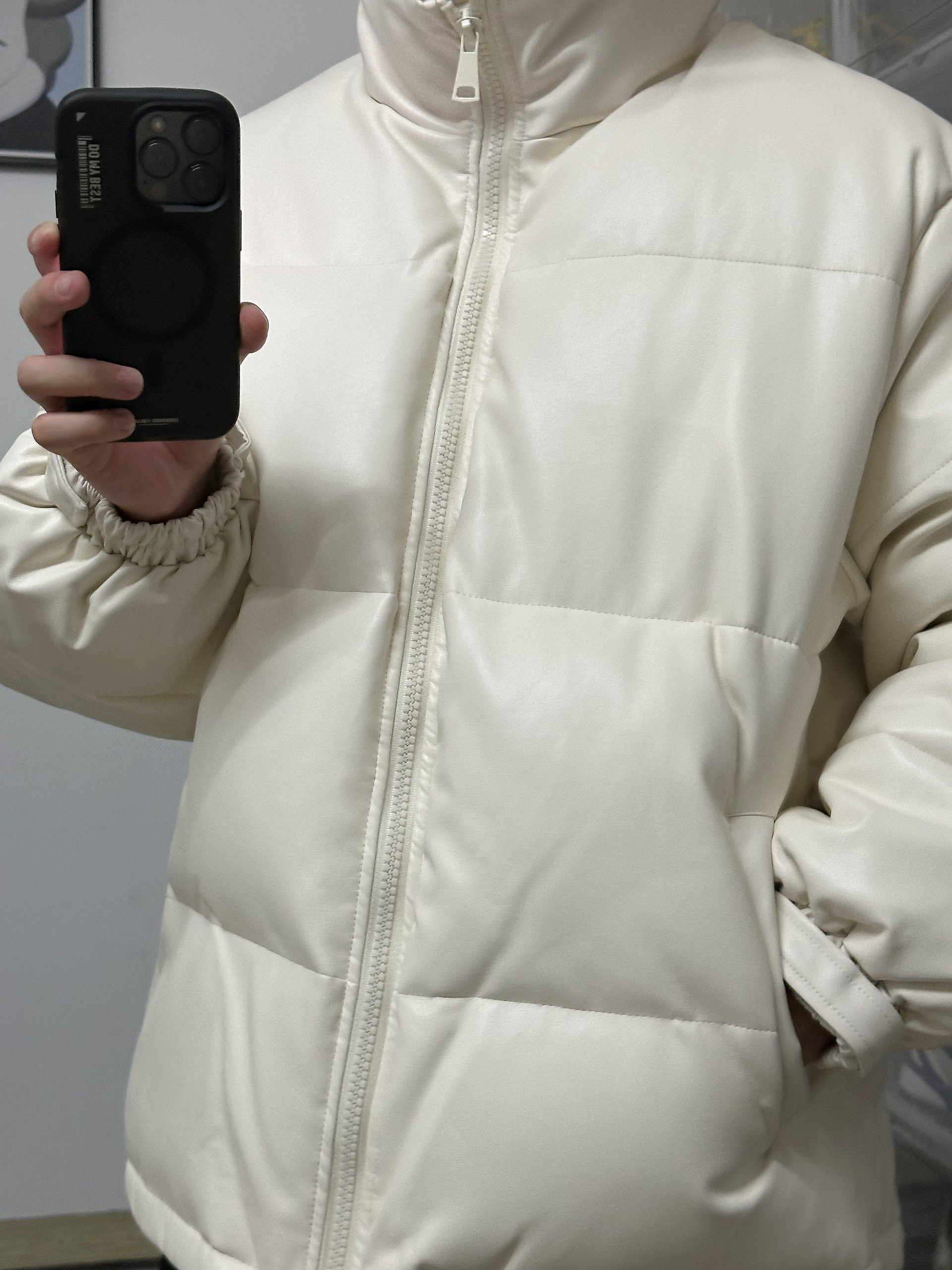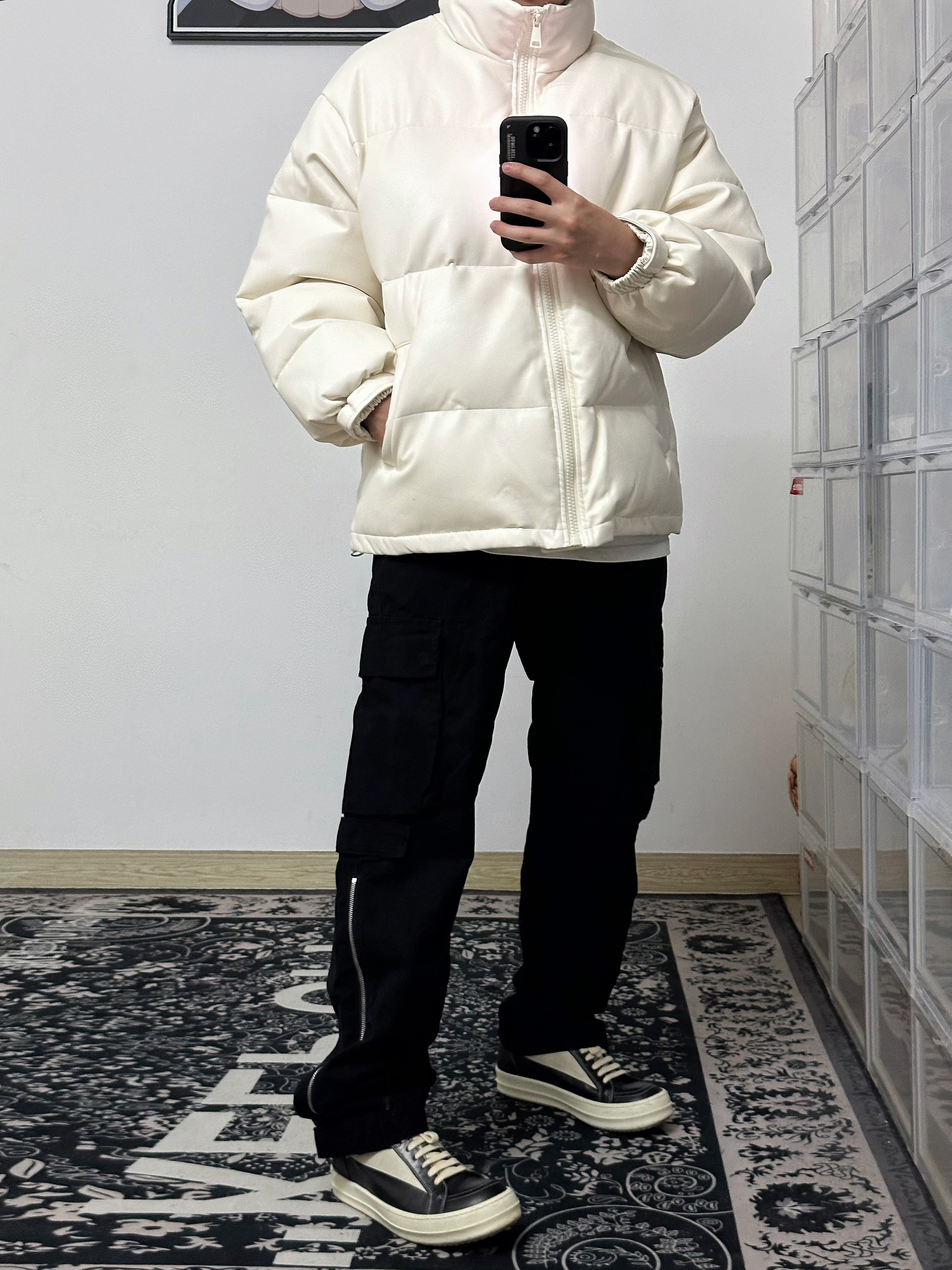 身高|体重:175|120 🧍♂️ 穿搭风格:白色羽绒服的干净搭配 👔 上衣:选择白色pu皮羽绒服 👖 下装:选择黑色拉链工装裤 👟 鞋子:rick owens