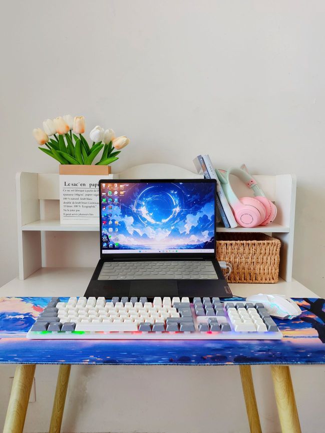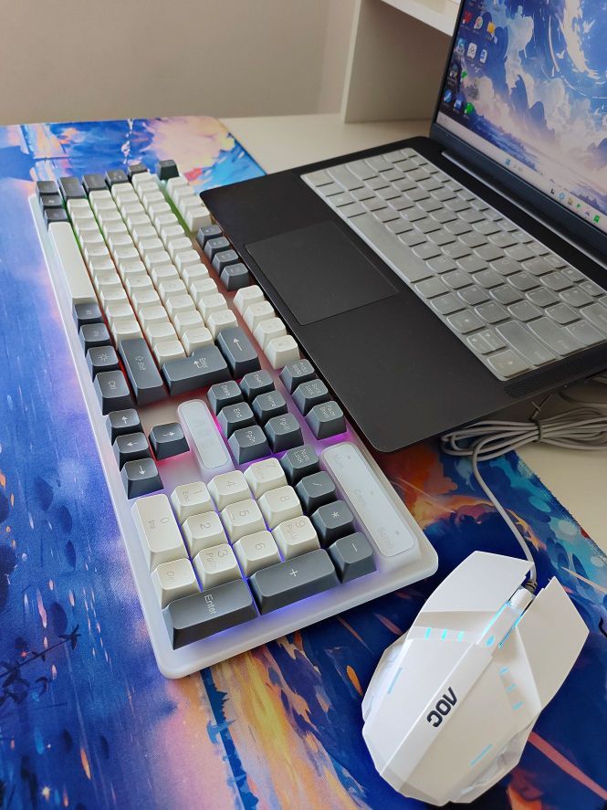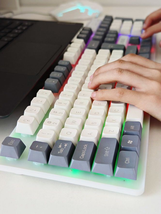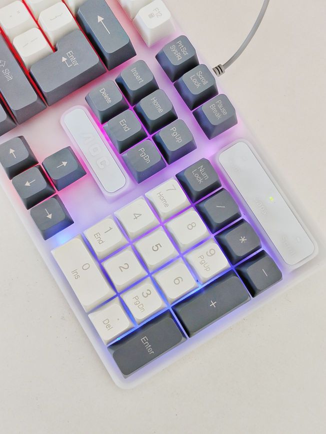 高级简约的灰白色键帽,办公格调满满~ 多种呼吸灯可调控,炫酷电竞风还不晃眼~ 按键很灵敏,反应很快,按起来很轻松不费力,键盘本身重量也很足,很有质感,日常办公、玩游戏什么都很丝滑~ 打字也很舒服,一整天使用下来不累手~ 使用它真的幸福感满满,码字都很治愈,而且百元不到,性价比很高~