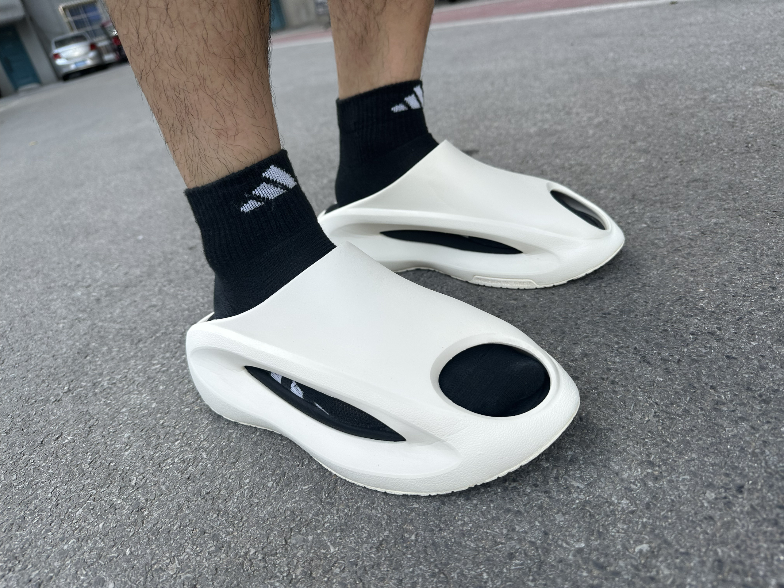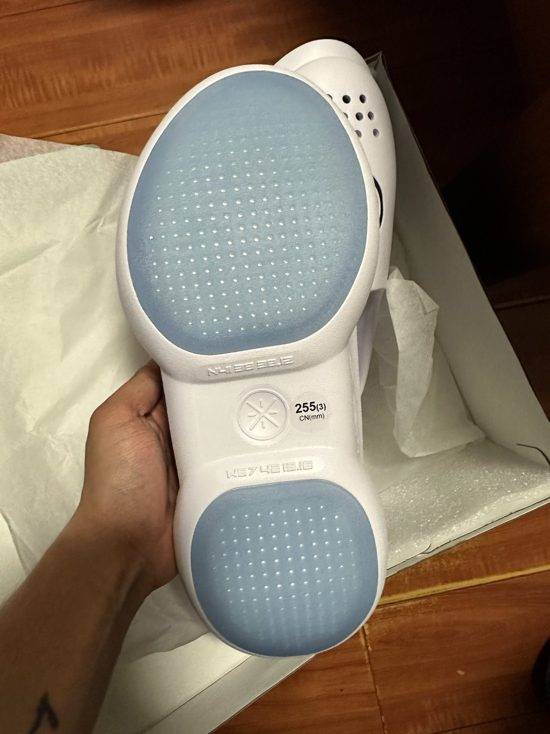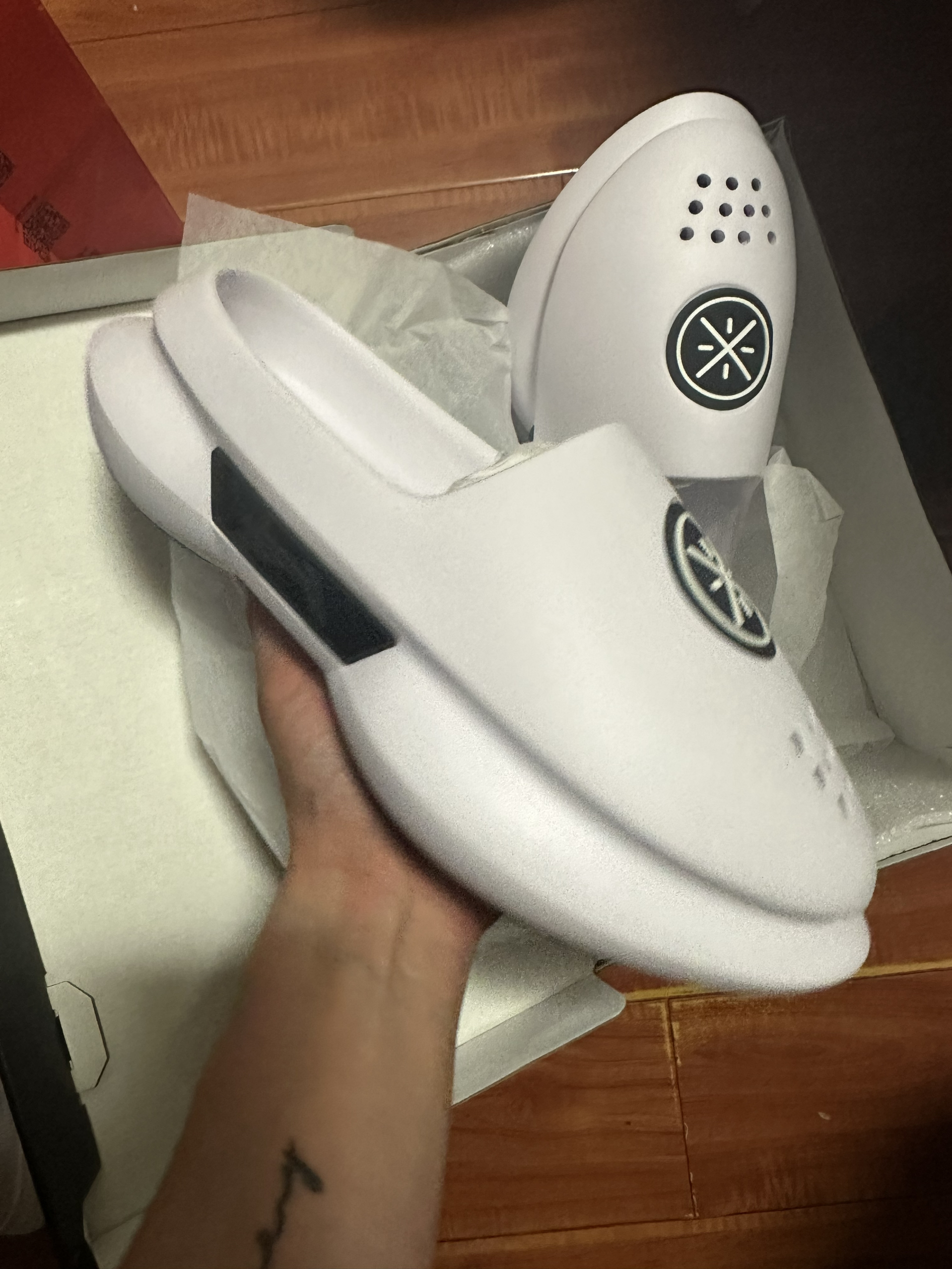 很早之前就看设计师已经曝光除了和韦德之道7宣告配色一样灵感的运动拖鞋,当时就心动了。昨天去线下篮球主场店逛的时候,居然在店里看到已经上架了,立马!毫不犹豫拿下!发售价299,比云游便宜,毕竟什么科技也没有(鞋盒上就是EVA),但是后跟却有䨻的标志,不知道到底有没有内嵌。在我看来它比云游更加夸张,但同时也更加精致。