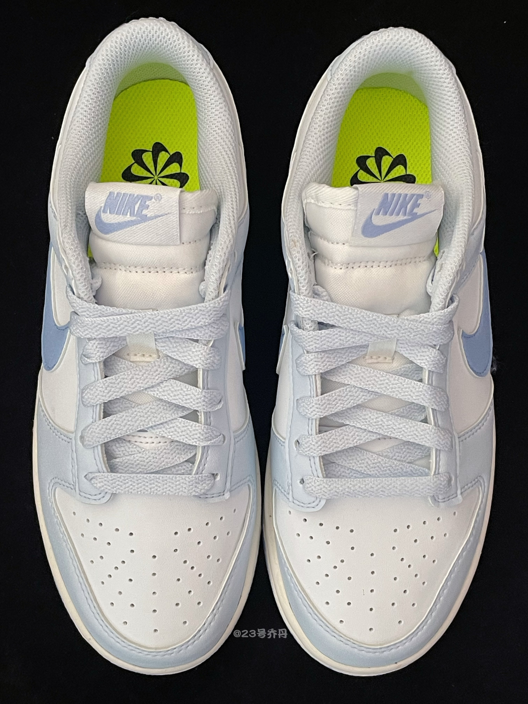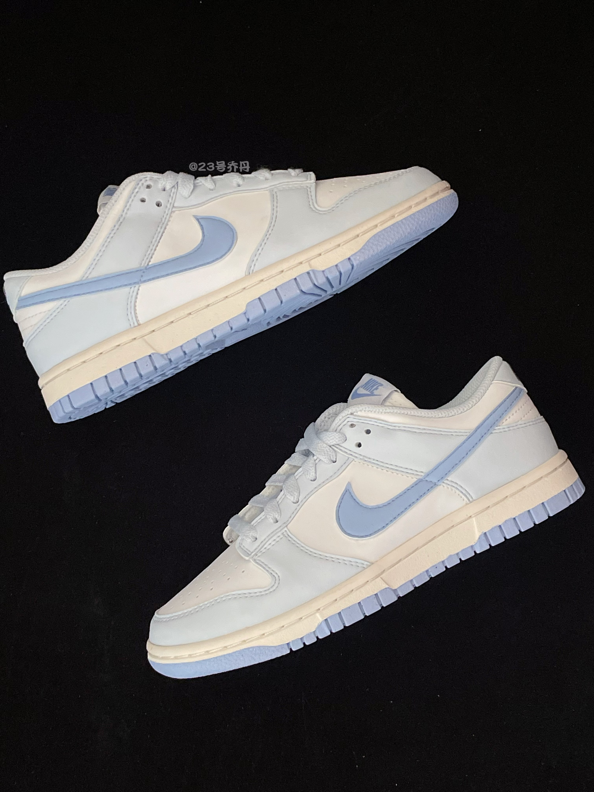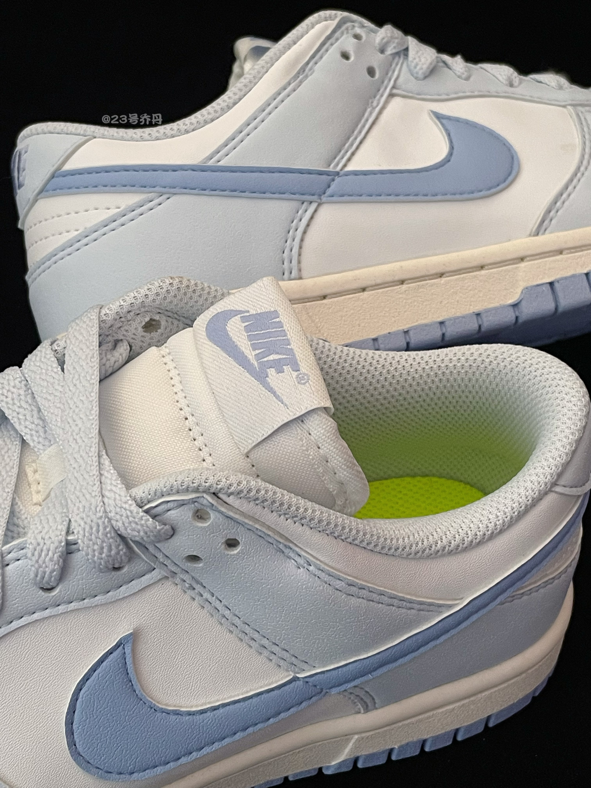 今天给大家分享这双近期发售的 Nike Dunk Low『Blue Tint』蓝白板鞋 整双鞋采用了白色/雾霾蓝/紫蓝色等搭配 鞋面选用了易于打理的光滑皮革材质 鞋头密集的透气孔保证了良好的透气性 鞋舌与鞋尾均设计有刺绣的品牌Logo图案 米白色的中底和紫蓝色的橡胶大底收尾 并且均使用了可回收环保♻️材料 整体来说这是一双颜值相当不错的板鞋👟 配色清爽 时尚百搭 适合日常休闲或通勤 ⚠️尺码方面建...