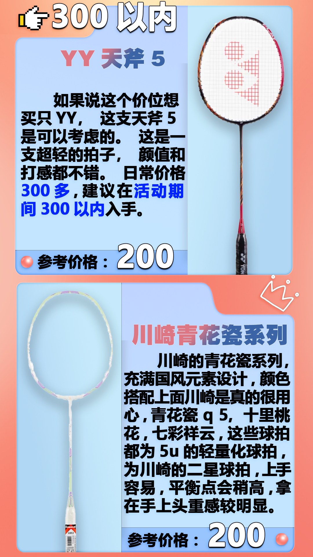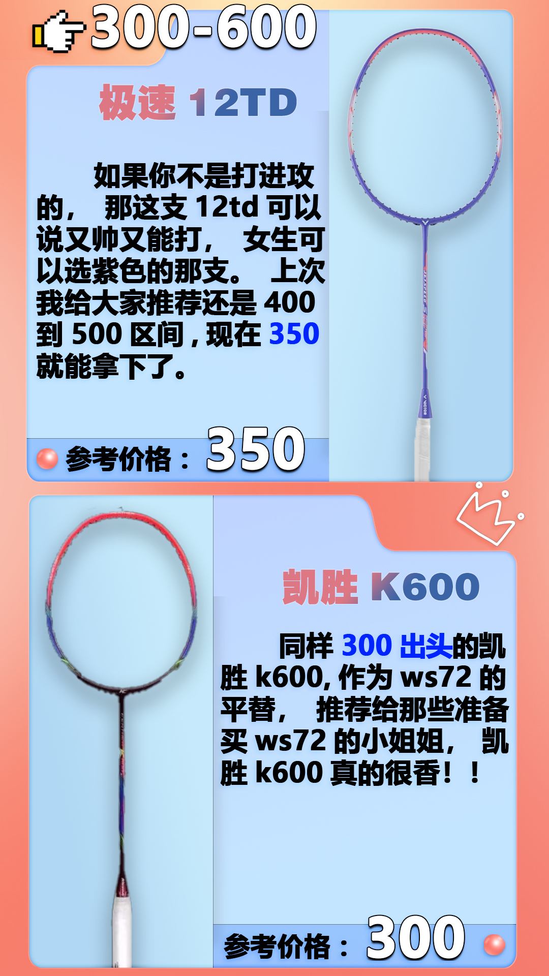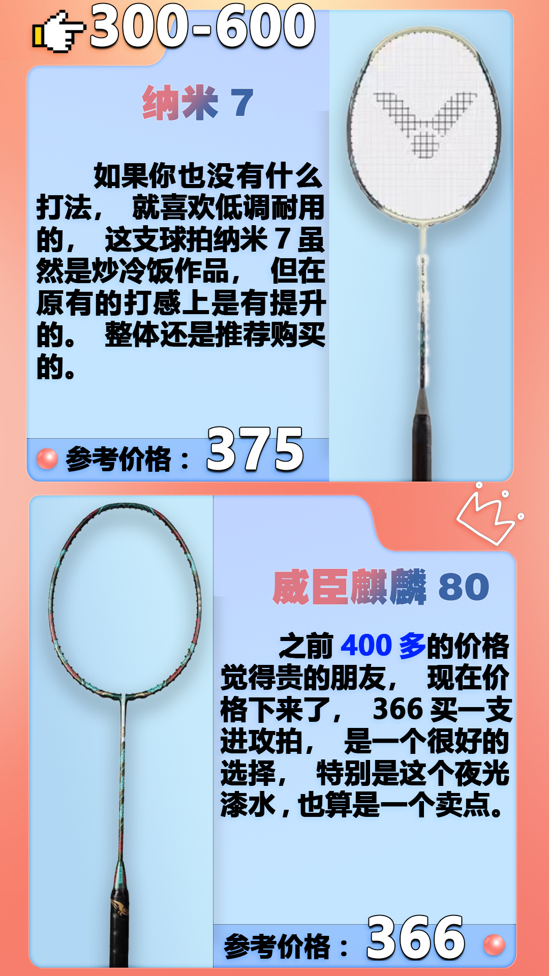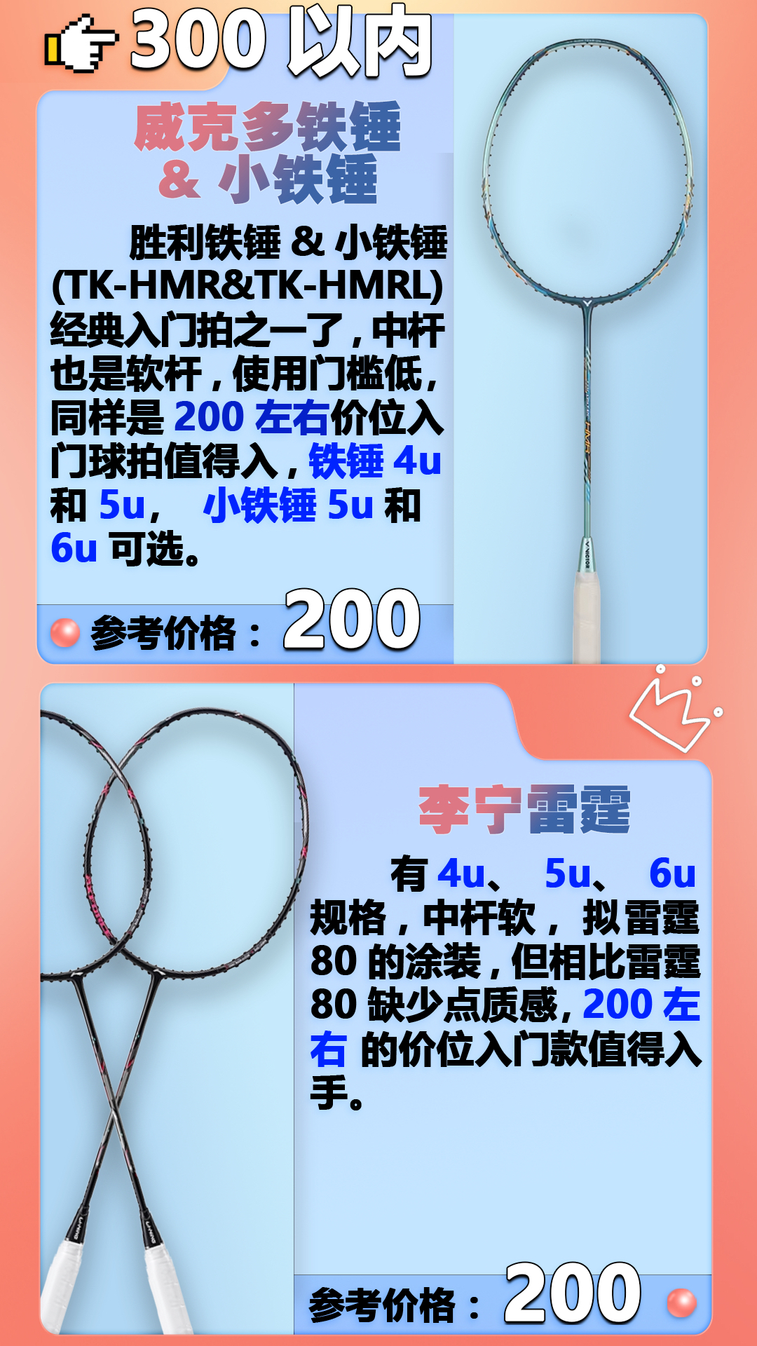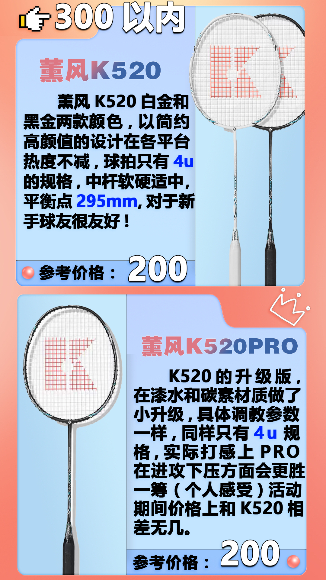 🏸️薰风K520 薰风K520白金和黑金两款颜色,以简约高颜值的设计在各平台热度不减,球拍只有4u的规格,中杆软硬适中, 平衡点295mm,对于新手球友很友好! 🏸️薰风K520PRO K520的升级版,在漆水和碳素材质做了小升级,具体调教参数一样,同样只有4u规格,实际打感上PRO在进攻下压方面会更胜一筹 (个人感受)活动 期间价格上和K520相差无几。 🏸️威克多铁锤&小铁锤 胜利铁锤&小...