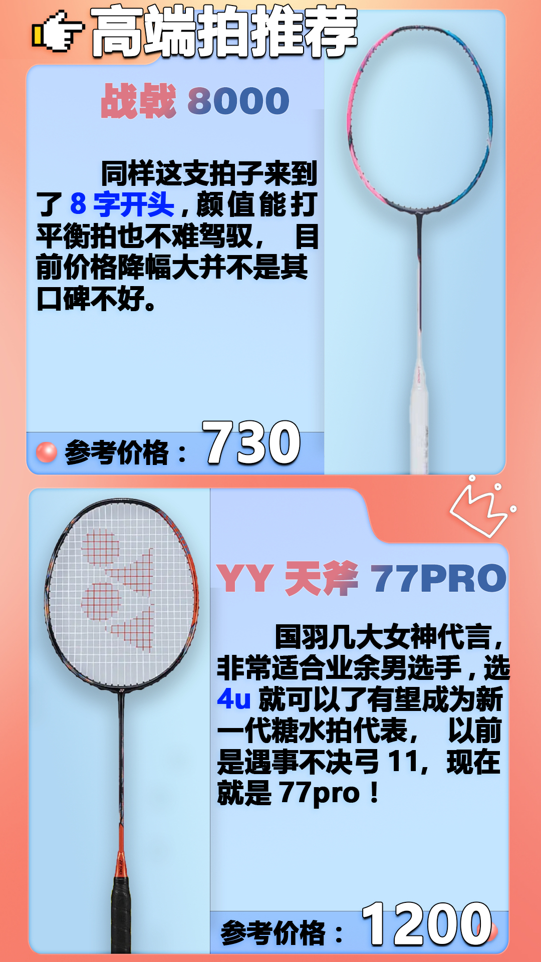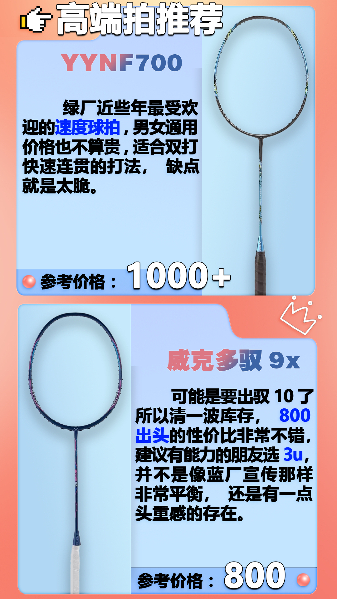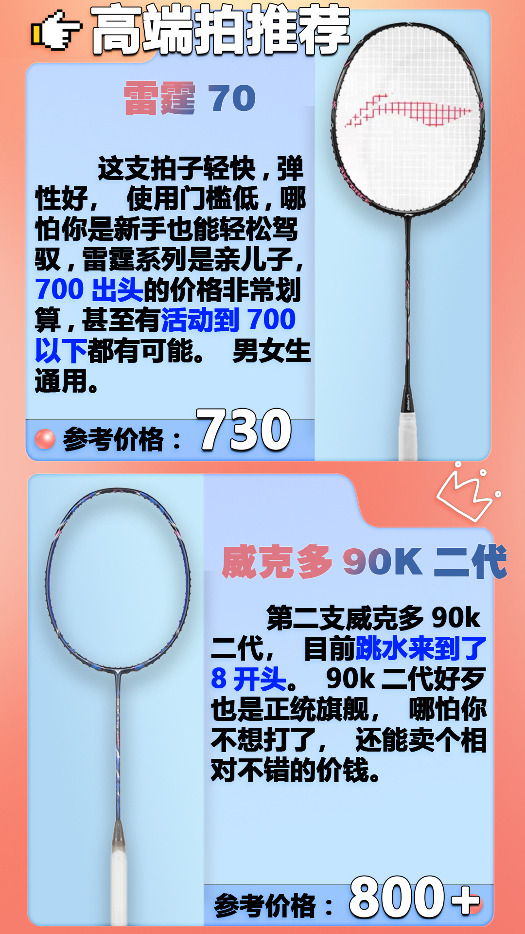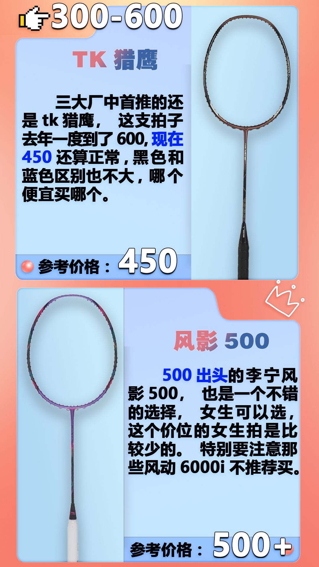 🏸️TK猎鹰 三大厂中首推的还是tk猎鹰,这支拍子去年一度到了600,现在💰450还算正常,黑色和蓝色区别也不大,哪个便宜买哪个。 🏸️风影500 💰500出头的李宁风影500,也是一个不错的选择,女生可以选,这个价位的女生拍是比较少的。特别要注意那些风动6000i不推荐买 🏸️雷霆70 这支拍子轻快,弹性好,使用门槛低,哪怕你是新手也能轻松驾驭,雷霆系列是亲儿子,💰700出头的价格非常划算,...