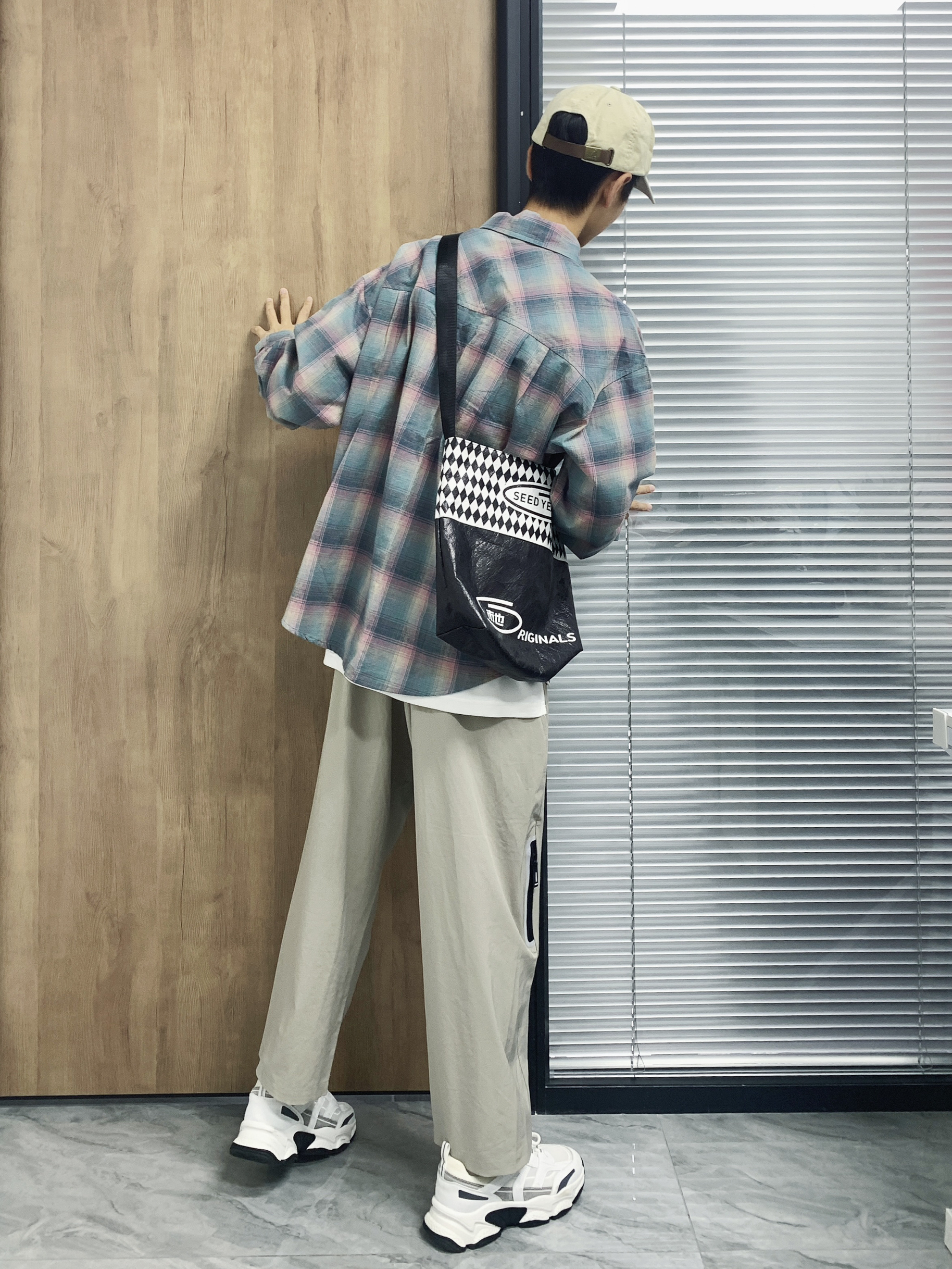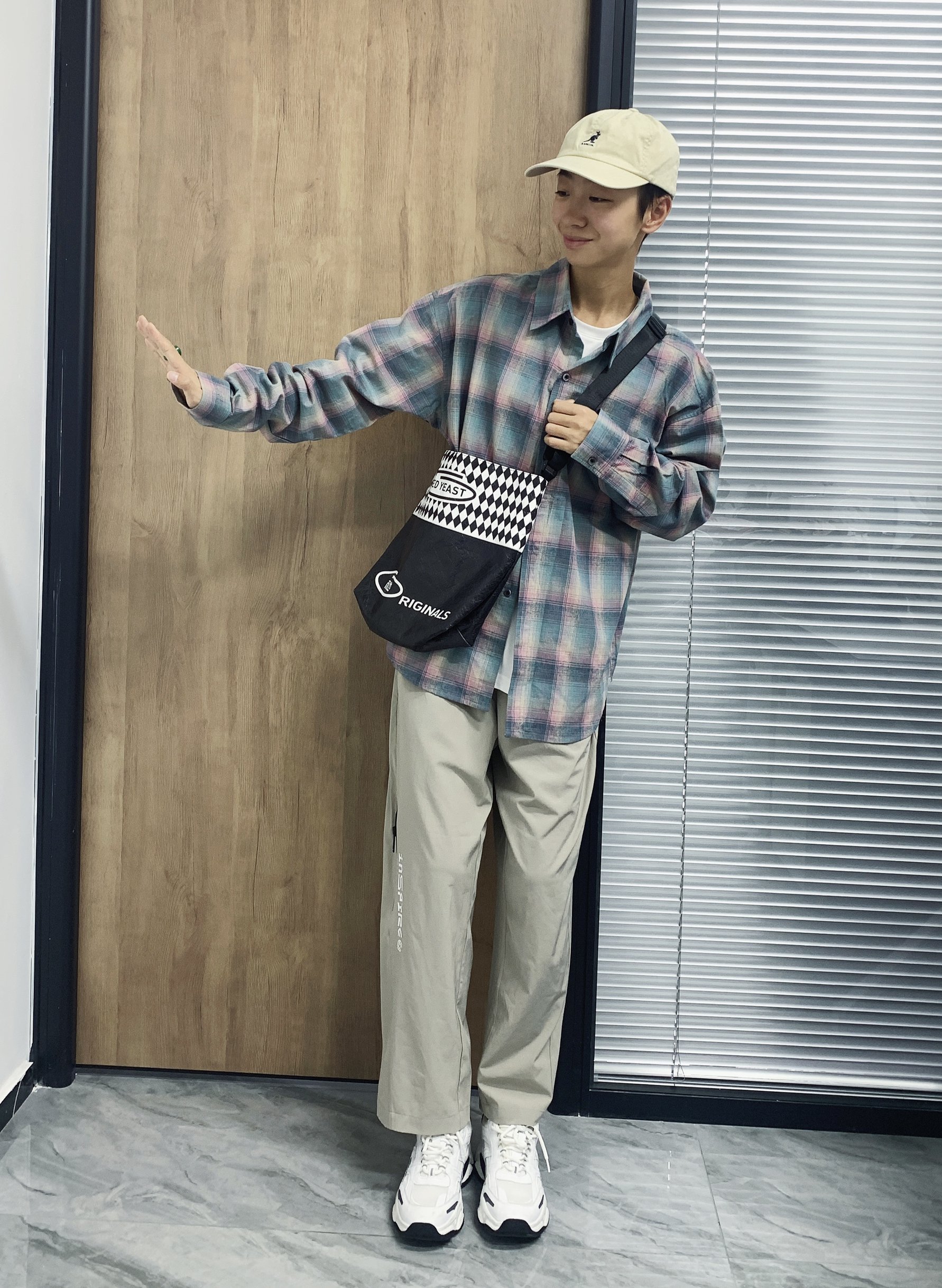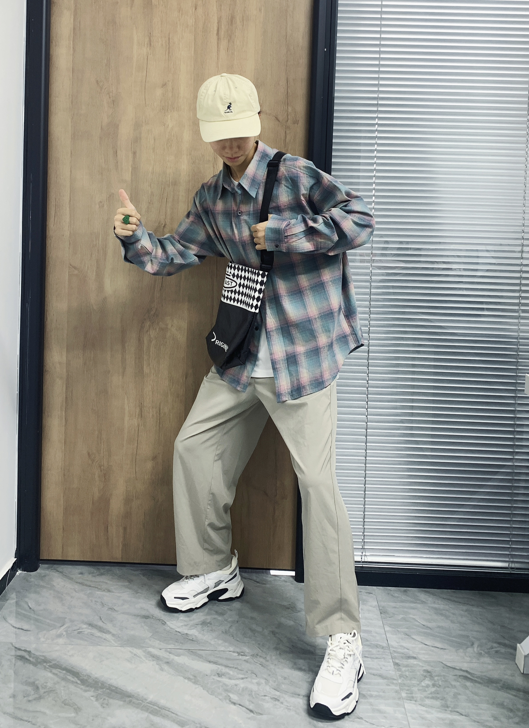 168CM|45KG|👔:M|👟:39码 5G入秋🍂,格子衬衫秋天太需要咯呀🎊 这款垂感满满的宝藏浅色系运动裤,好苏胡!!!版型设计我超喜欢,关键还百搭! 配上德训鞋👟,这一整套穿搭,简单舒适,我爱啦~