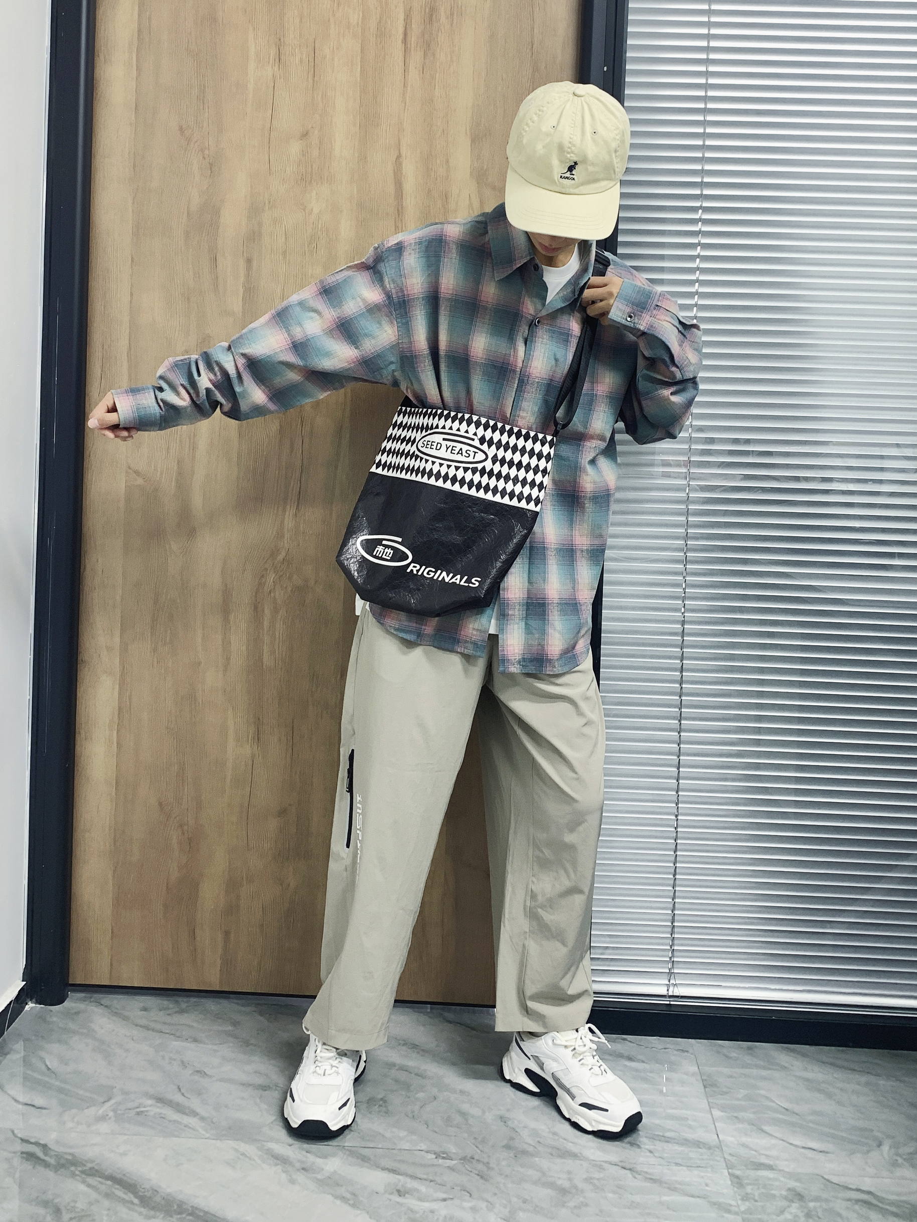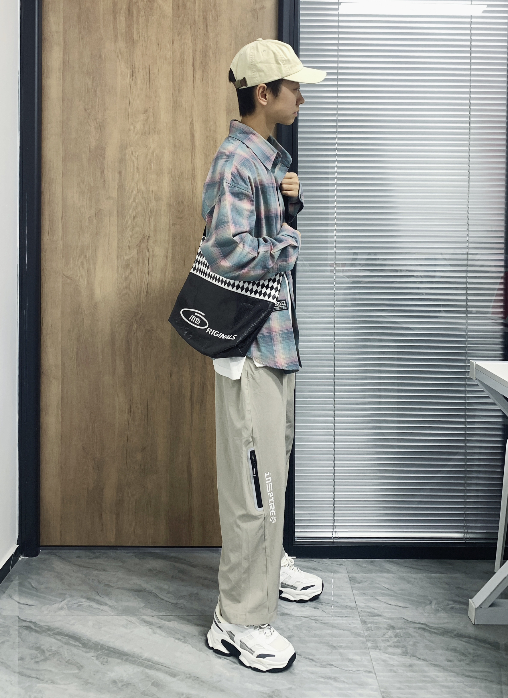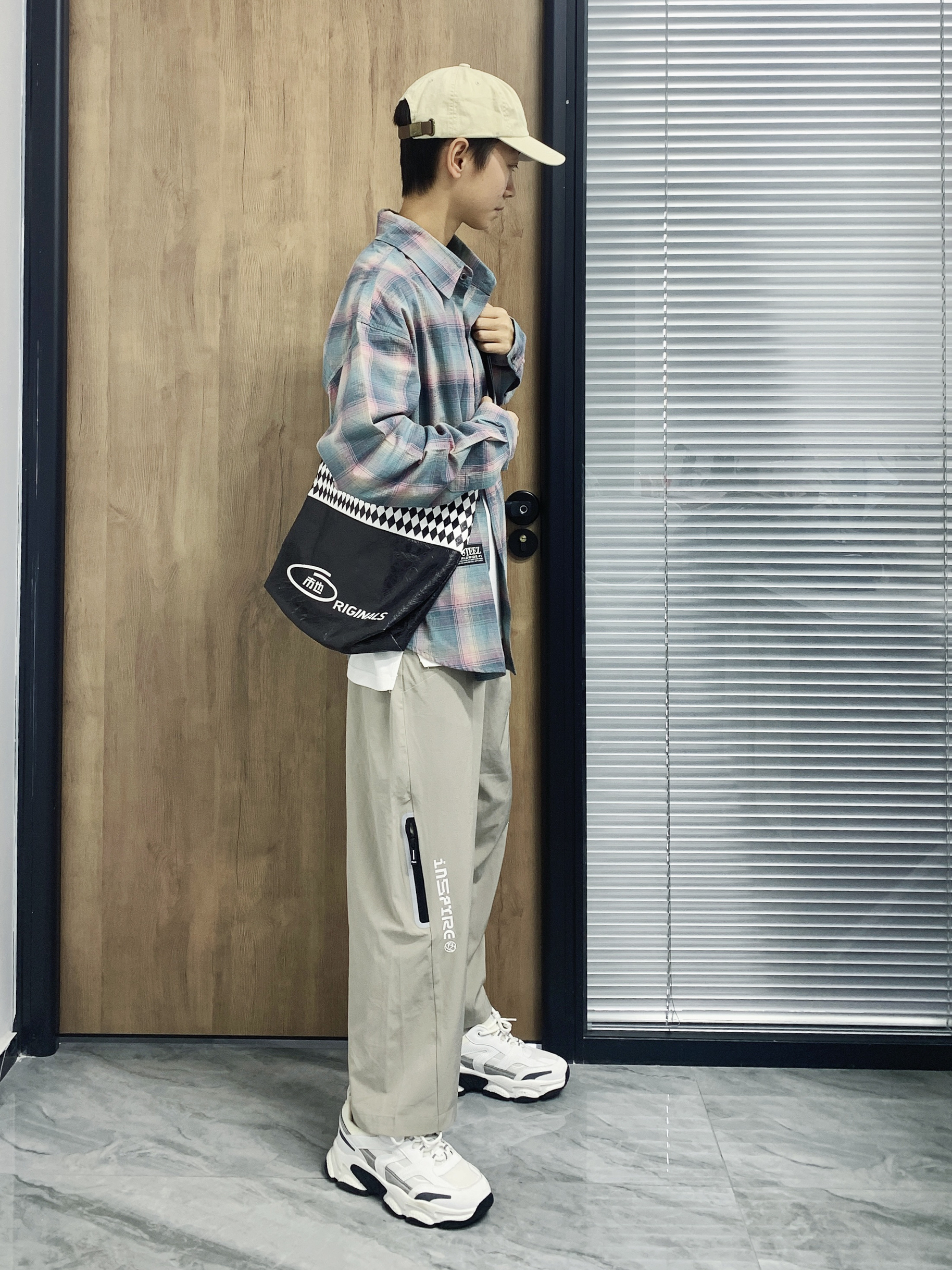 168CM|45KG|👔:M|👟:39码 5G入秋🍂,格子衬衫秋天太需要咯呀🎊 这款垂感满满的宝藏浅色系运动裤,好苏胡!!!版型设计我超喜欢,关键还百搭! 配上德训鞋👟,这一整套穿搭,简单舒适,我爱啦~