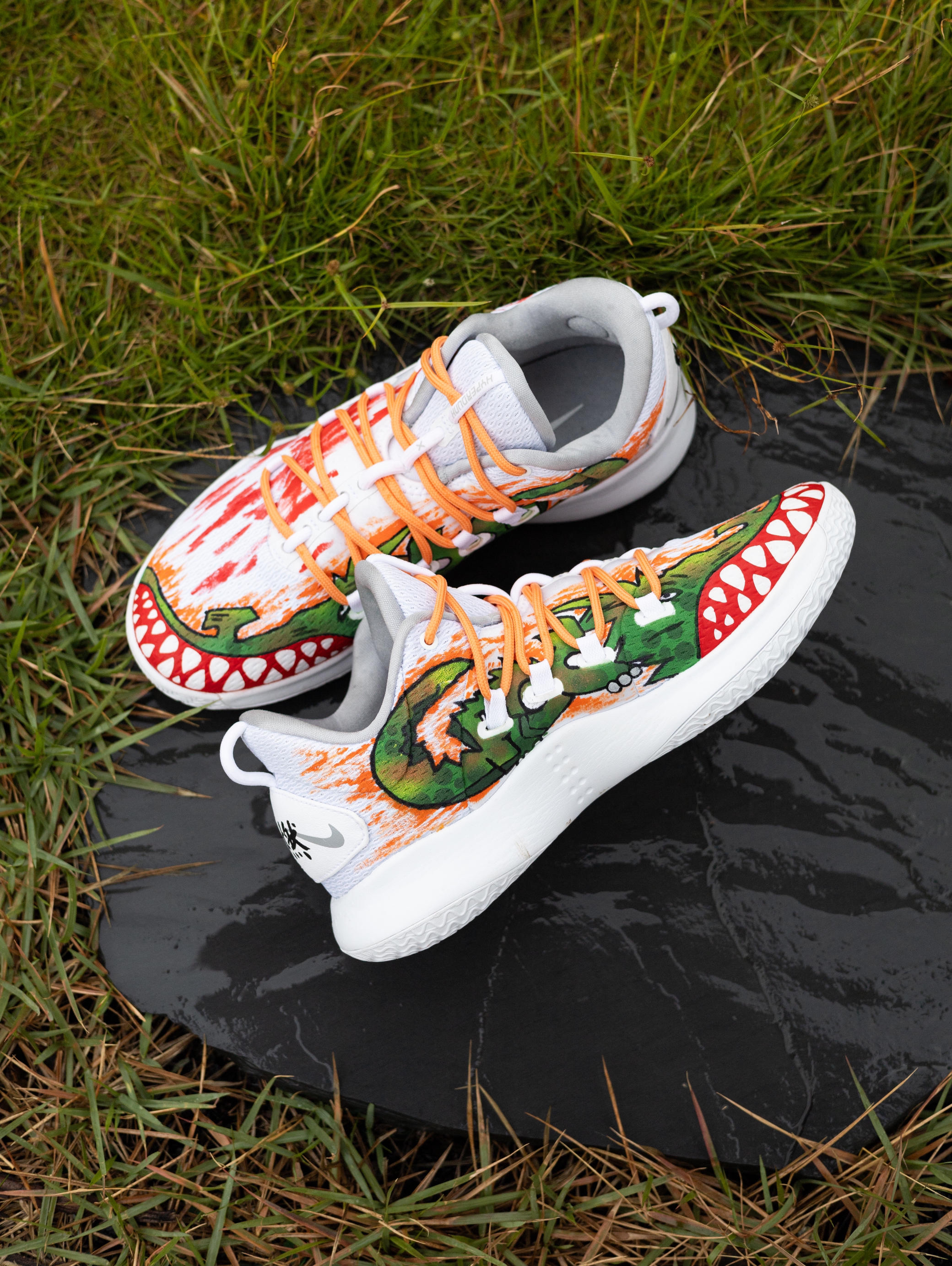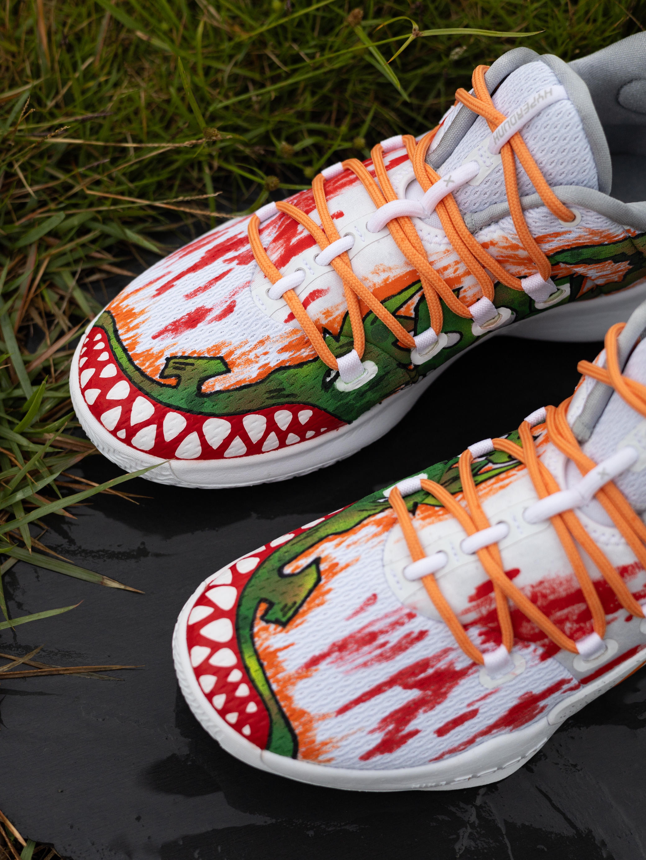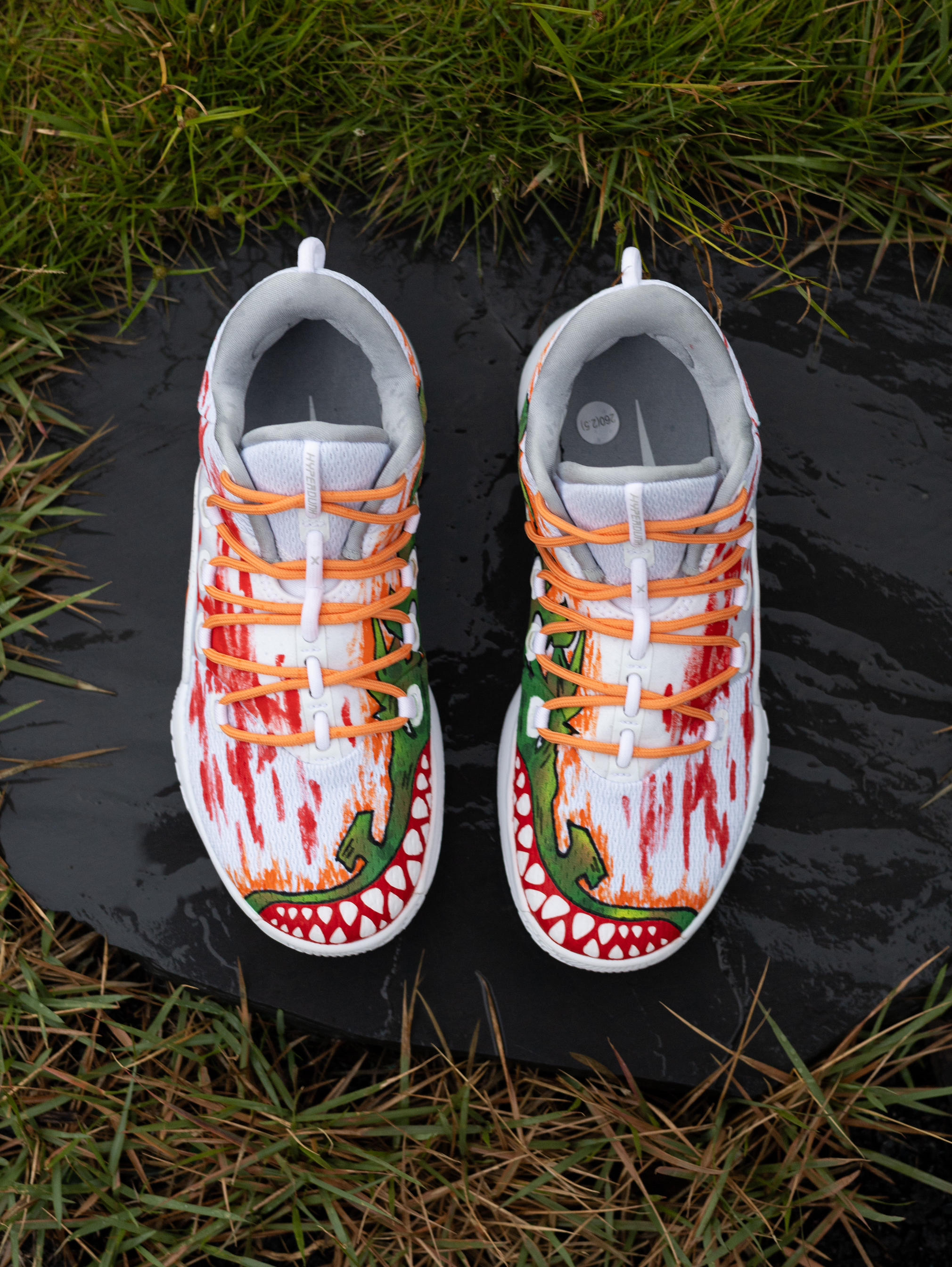今天给大家分享一双超酷的篮球🏀实战鞋👟 Nike Hyperdunk X Low 10涂鸦『白橙』配色 鞋款以Hyperdunk X Low10『纯白』为模版 采用了美式涂鸦元素作为设计灵感 鞋身内侧绘有凶猛的大鳄鱼🐊 鞋头呈现有鳄鱼🐊血盆大口的牙齿🦷设计 鞋身外侧则进行了红色涂鸦渲染 有种血染的感觉 鞋面选用了织物+棉布的拼接 鞋头则为热贴设计 不仅透气性良好 强度和韧性也都到位 鞋带系统运用了...