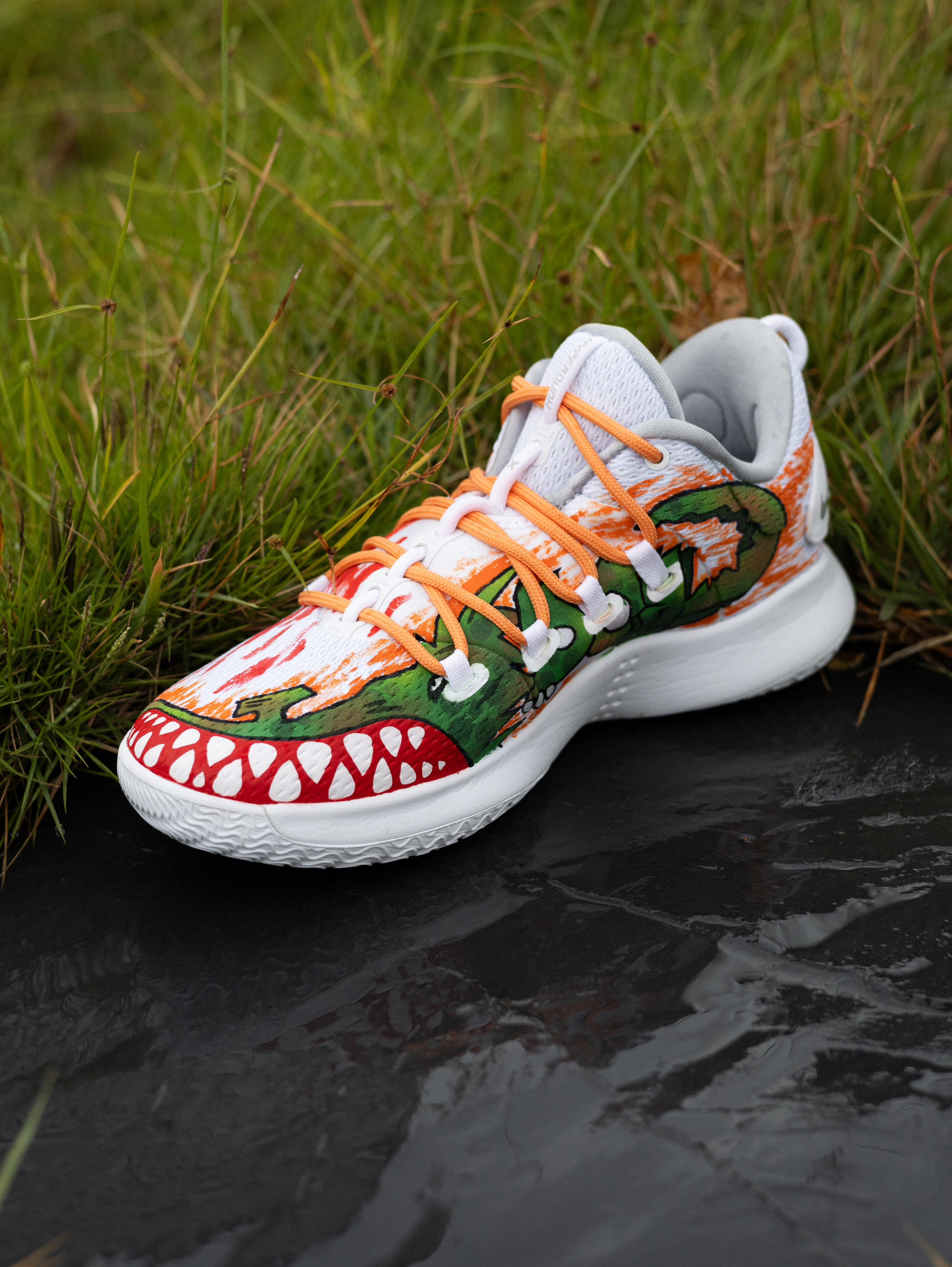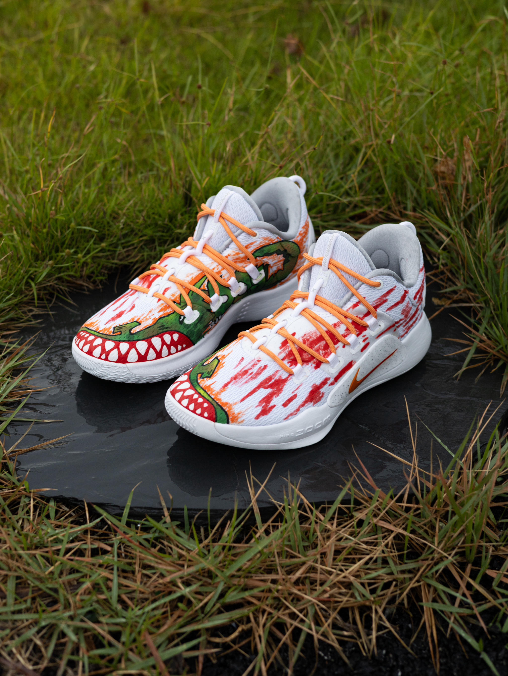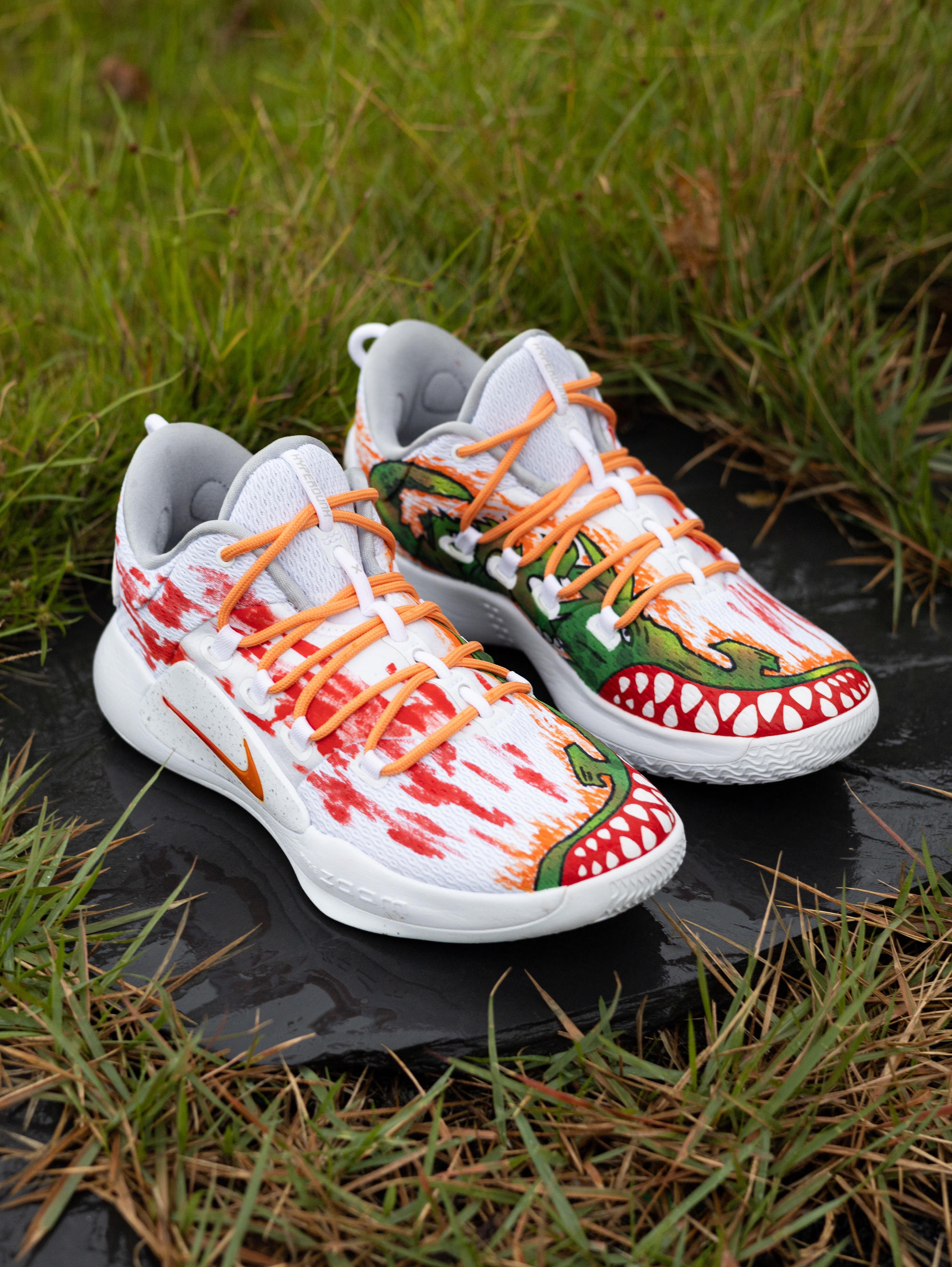 今天给大家分享一双超酷的篮球🏀实战鞋👟 Nike Hyperdunk X Low 10涂鸦『白橙』配色 鞋款以Hyperdunk X Low10『纯白』为模版 采用了美式涂鸦元素作为设计灵感 鞋身内侧绘有凶猛的大鳄鱼🐊 鞋头呈现有鳄鱼🐊血盆大口的牙齿🦷设计 鞋身外侧则进行了红色涂鸦渲染 有种血染的感觉 鞋面选用了织物+棉布的拼接 鞋头则为热贴设计 不仅透气性良好 强度和韧性也都到位 鞋带系统运用了...