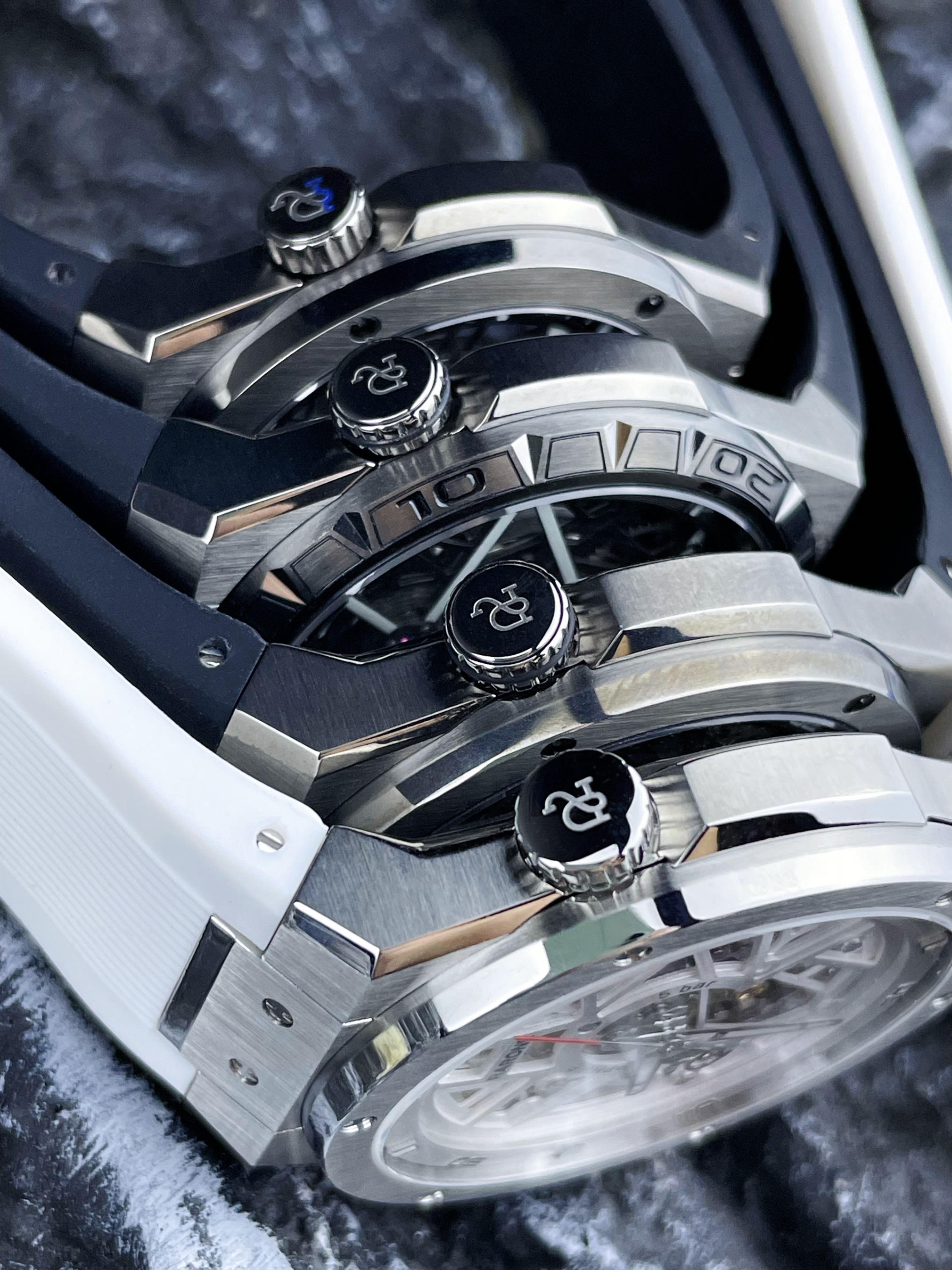 今天给大家分享四块很酷帅的RARONE雷诺腕表⌚️ 🌟『双子星』黑色&白色 表款为双子星系列中最为经典的款式 表盘上叠加的五角星⭐️设计极具辨识度 黑色和白色款亦🉑️搭配情侣👫款 🌟『双子星』X&Y X款&Y款最有特色的是非常通透的表盘设计 白色部分很有彗星☄️划过天际的感觉 而Y款还加入了计时表圈 更有运动感 整体来说这是四...